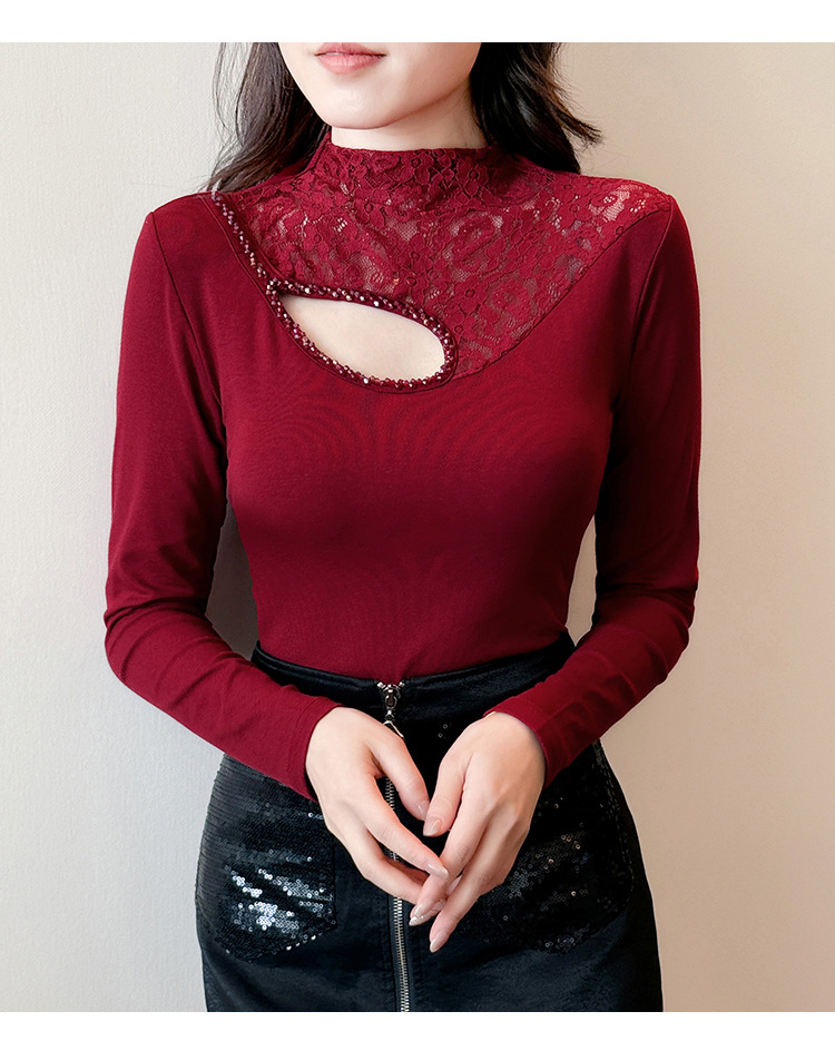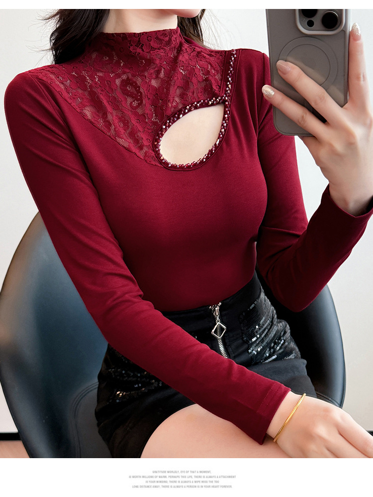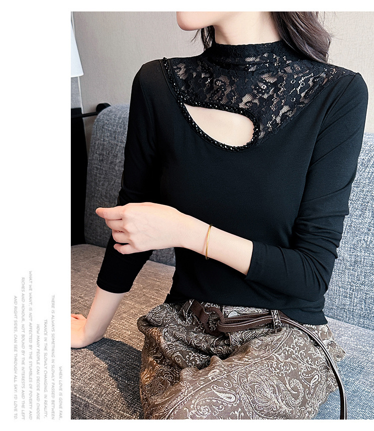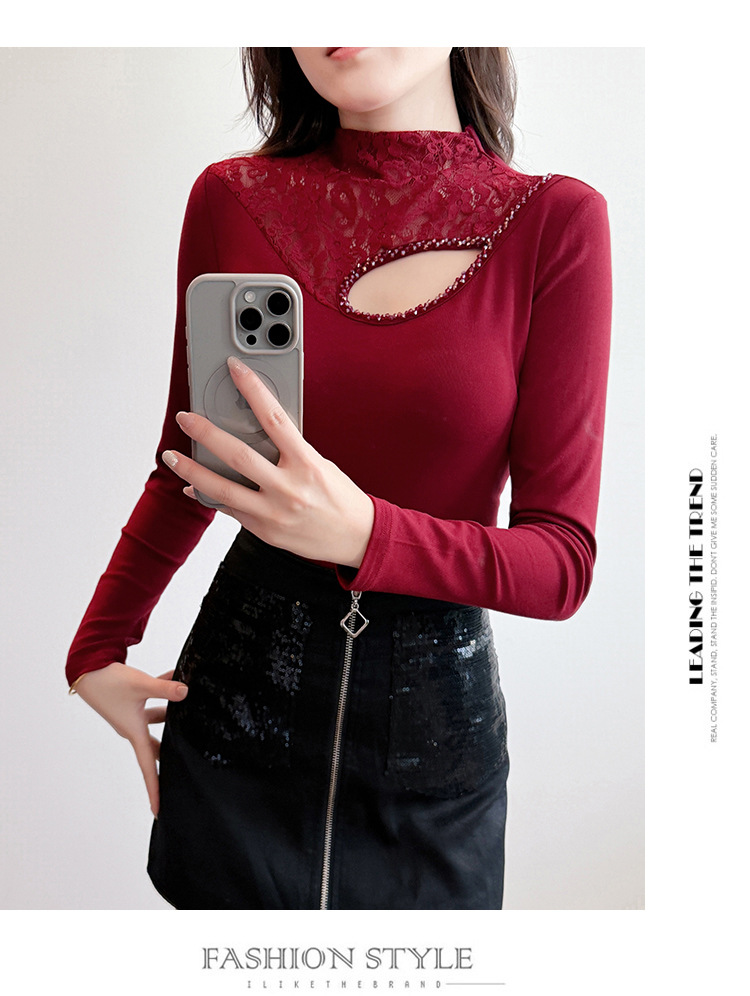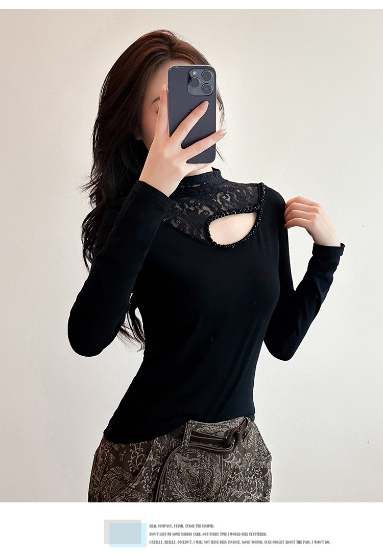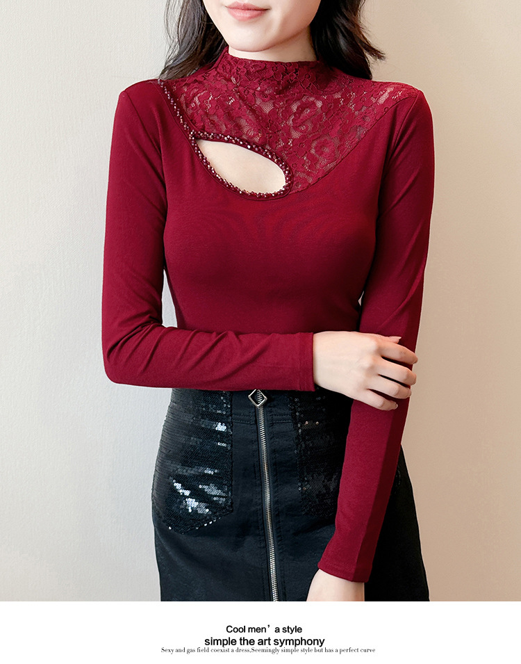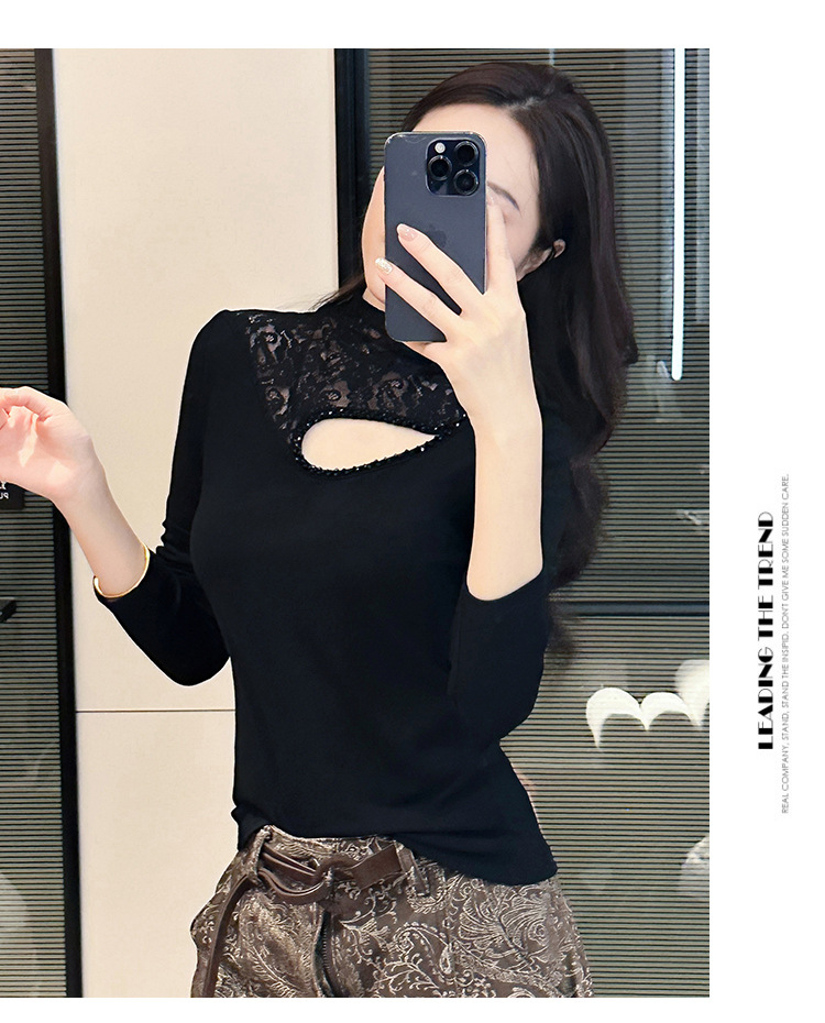 KQL 359H8362加厚磨毛蕾丝拼接半高领长袖订珠t恤修身打底衫