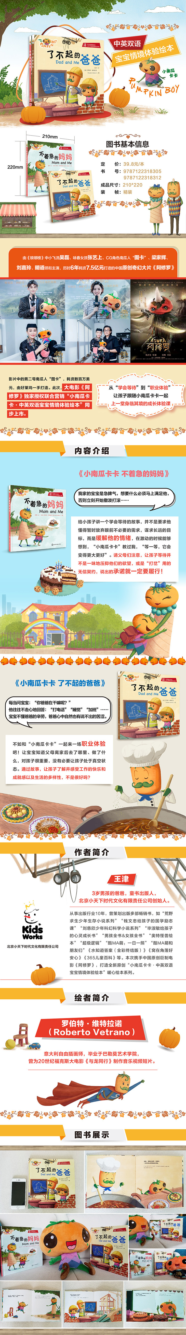 王津,3岁男孩的爸爸,童书出版人,北京小天下时代文化有限责任公司创始人。从事出版行业10年,曾策划出版多部畅销书,如“荒野求生少年生存小说系列”“钱文忠给孩子的国学励志课”“刘慈欣少年科幻科学小说系列”“毕淑敏给孩子的心灵成长书”“男孩全书&女孩全书”“奥特怪兽绘本”“超级逻辑”“酷MA萌:一日一熊”“酷MA萌和朋友们”《水知道答案(全彩终结版)》《窝在角落好安心》《365儿童百科》等。本次携手中国原创巨制电影《阿修罗》,打造全新原创“小南瓜卡卡·中英双语宝宝情境体验绘本”暖心绘本系列。