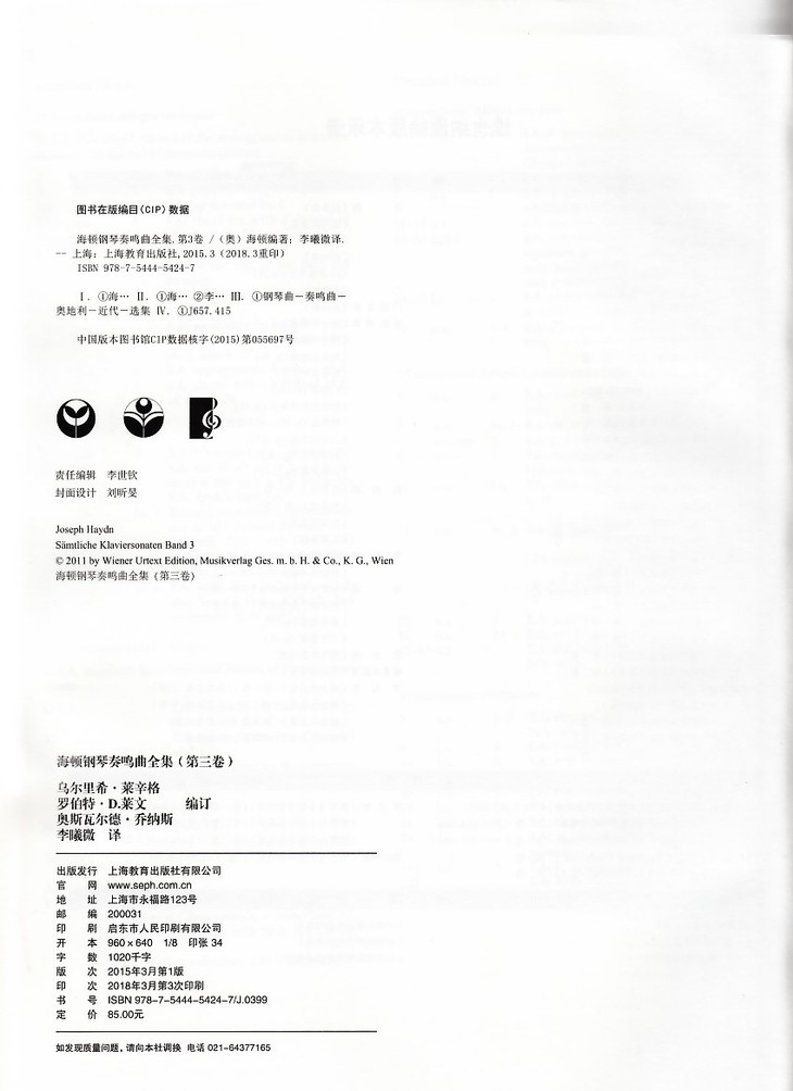 《海顿钢琴奏鸣曲全集(第三卷 中外文对照)》为海顿创作的著名钢琴乐谱,均为中外文对照,为专业学习钢琴演奏的常选乐谱。此次翻译引进的是维也纳原始出版社出版的净版本乐谱。译者为著名的音乐学者,通晓多种外语,包括英语、法语、德语等,是翻译该版本的合适人选。