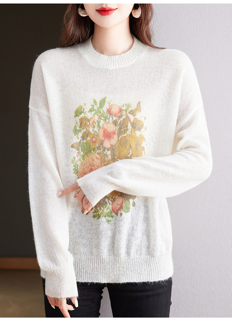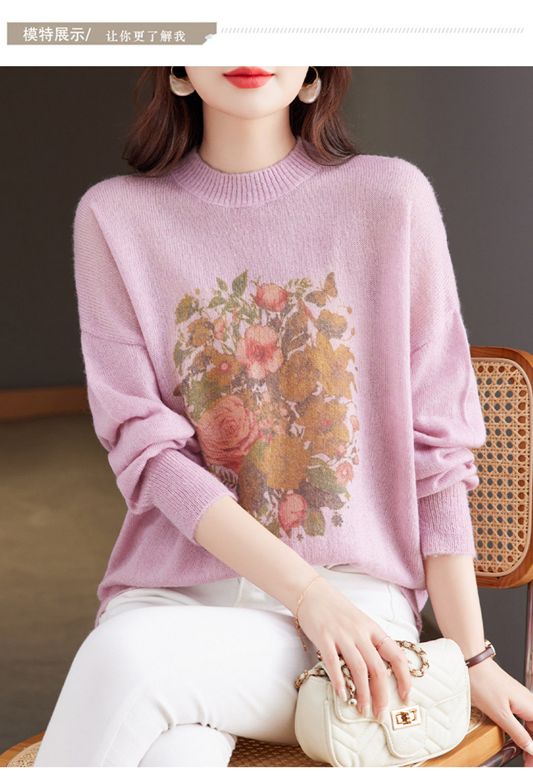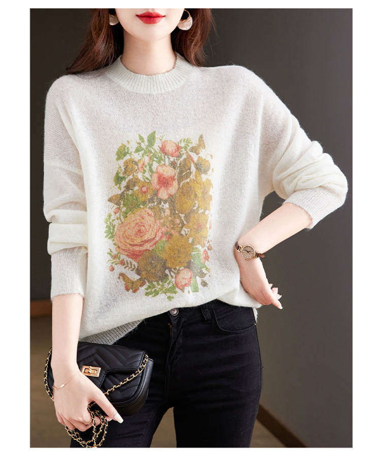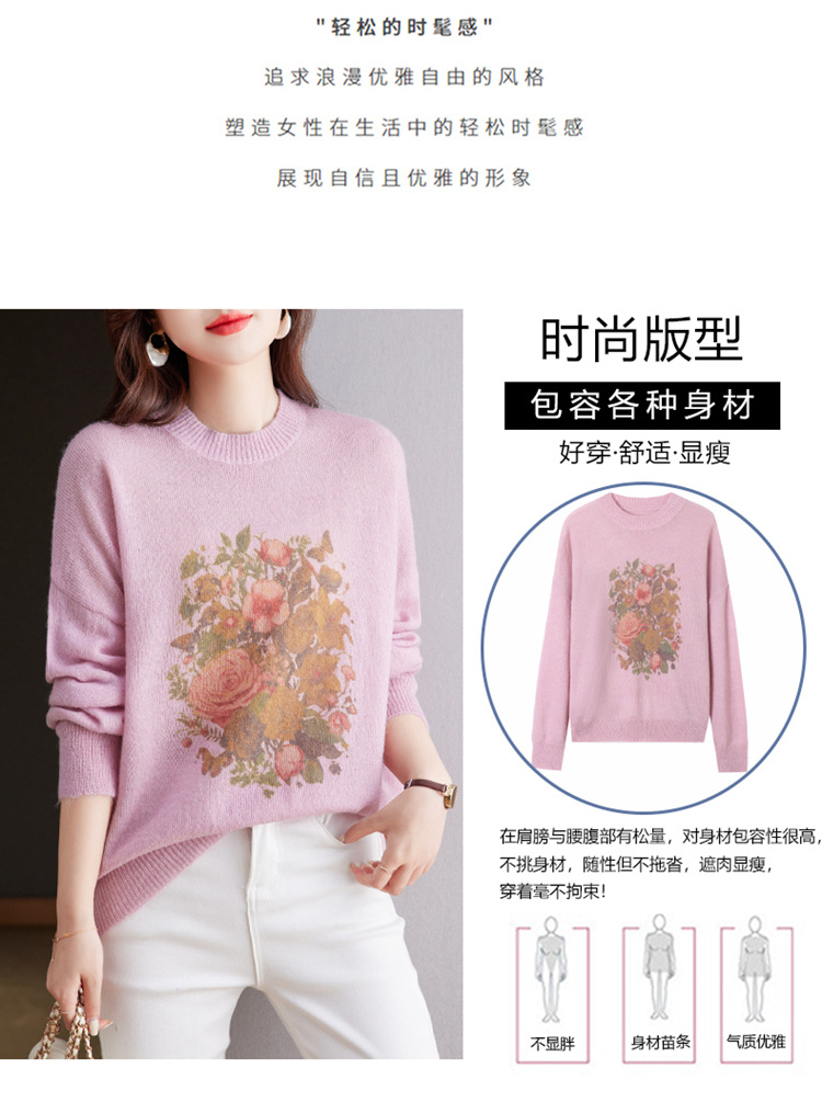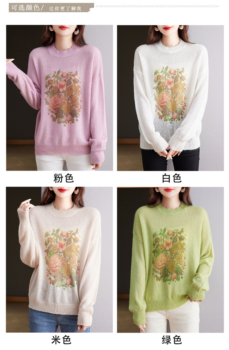 SZ1286浪漫优雅数码印花马海毛毛衣女2024秋冬新款圆领针织衫上衣女 商品图0