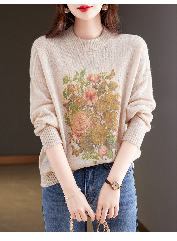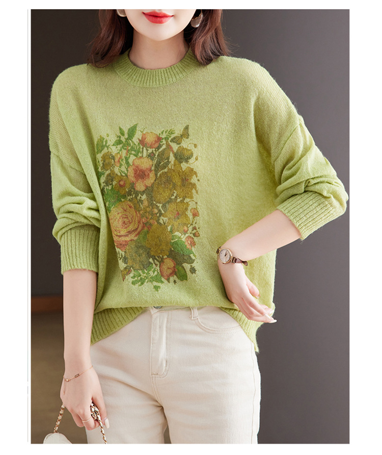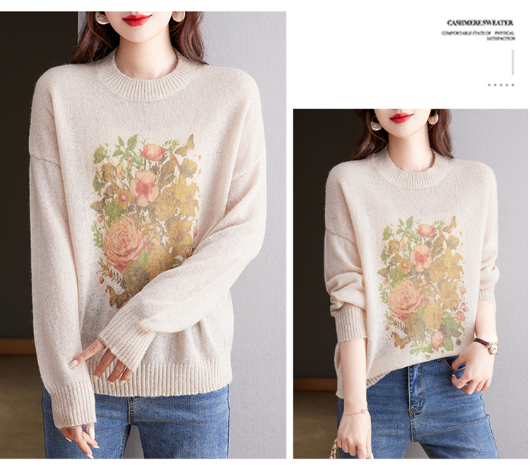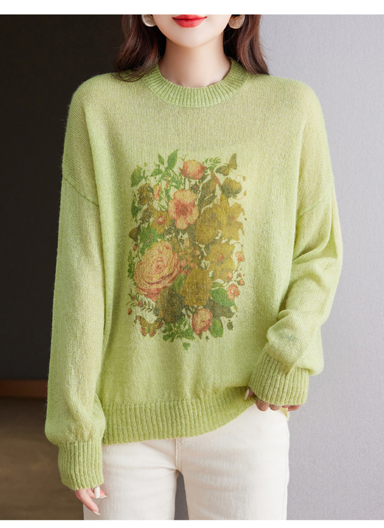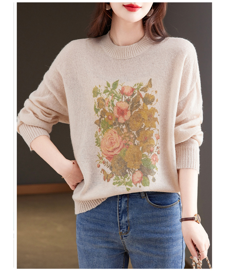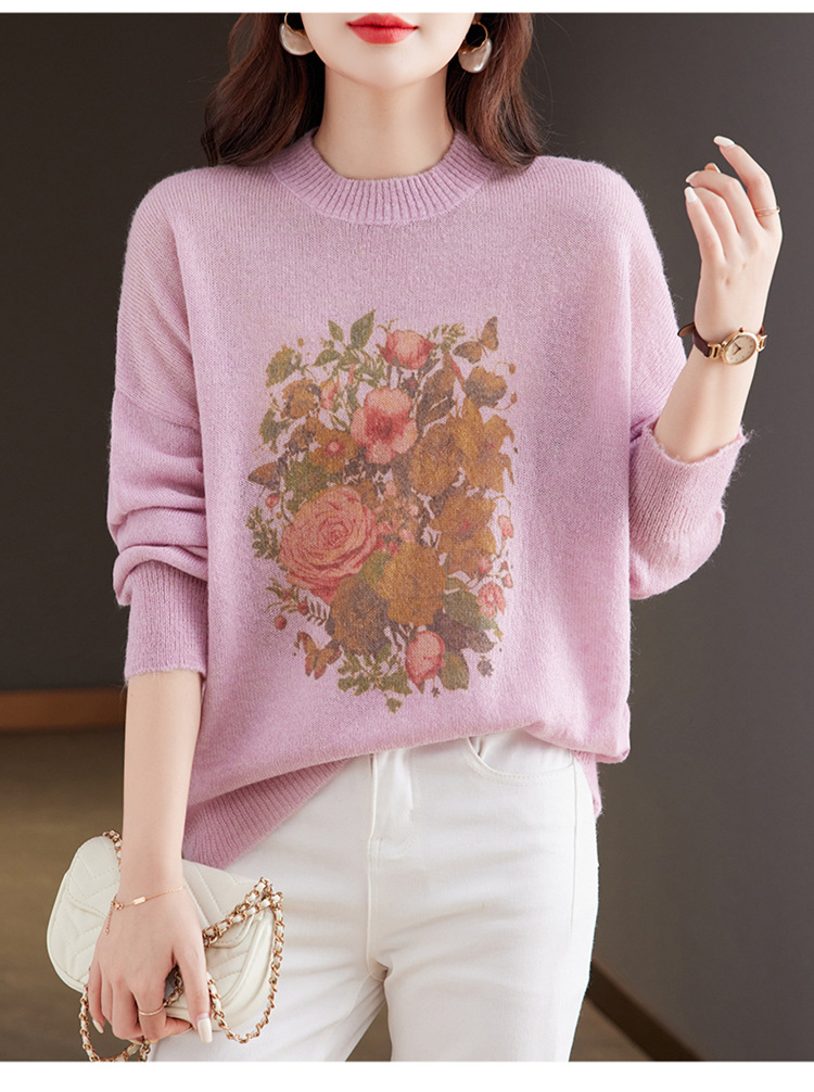 SZ1286浪漫优雅数码印花马海毛毛衣女2024秋冬新款圆领针织衫上衣女 商品图0