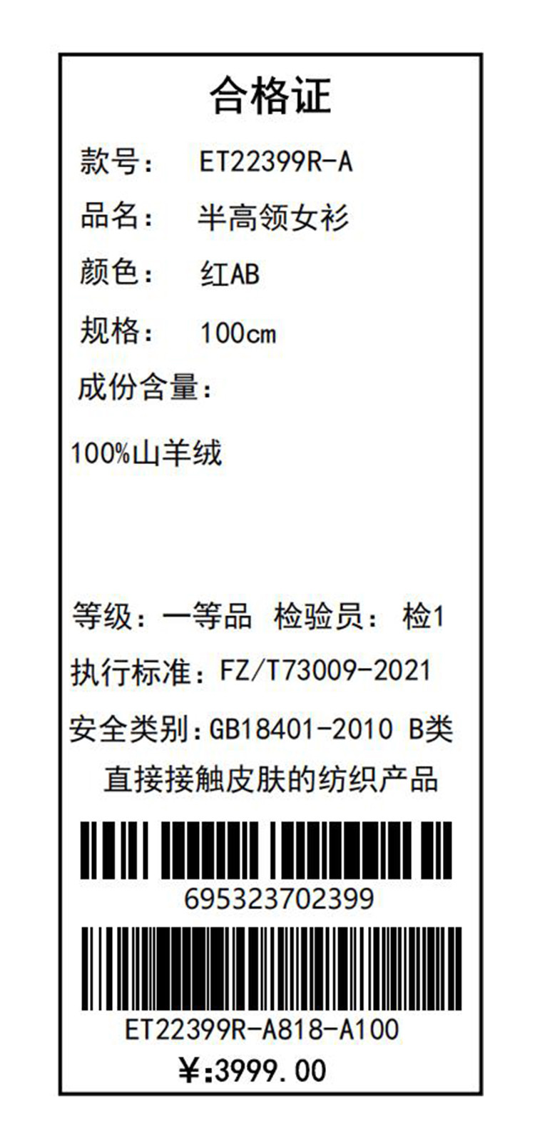 PALUOPO/PL半高领女衫ET22399R-A/约重360g帕罗