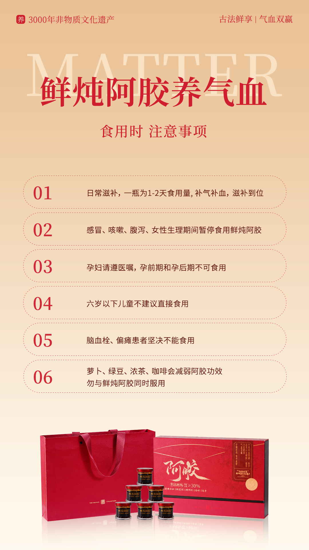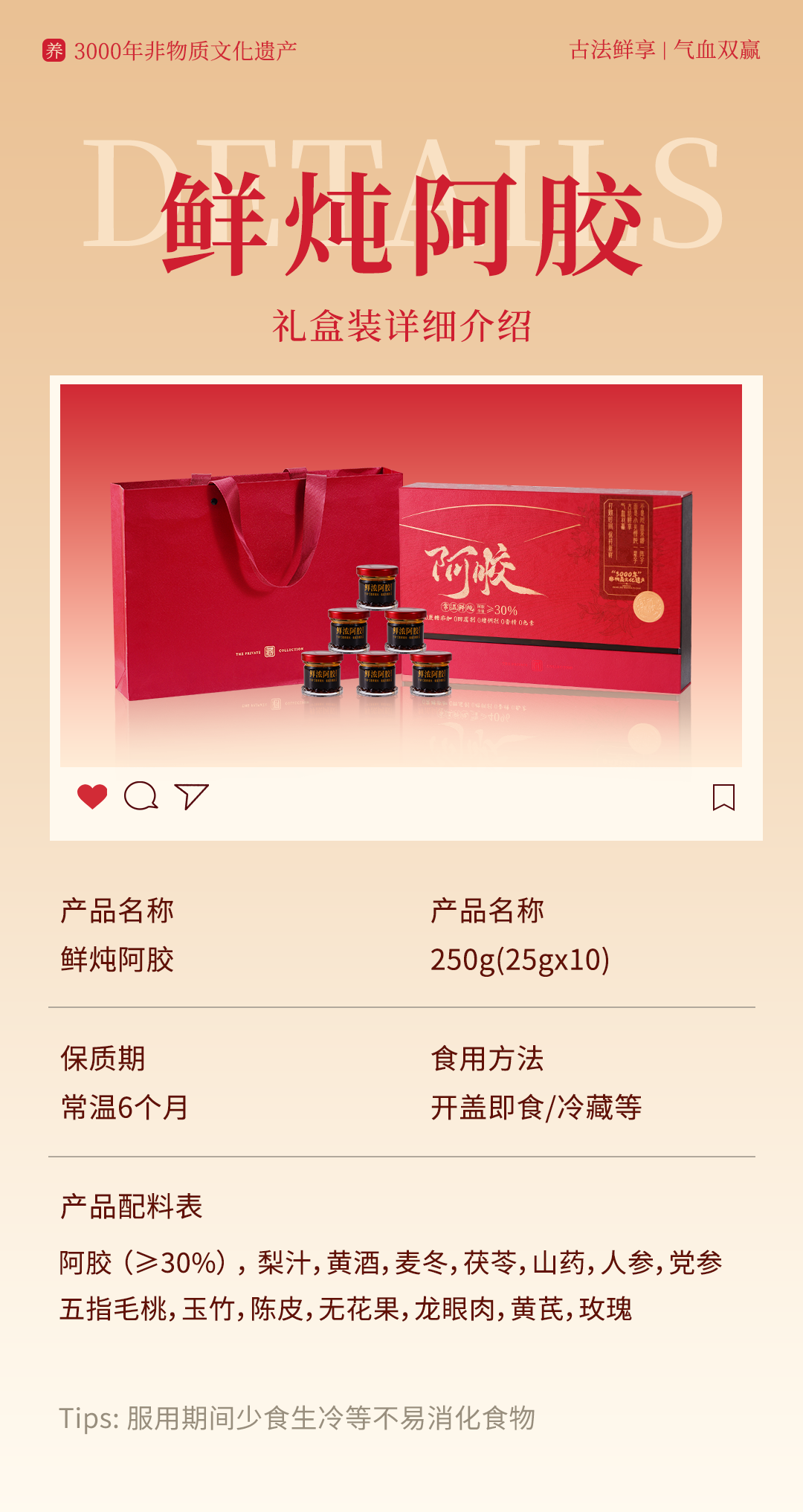 创新性配方,高浓度≥30%阿胶含量;东阿阿胶+道地精选食材熬制;加入梨汁、麦冬、玉竹、无花果等食材,不易上火;很适合气色差体质差,想补又虚不受补的人群~