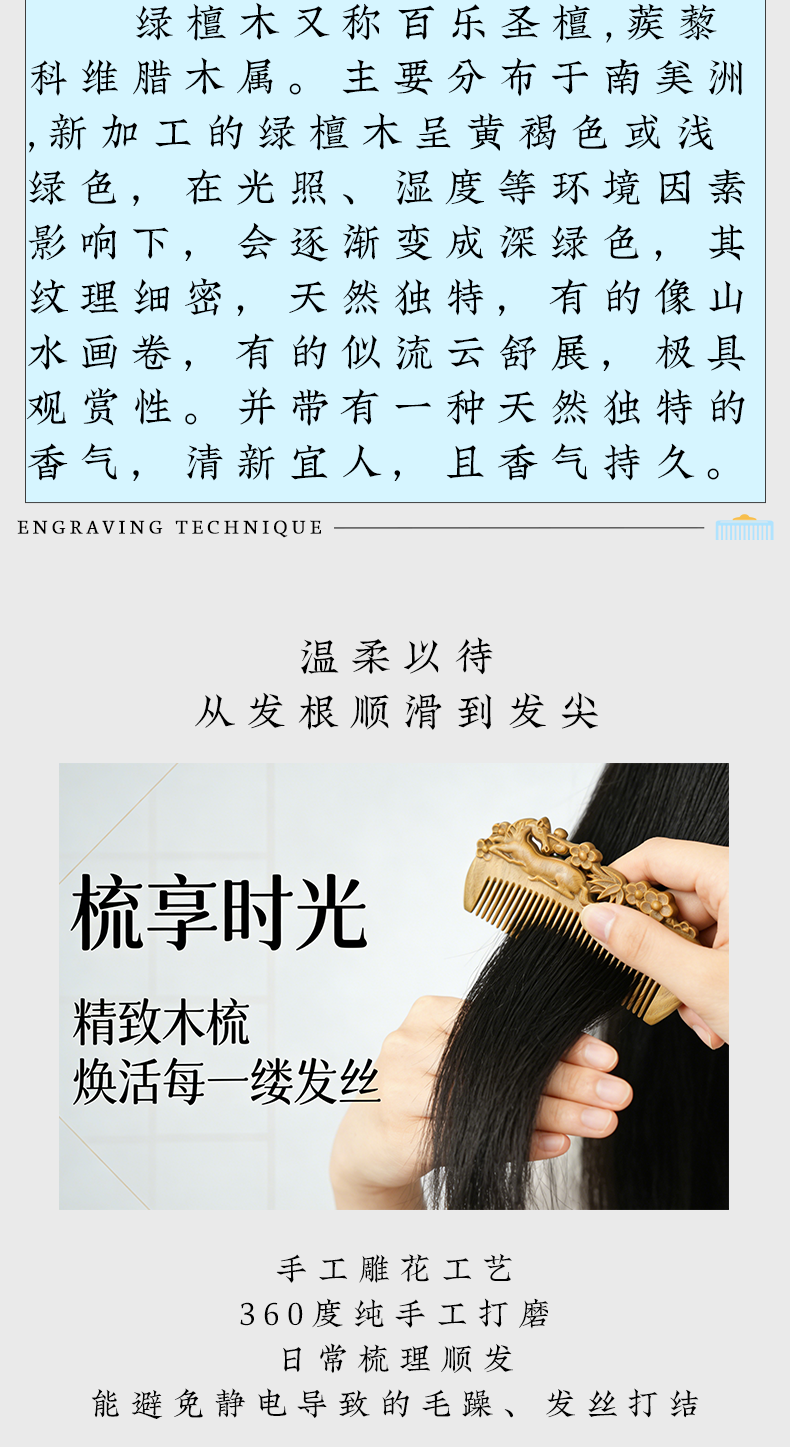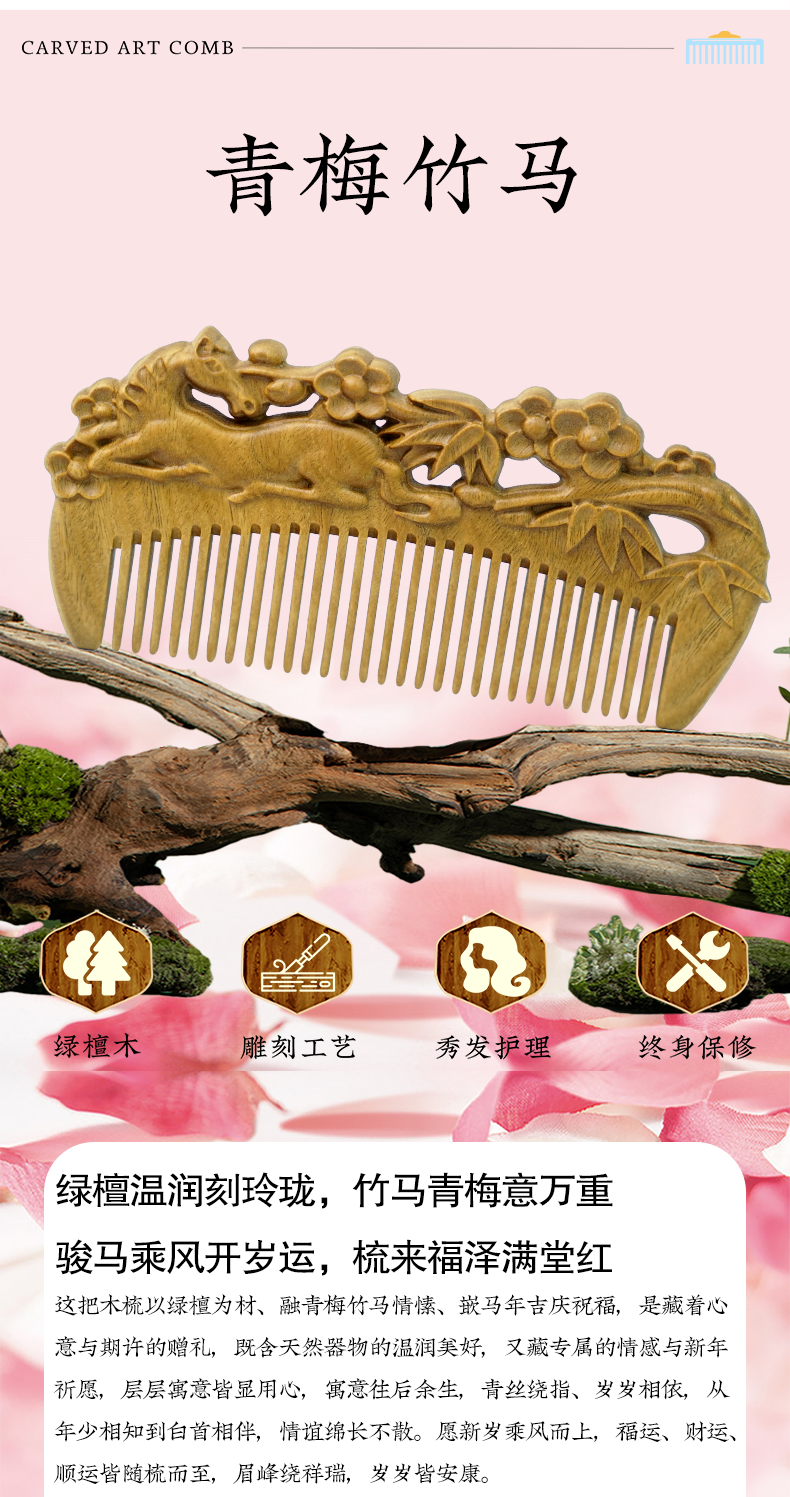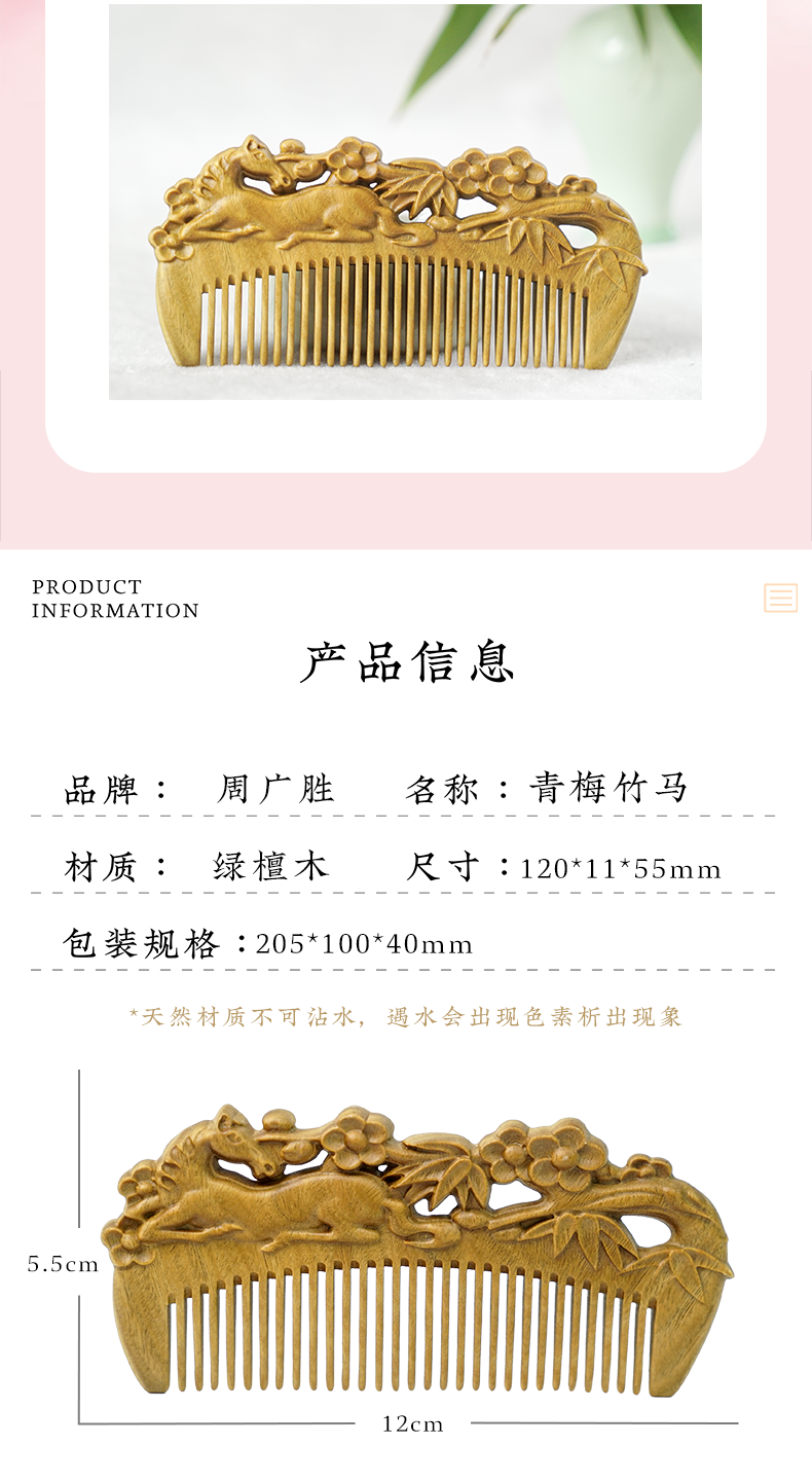 周广胜马年新品青梅竹马绿檀木雕刻梳子女士专用防静电顺发护发