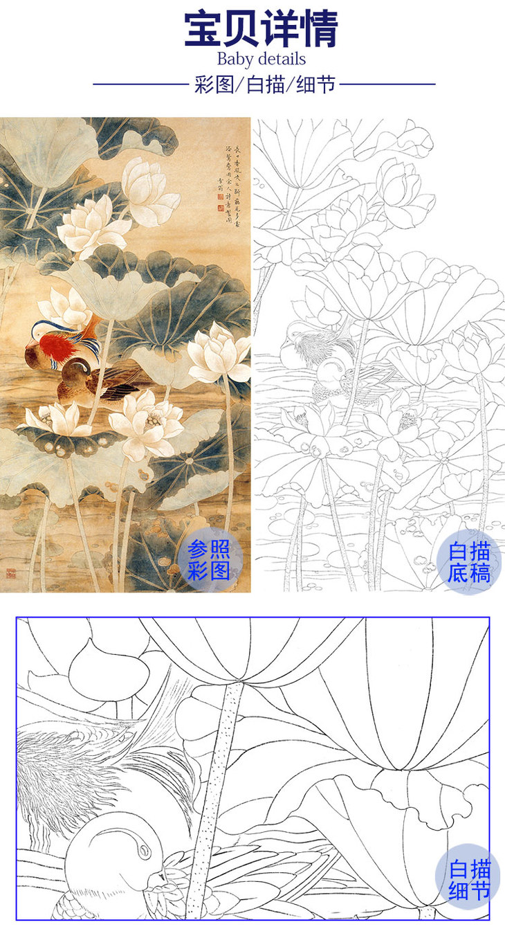 陈之佛竖幅工笔花鸟白描底稿-荷花鸳鸯-QA21