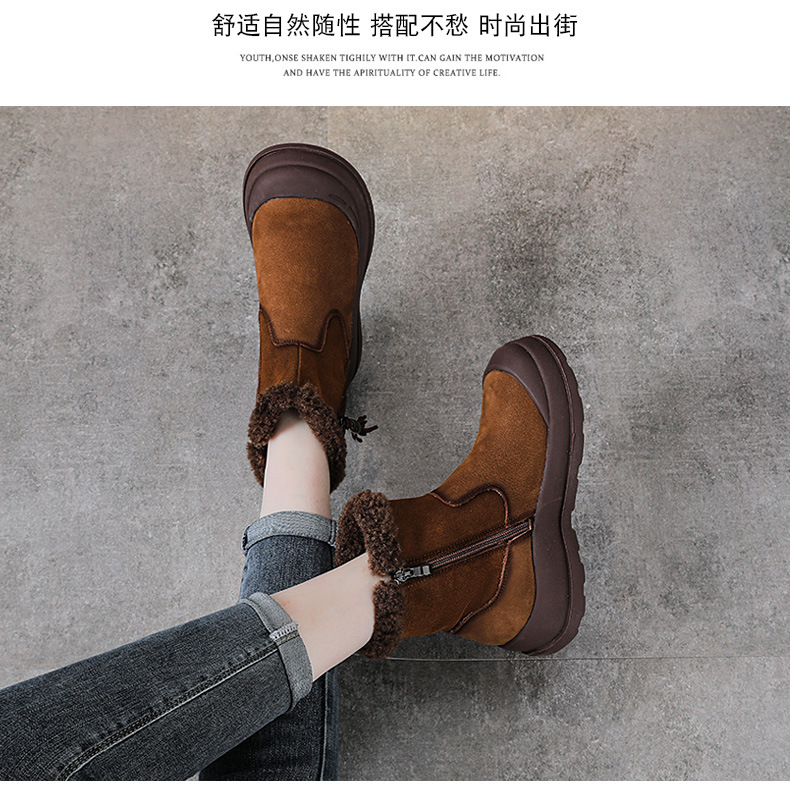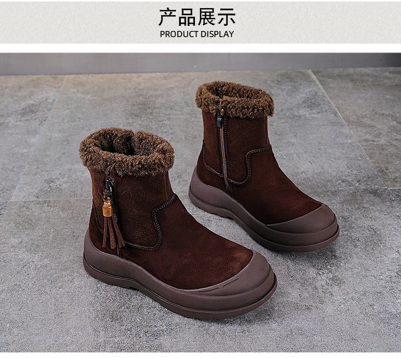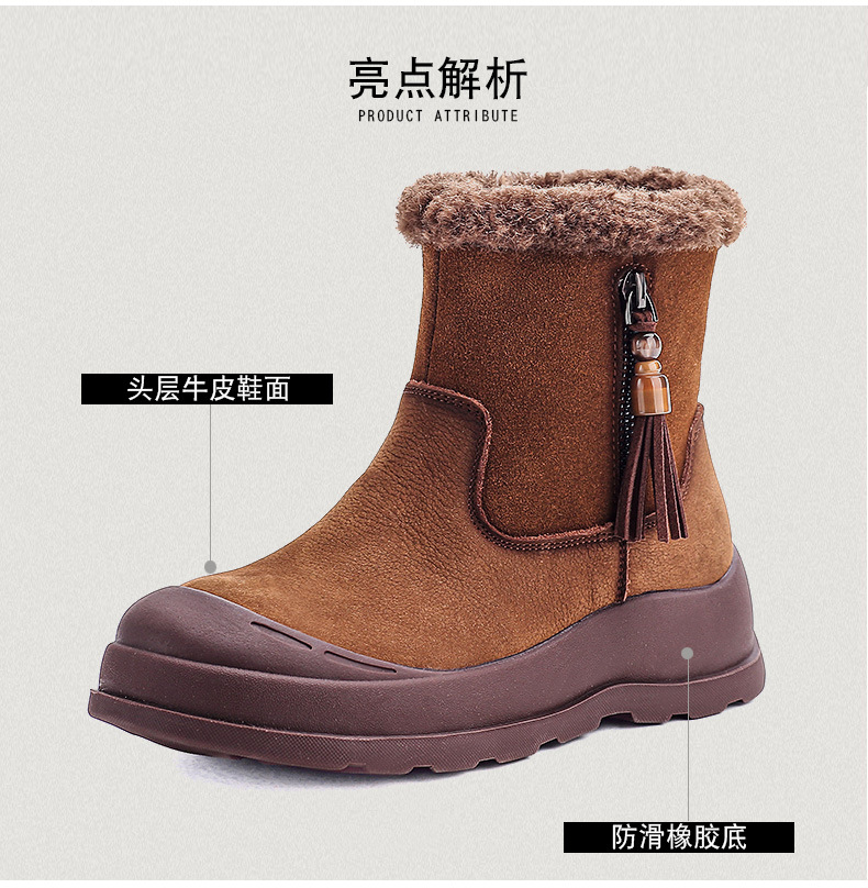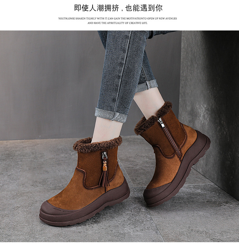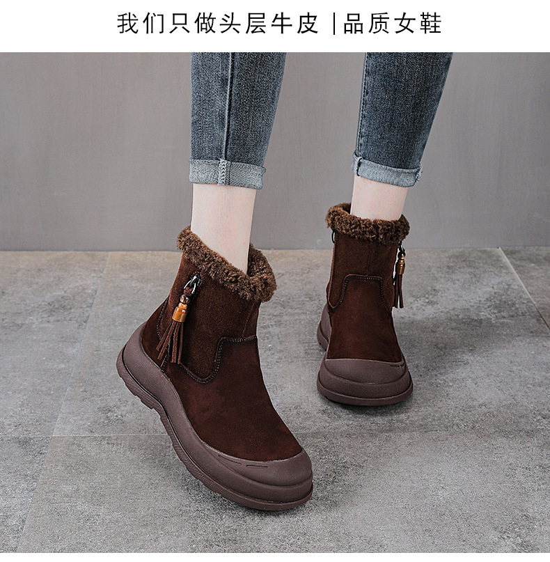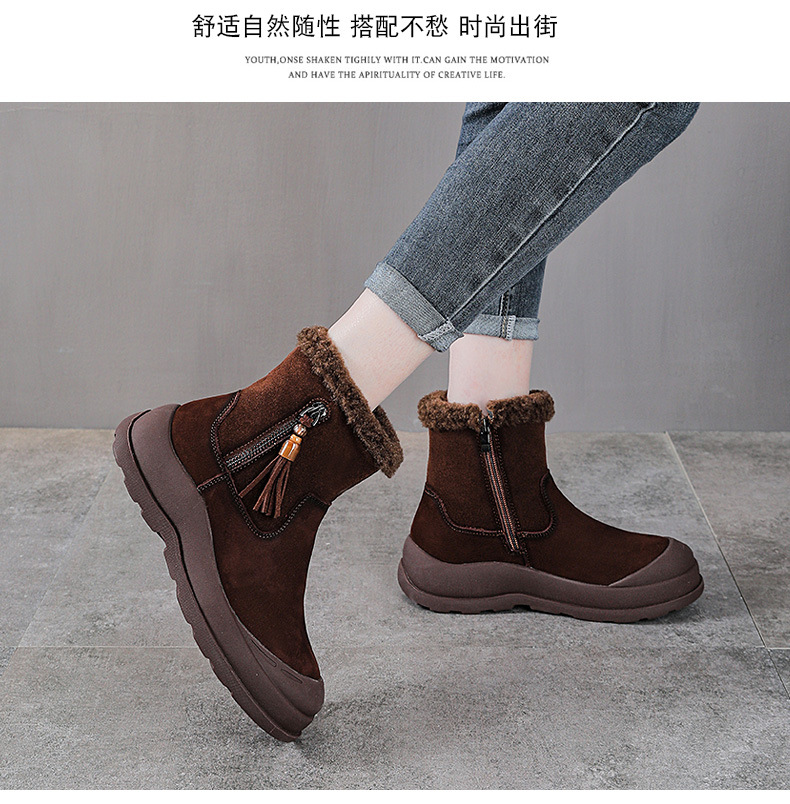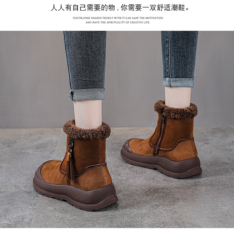 YR 2923真皮加绒复古短靴保暖舒适牛皮厚底雪地靴侧拉链流苏靴
