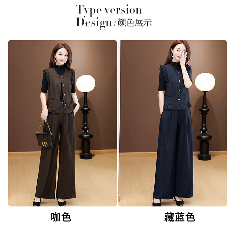 QYM 58C258507-Y时尚两件套裤高腰阔腿裤+木耳边褶皱马甲休闲套装
