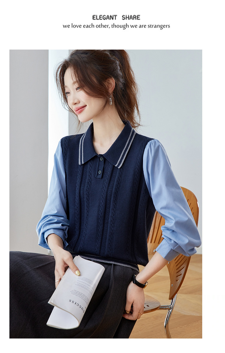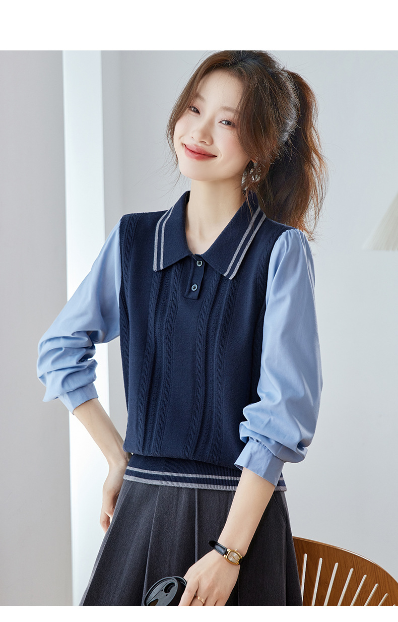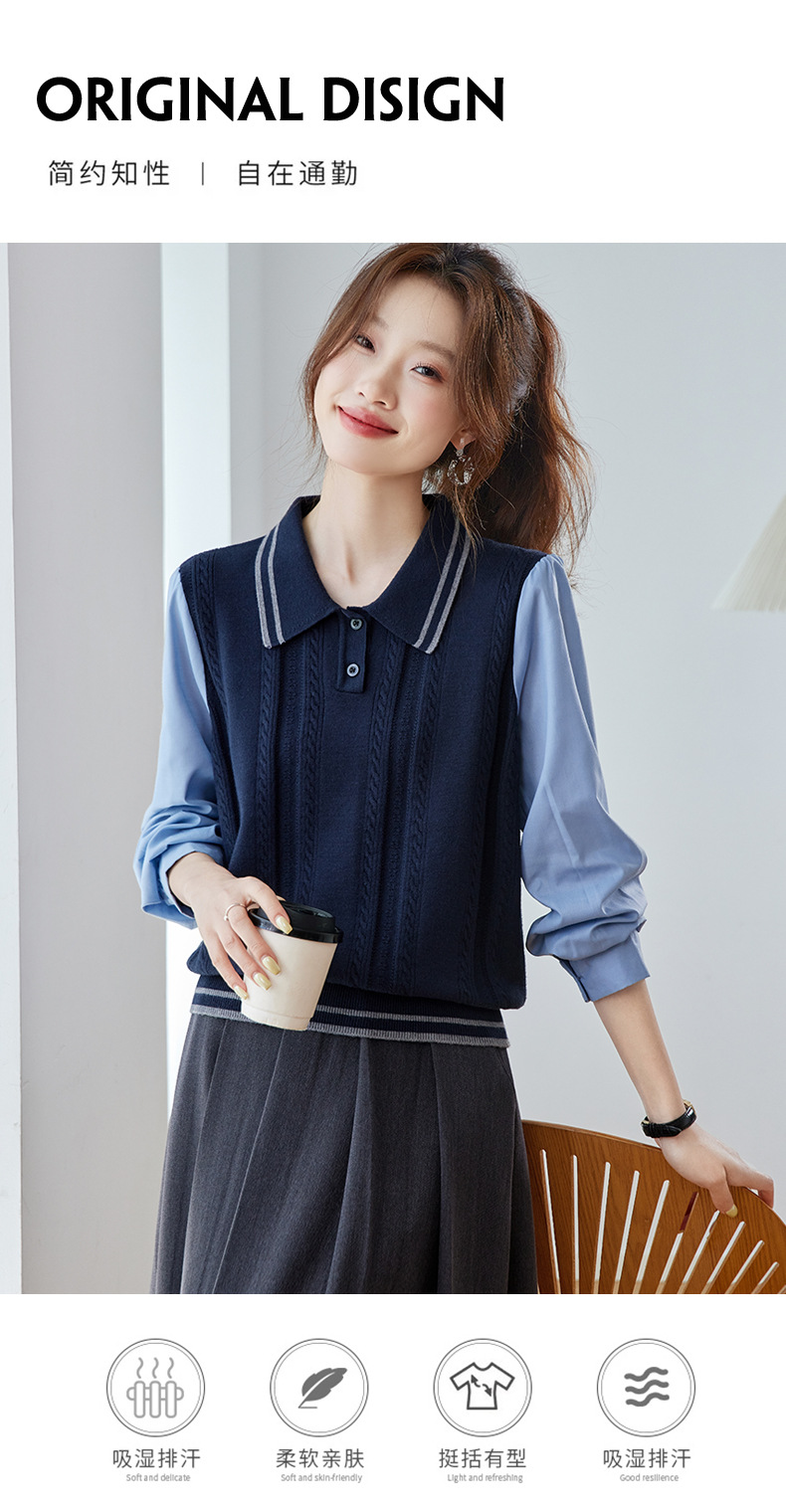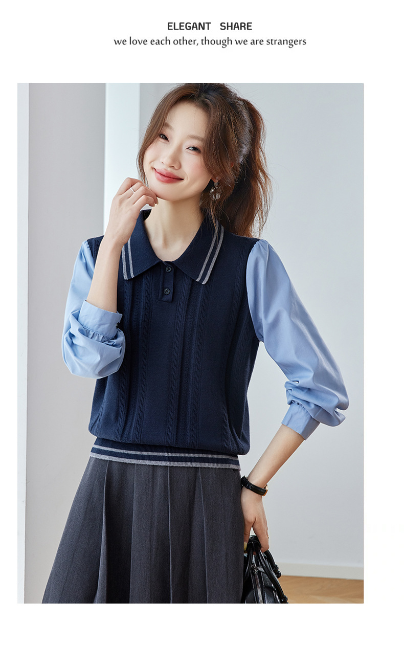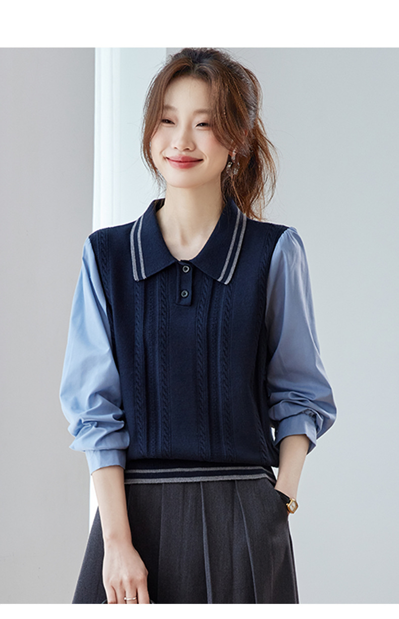 CCpolo领长袖衬衫拼接针织衫女春秋2025新款翻领小个子毛衣打底上衣