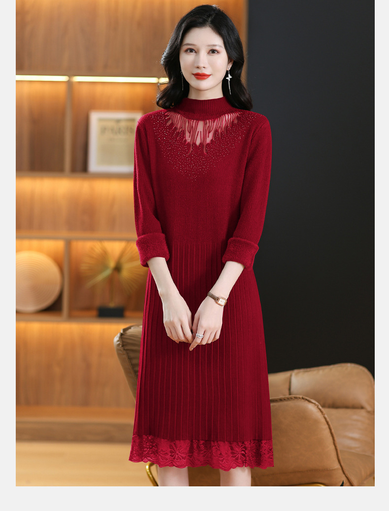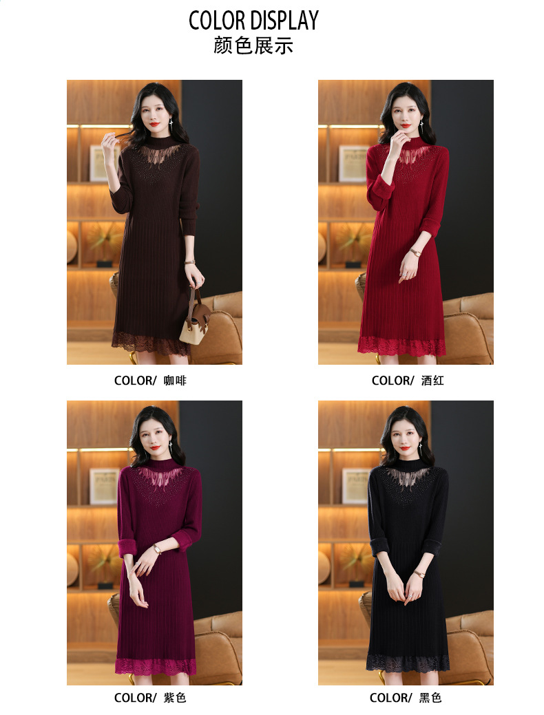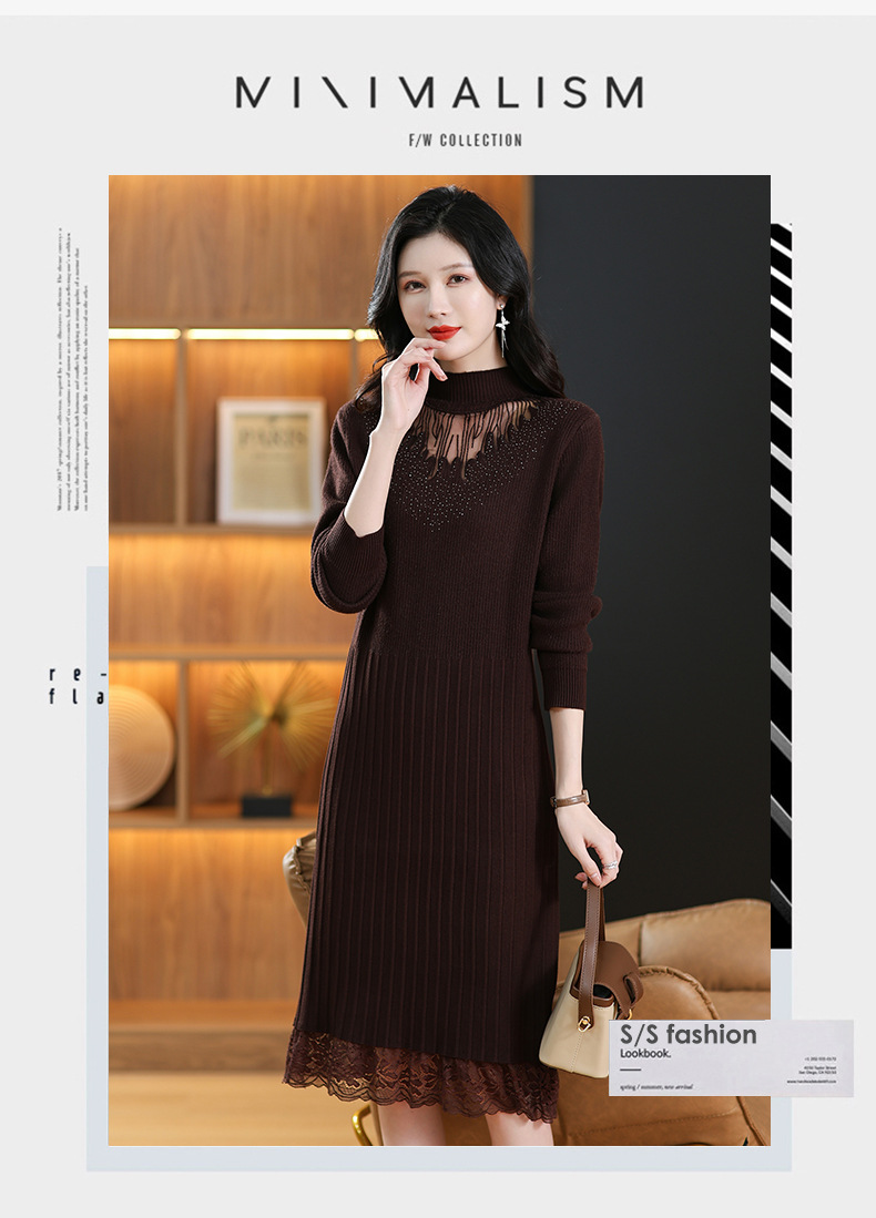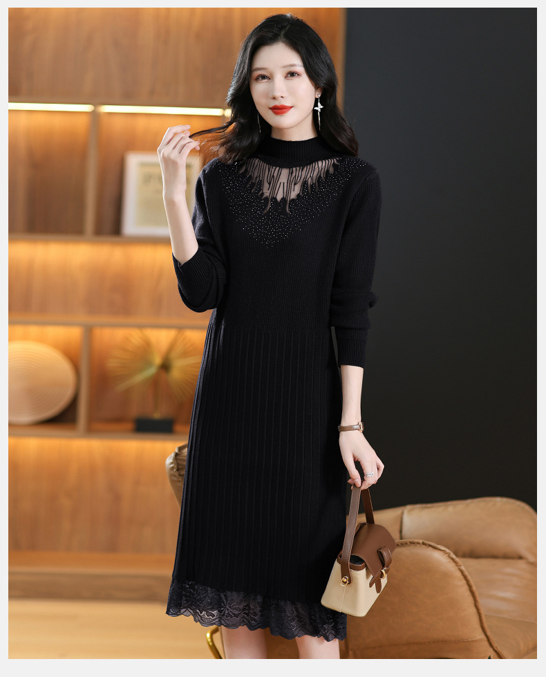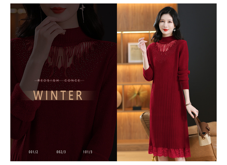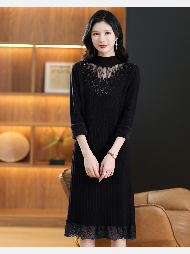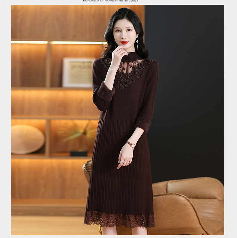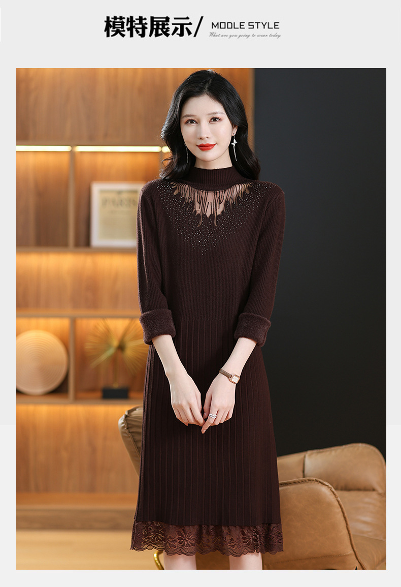 CC-MH-348时尚气质加绒加厚镂空中长款毛衣裙女蕾丝拼接针织连衣裙女
