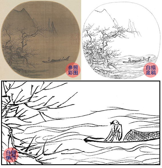 宋画山水人物小品白描底稿-马远 《梅溪放艇图》-多种白描尺寸可选-GS18