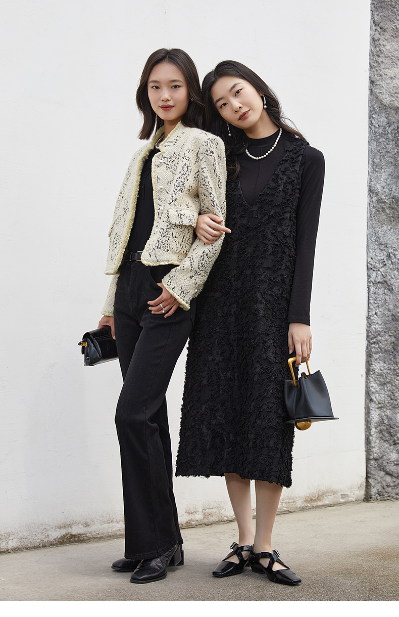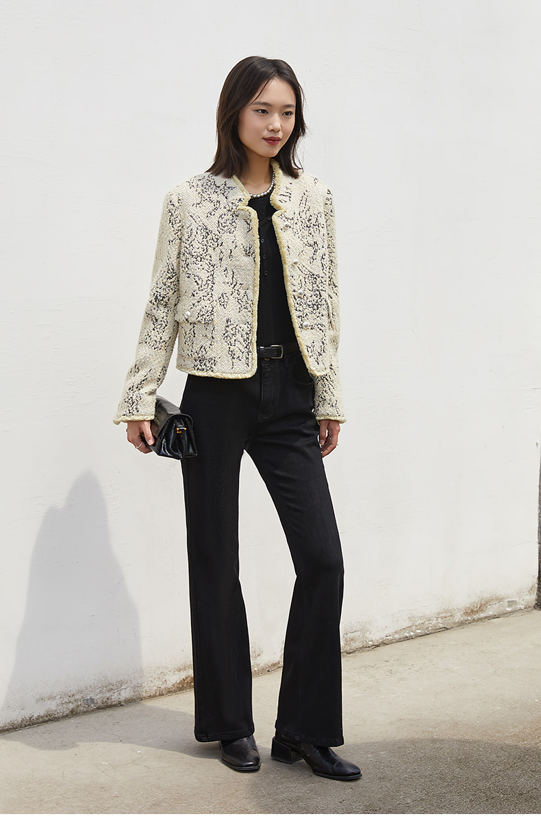 轻熟氛围感叠穿 米白底色黑纹粗花呢短外套 珍珠装饰包边小香风通勤夹克