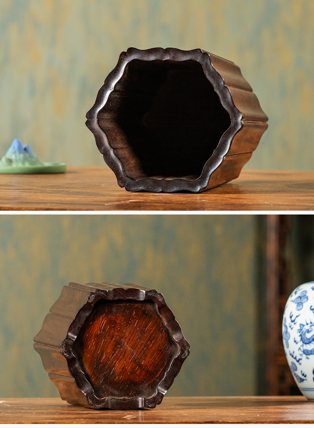清 青金石嵌绿松石莲花盖盒(红木座)