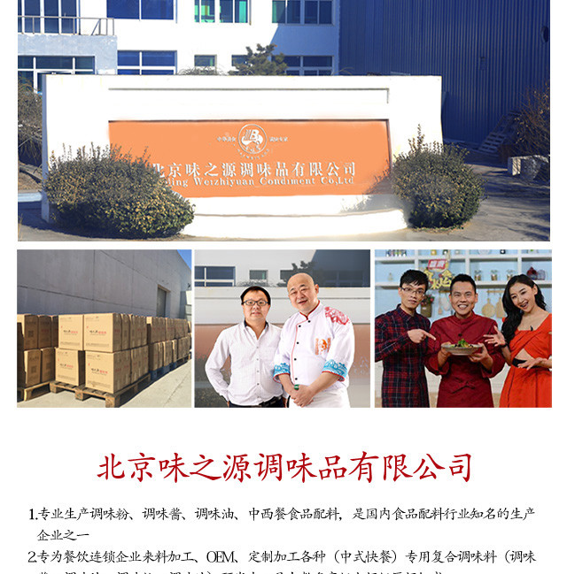 北京味之源调味品有限公司成立于2000年,是一家集研发、生产、销售为一体的现代化专业食品配料企业,是国内知名食品配料行业生产企业之一。公司坐落于美丽的首都-北京,注册资本1058万元,拥有占地2万平米