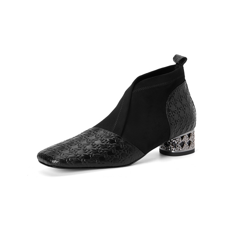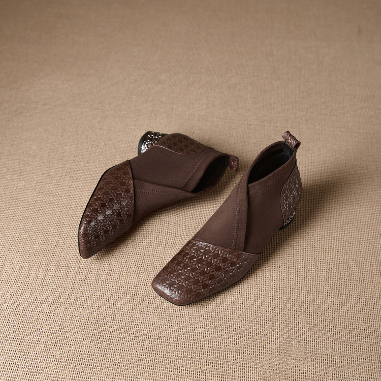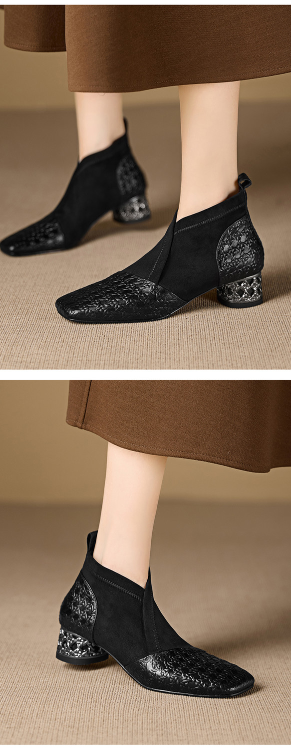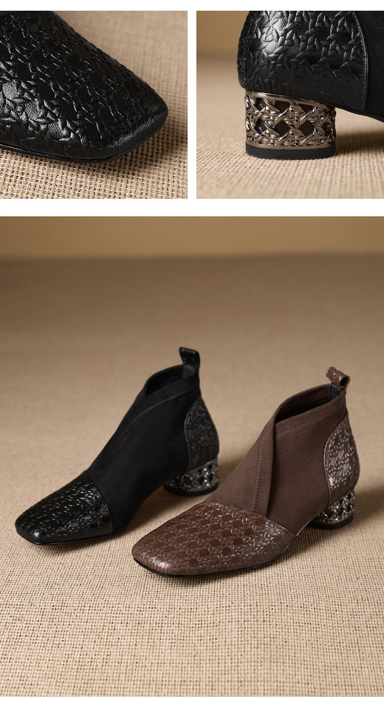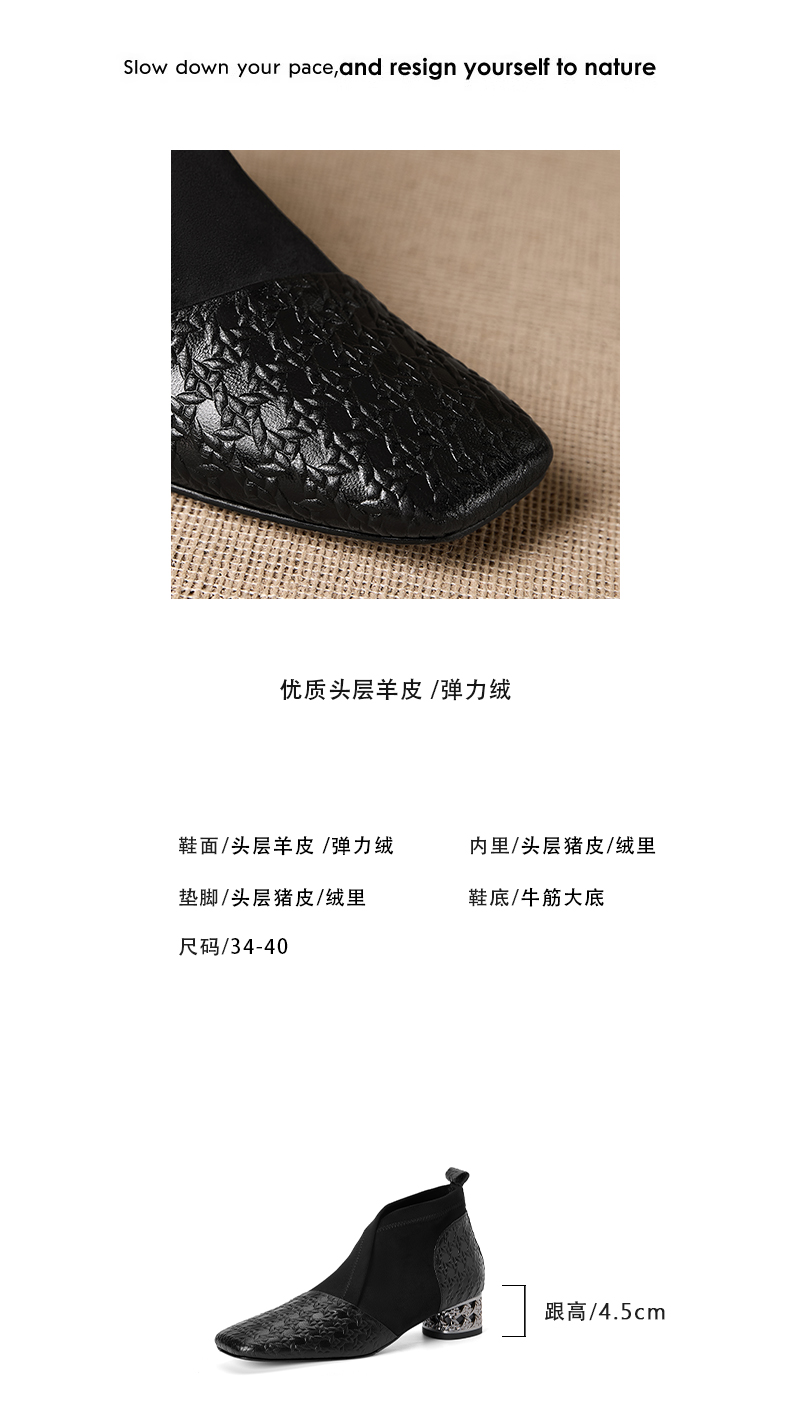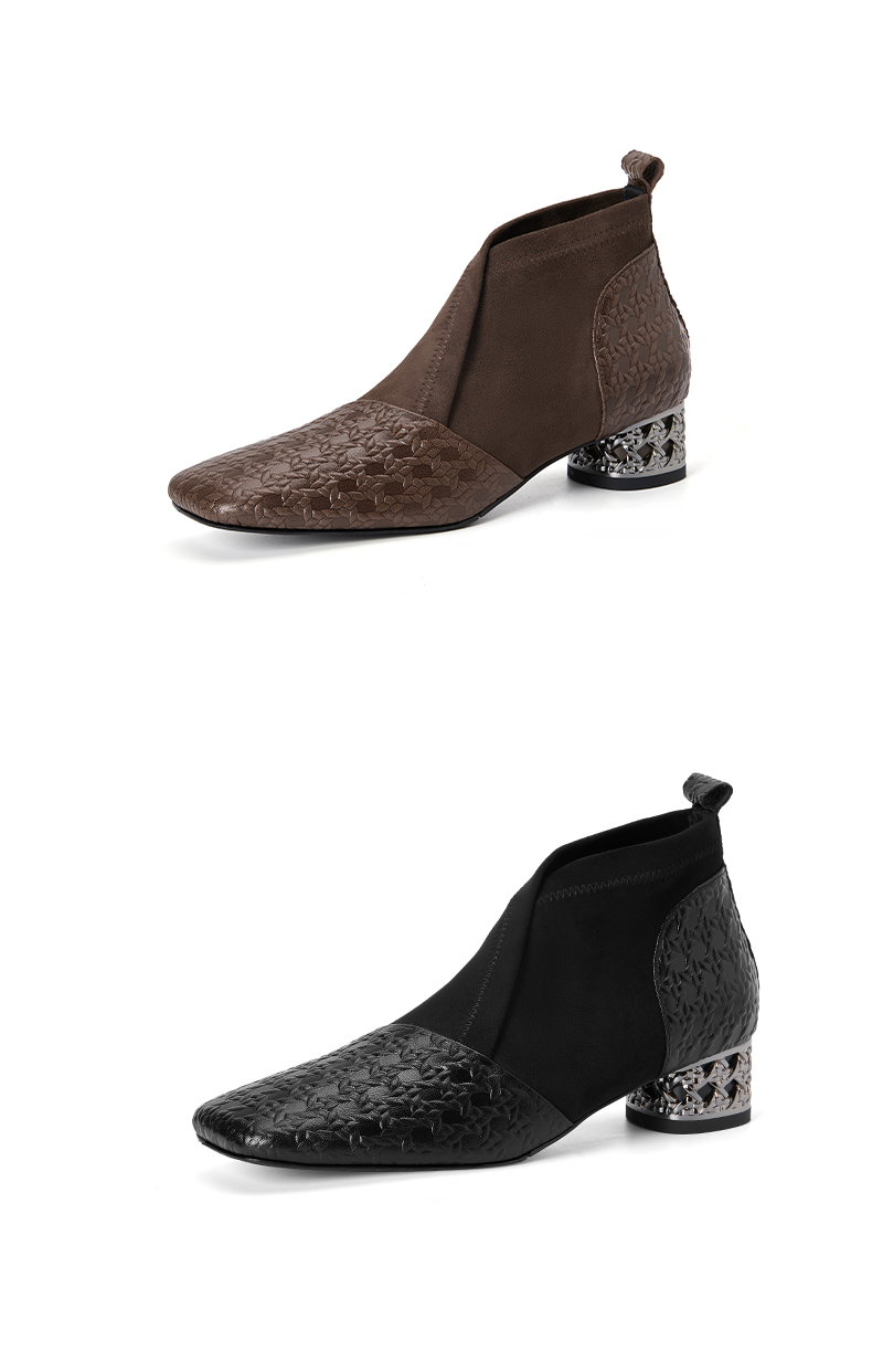 【预售5天】小众设计款时尚女鞋新款方头压花羊皮拼接中跟时装祼靴MBJR&6966