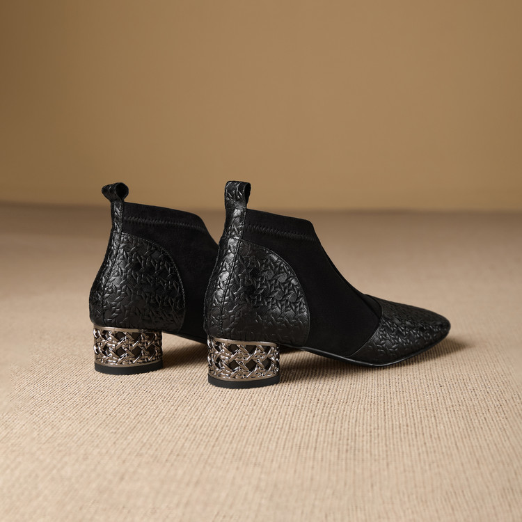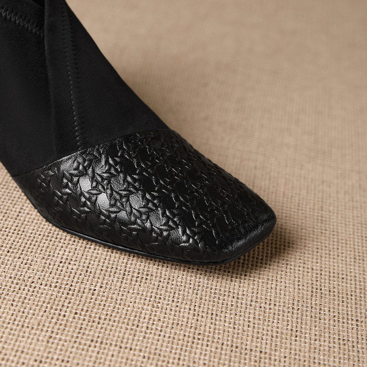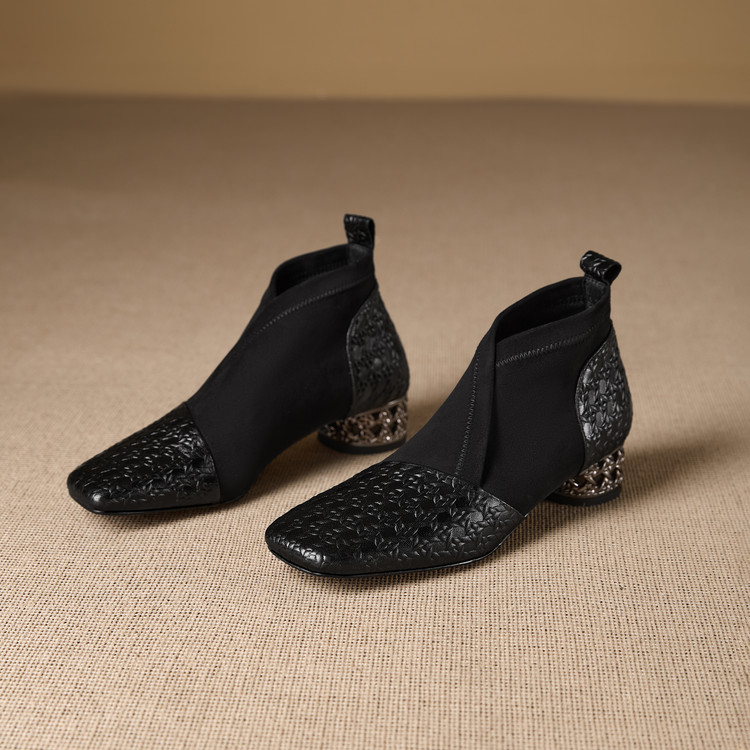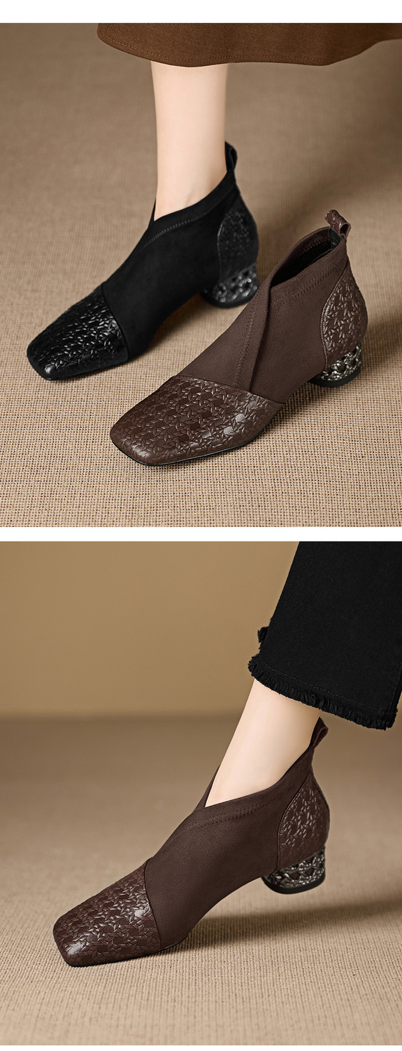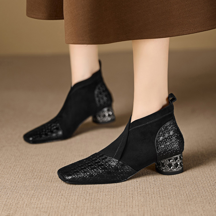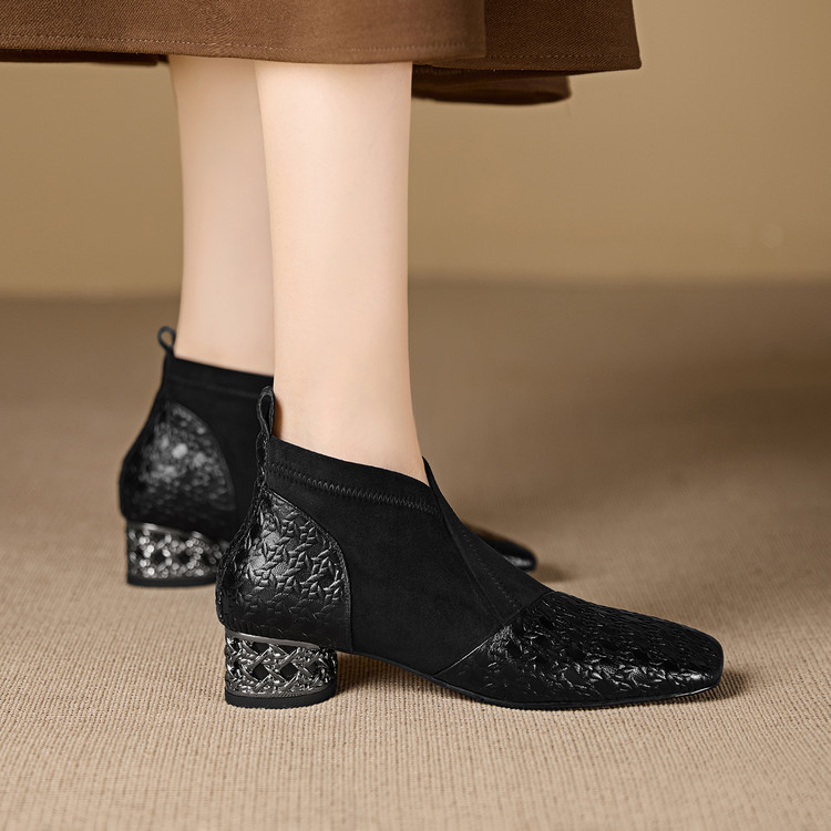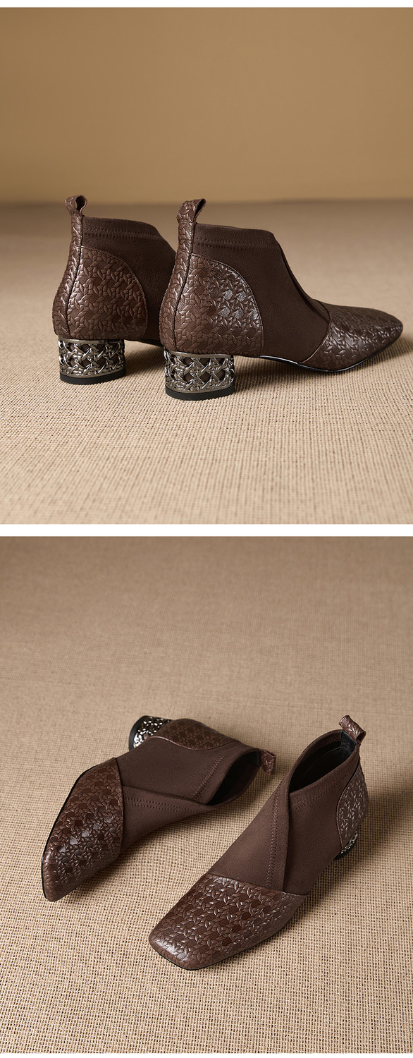 【预售5天】小众设计款时尚女鞋新款方头压花羊皮拼接中跟时装祼靴MBJR&6966