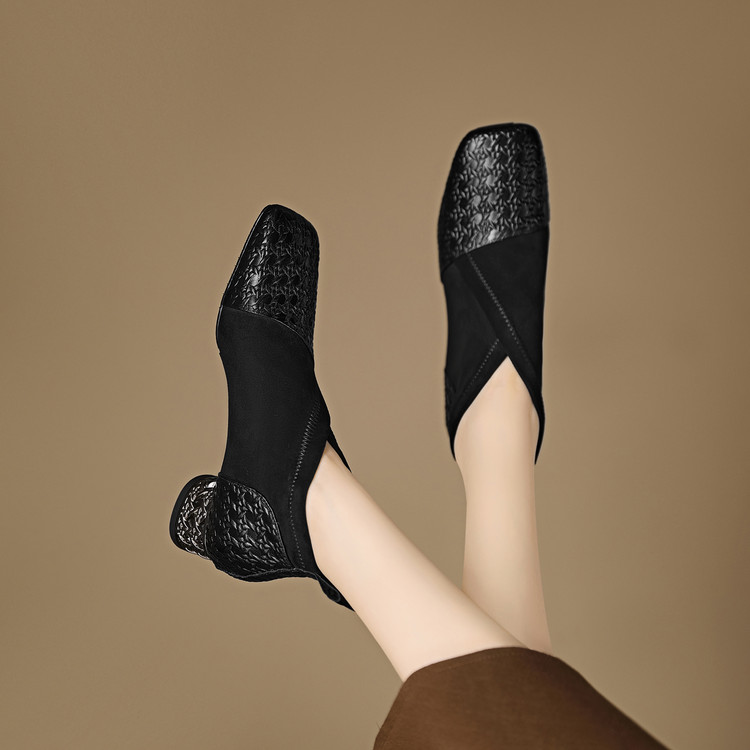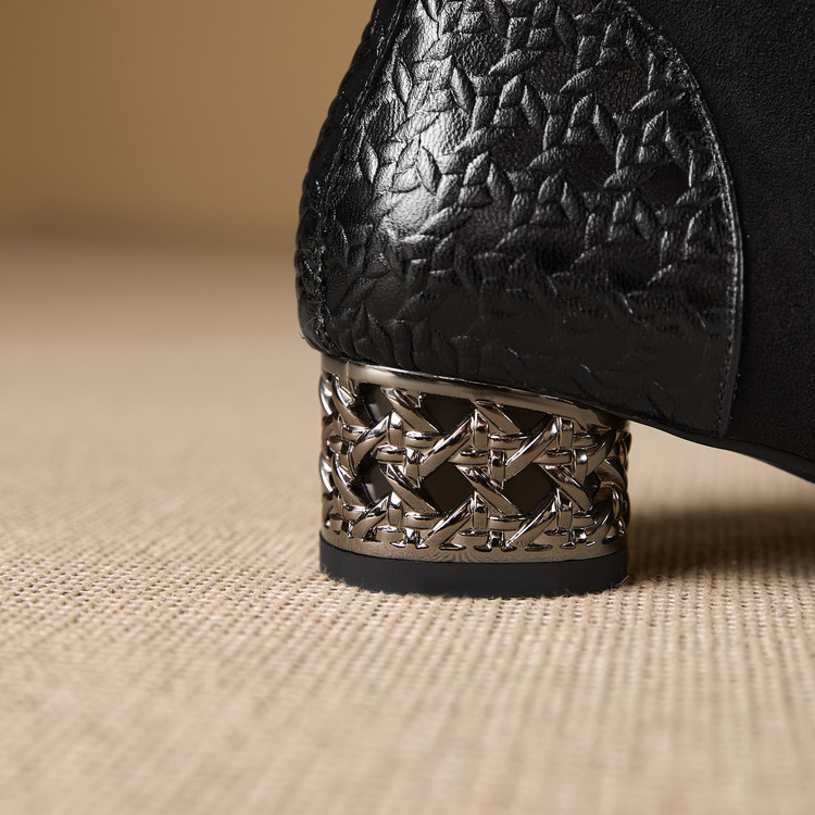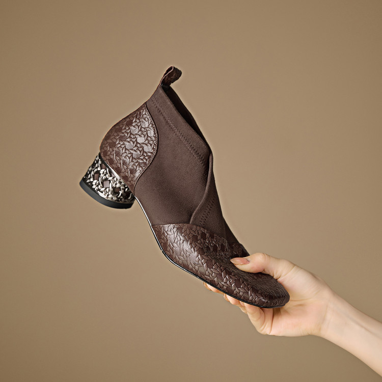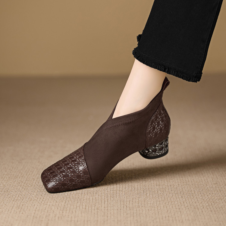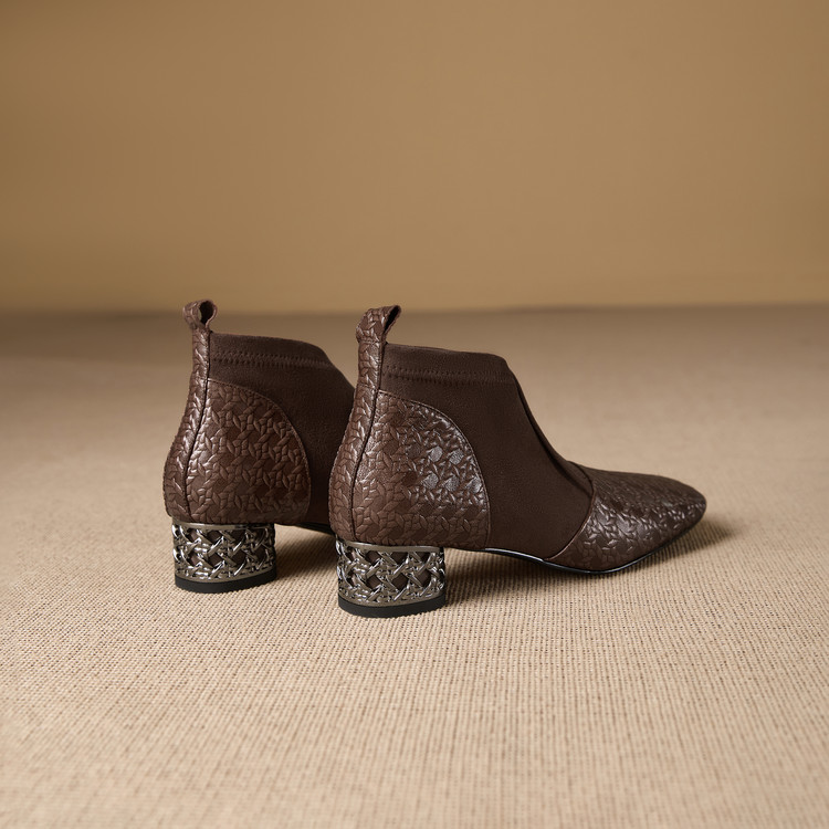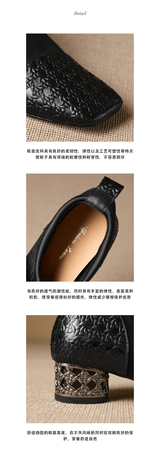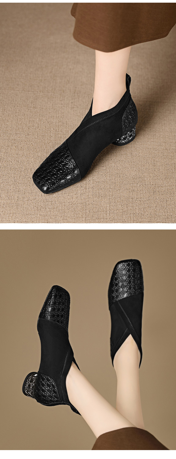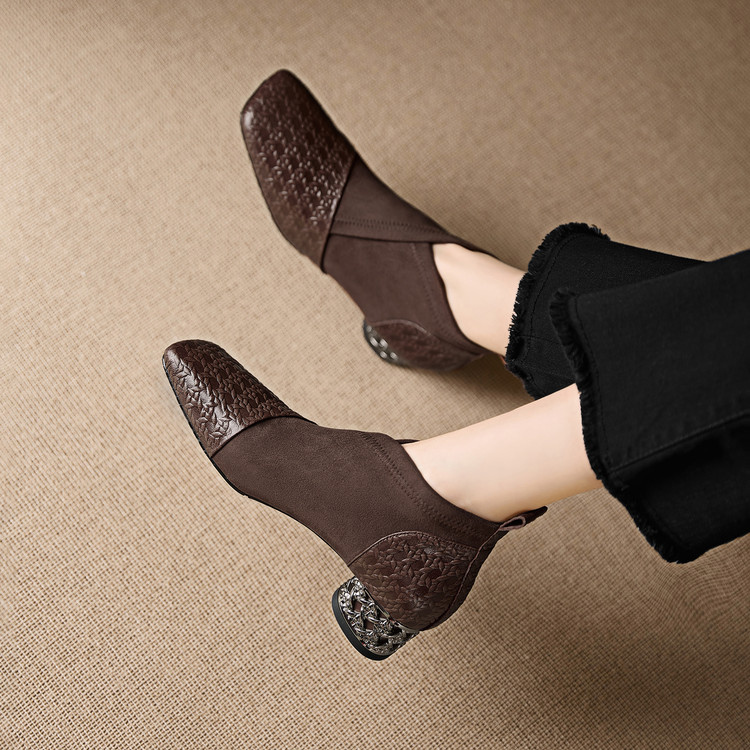 【预售5天】小众设计款时尚女鞋新款方头压花羊皮拼接中跟时装祼靴MBJR&6966