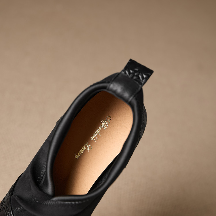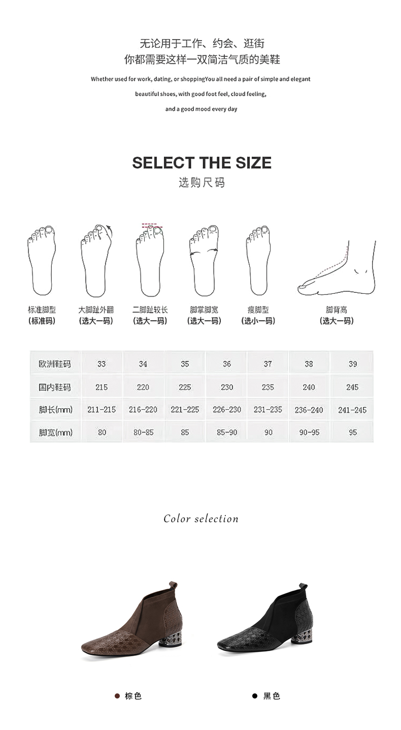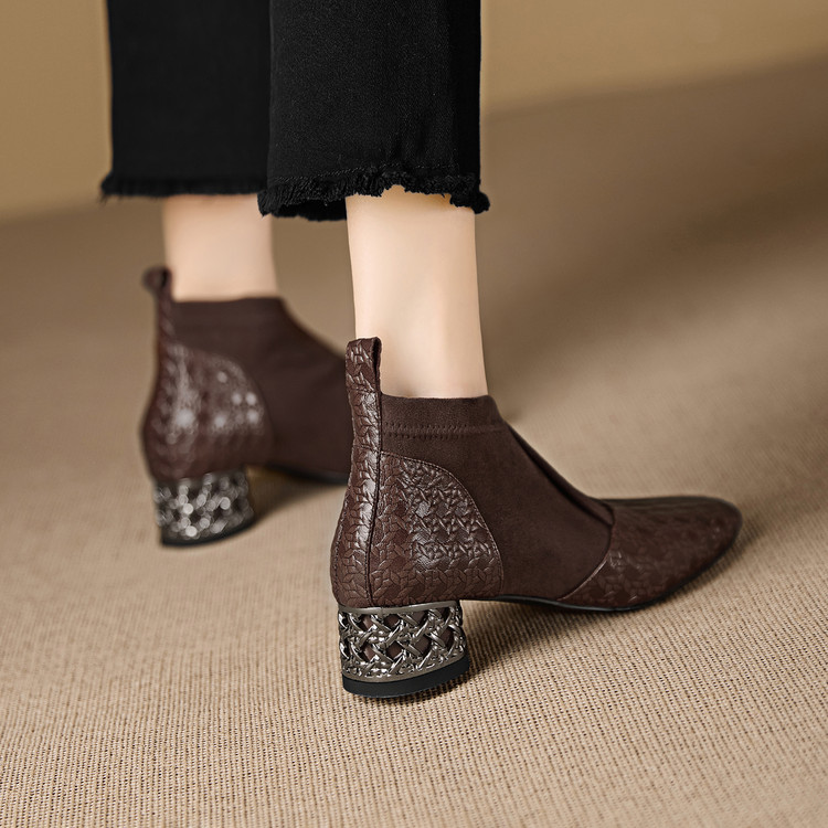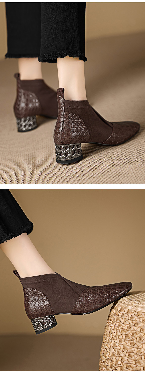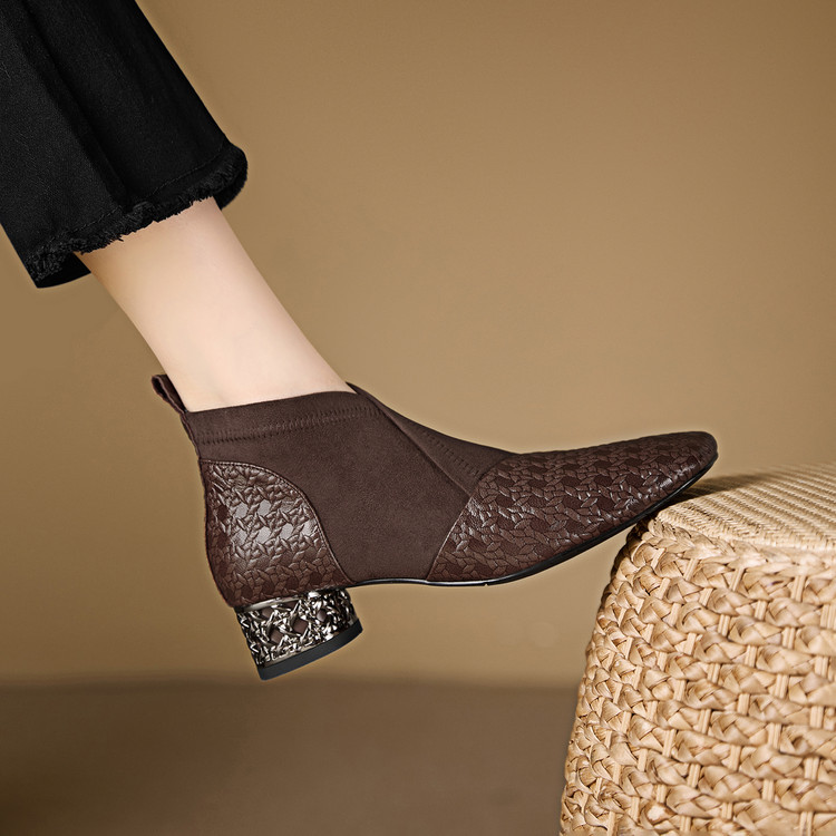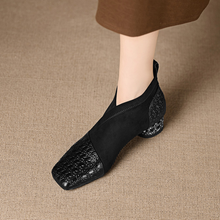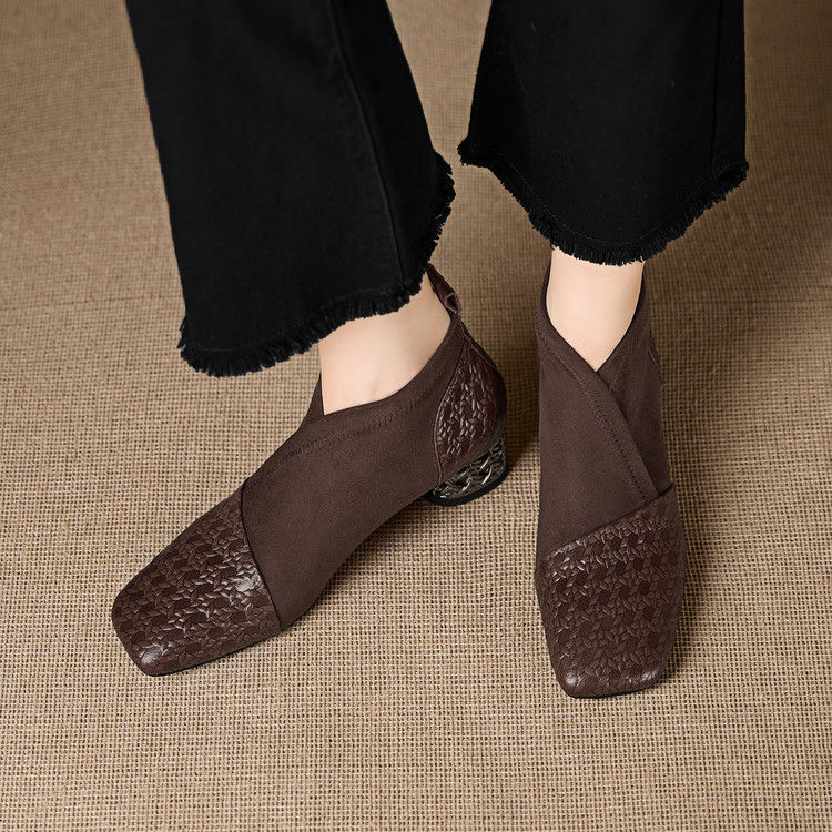 【预售5天】小众设计款时尚女鞋新款方头压花羊皮拼接中跟时装祼靴MBJR&6966