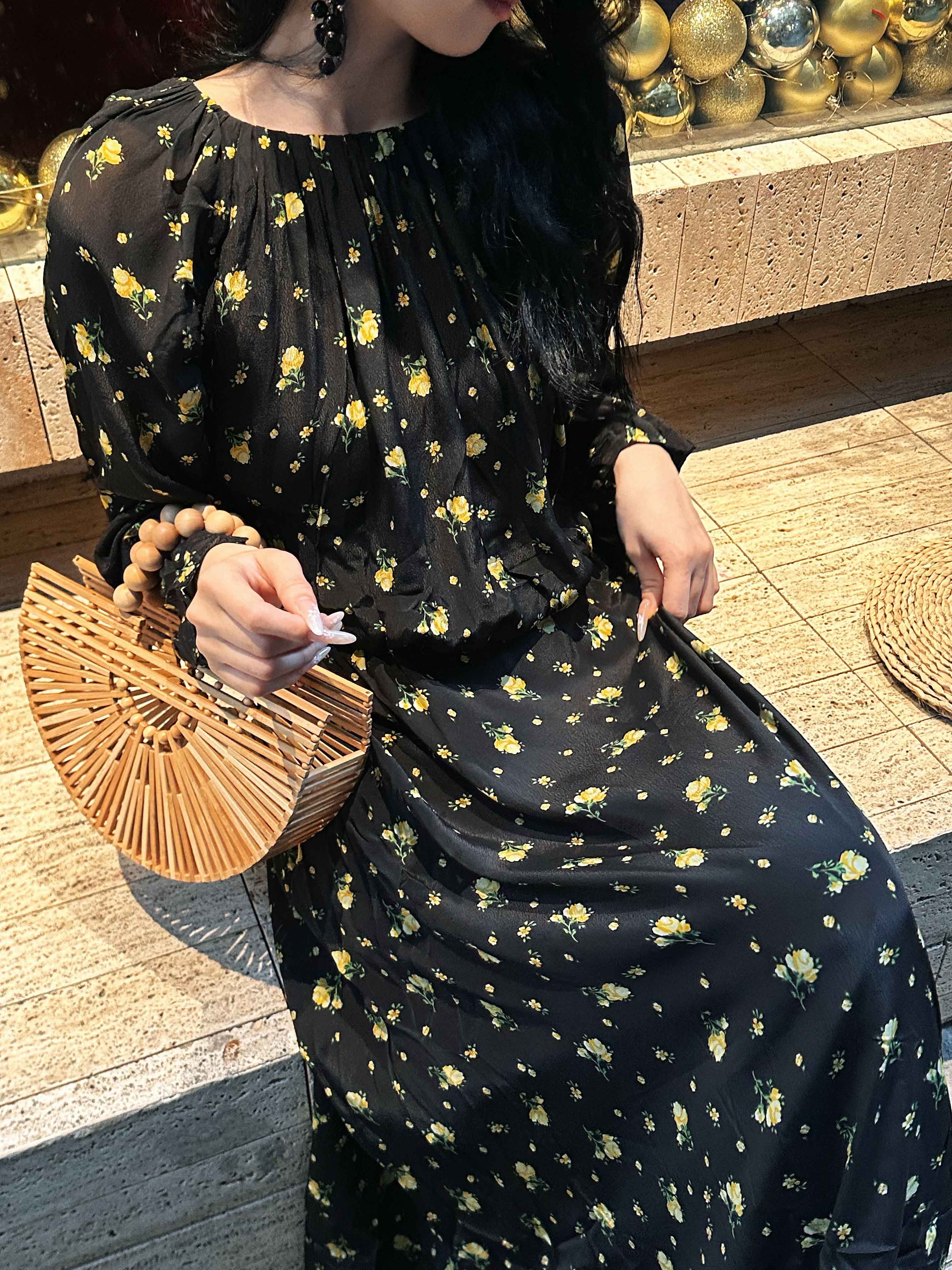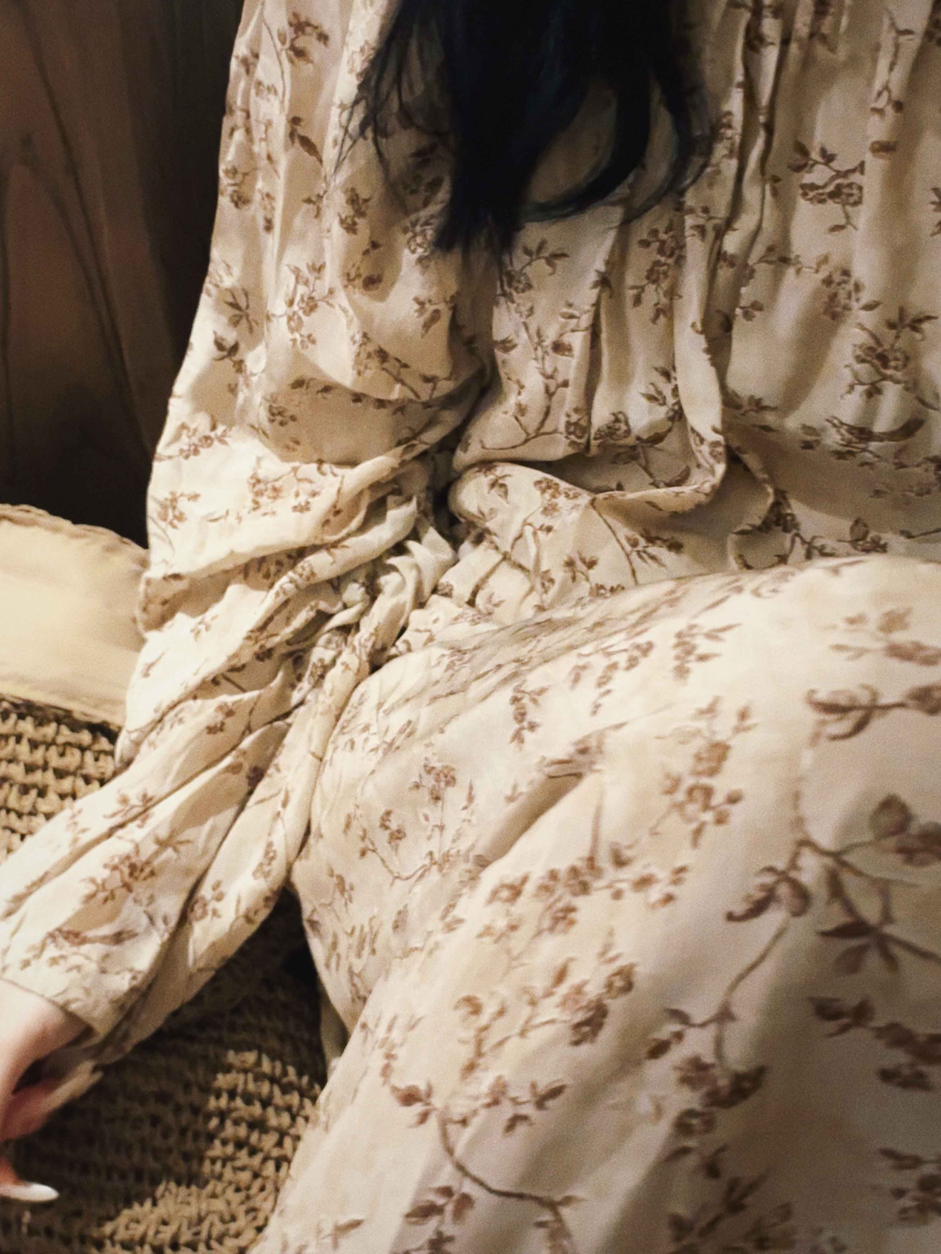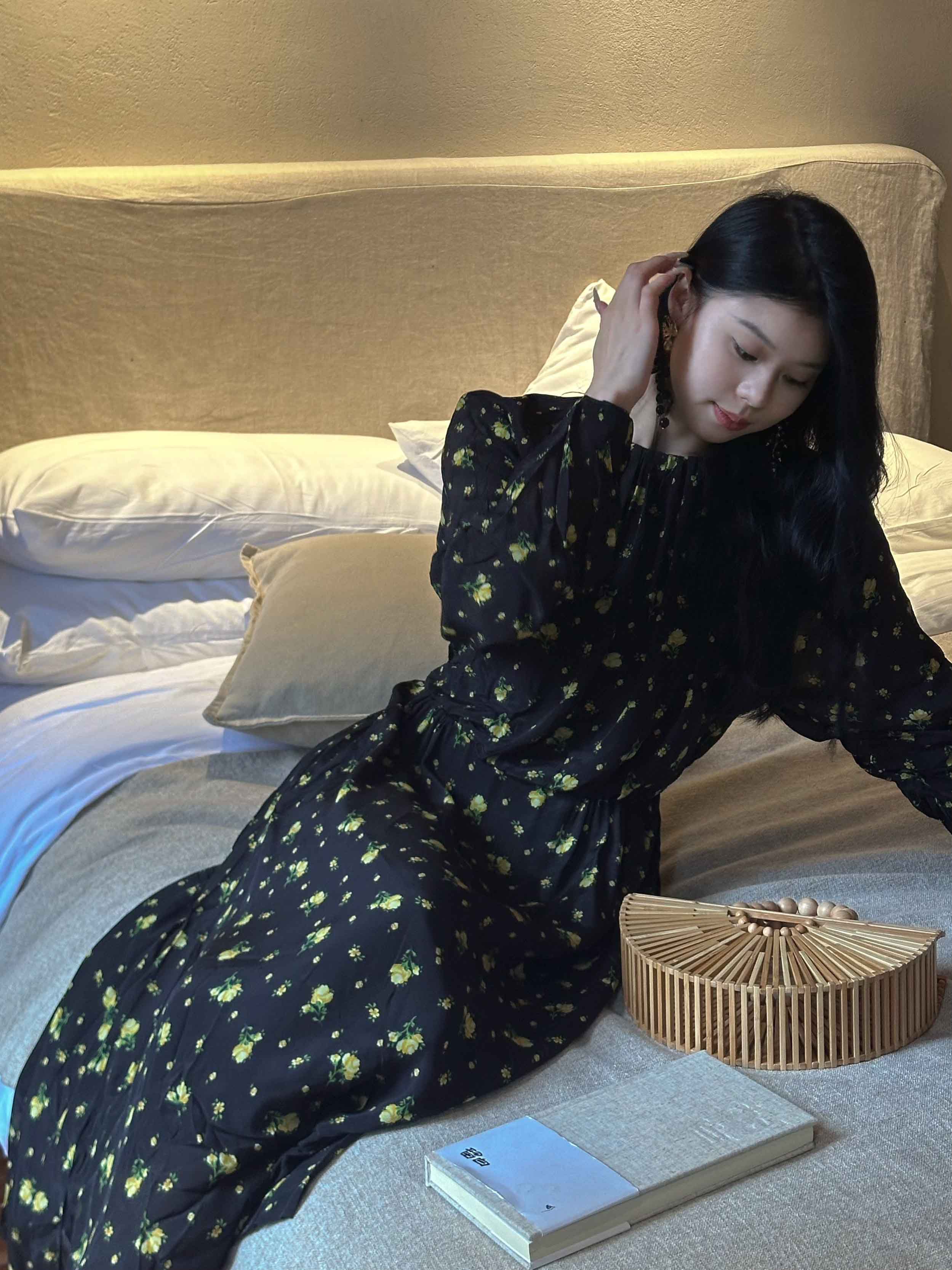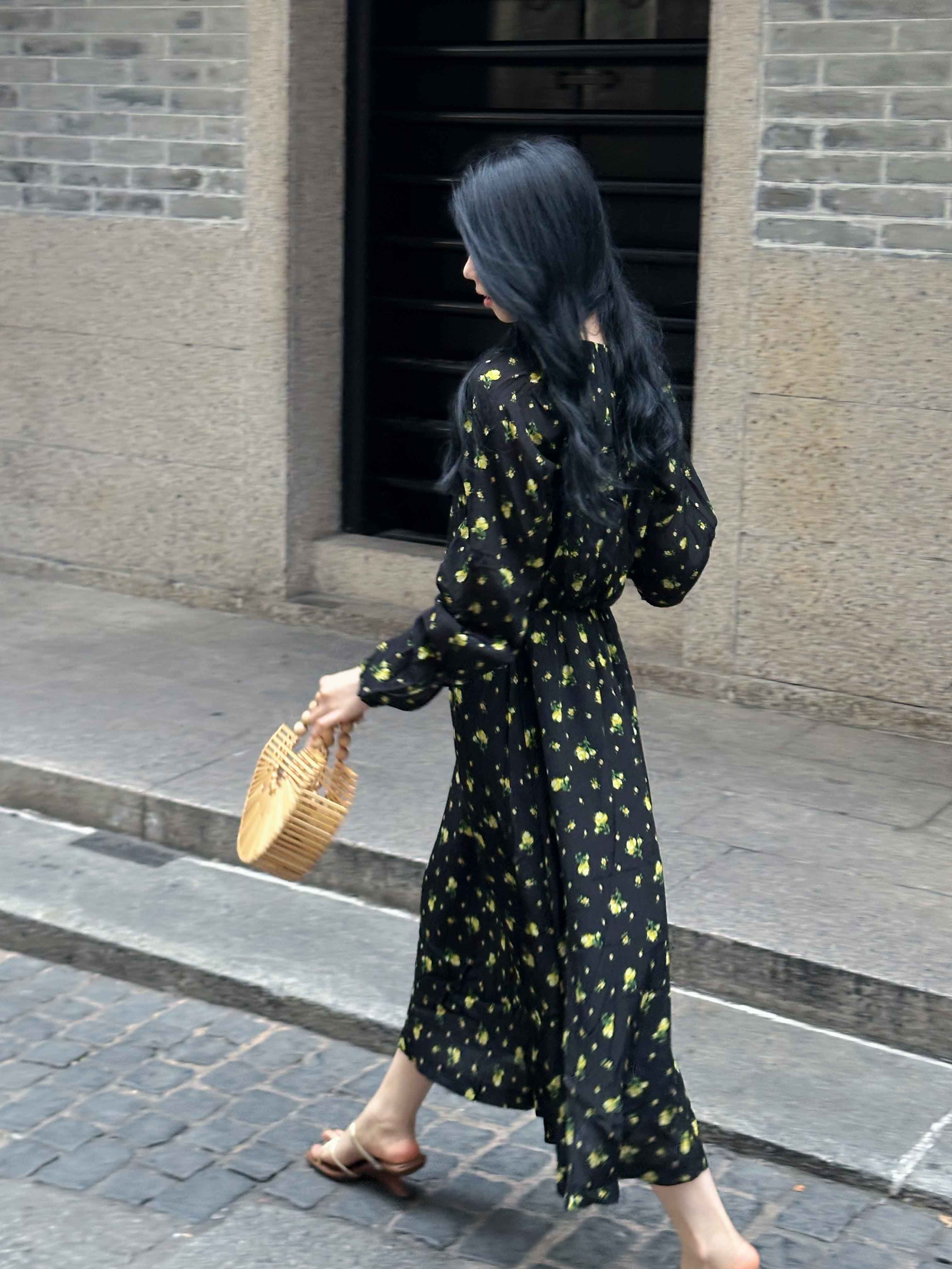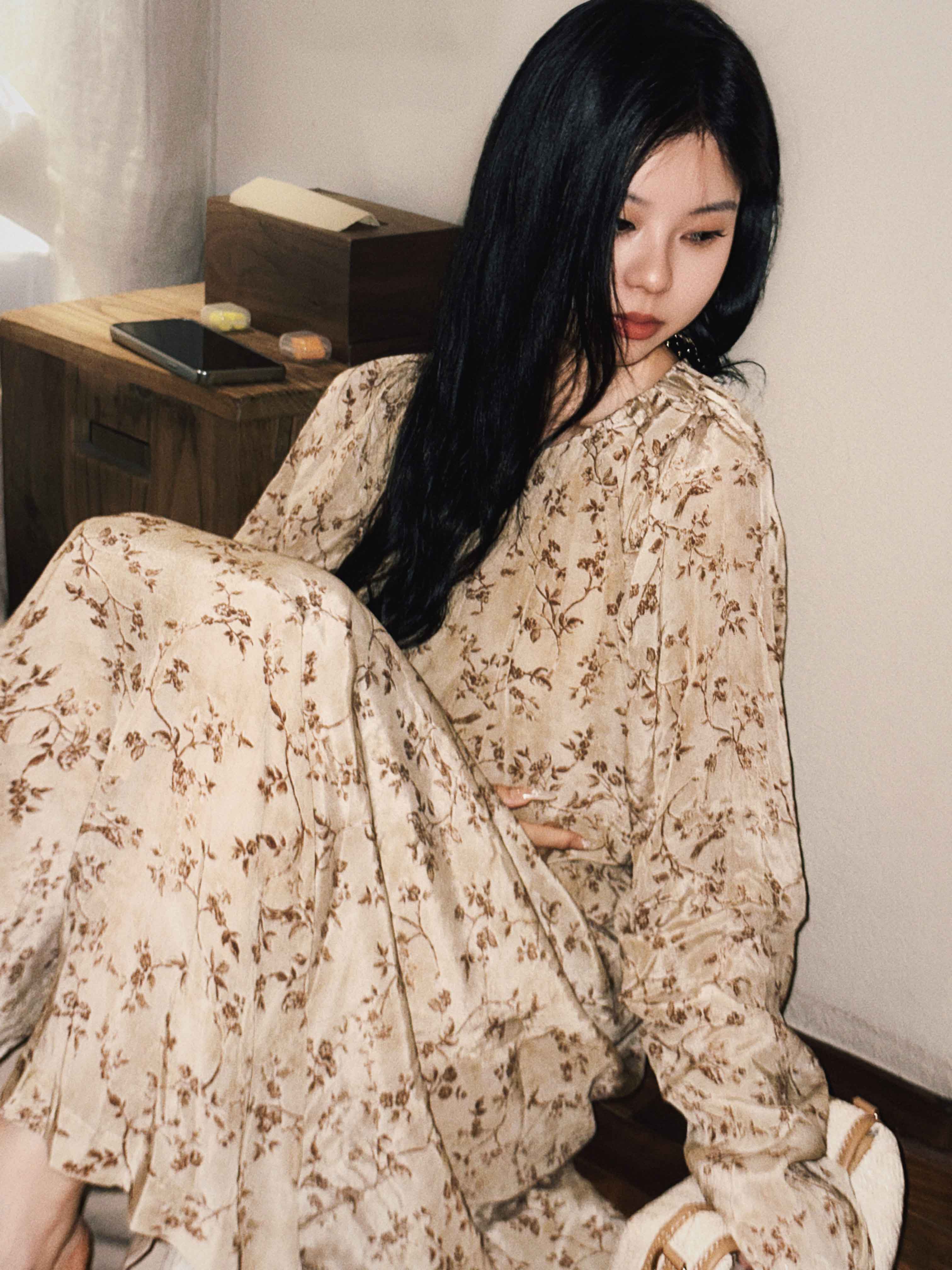 顺丰包邮洛诗琳15754春季新款气质人丝清新印花抽褶连衣裙女50748