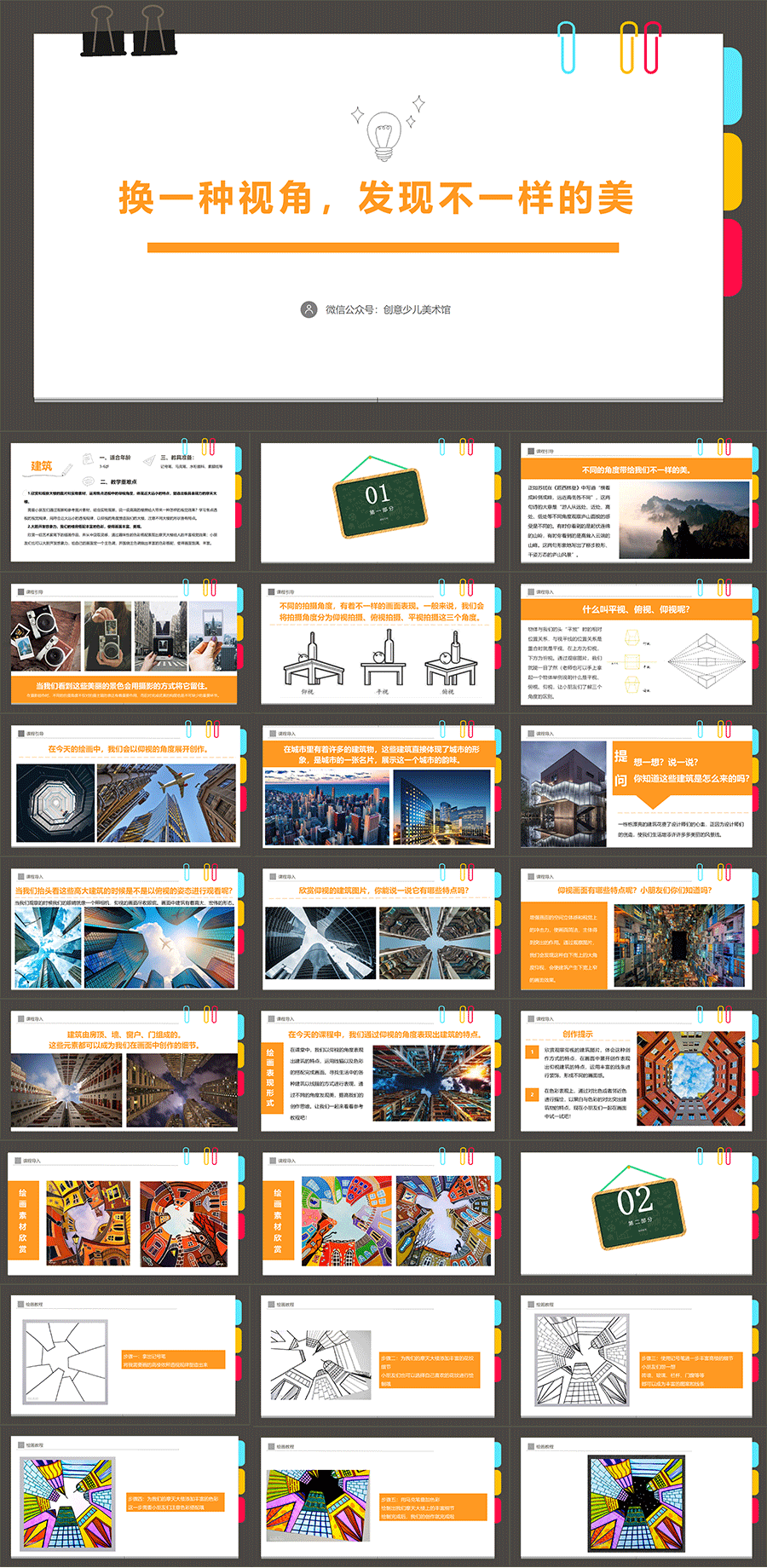 需要小朋友们通过观察和参考图片素材,结合实物观察,说一说高高的楼房给人带来一种怎样的视觉效果?学习焦点透视的视觉规律,用符合近大远小的透视规律,以仰视的角度塑造我们的大楼,注意不同大楼的形状各有特点。
