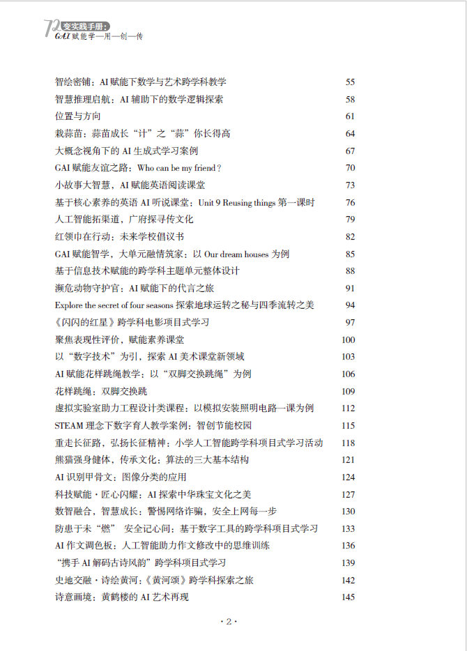 数字化浪潮下,生成式人工智能(GAI)正重塑教育教学模式。为了突破传统教学、教研的瓶颈,我们编撰了《72 变实践手册:GAI 赋能学—用—创—传》,助力一线教师实现技术与教学的深度融合。