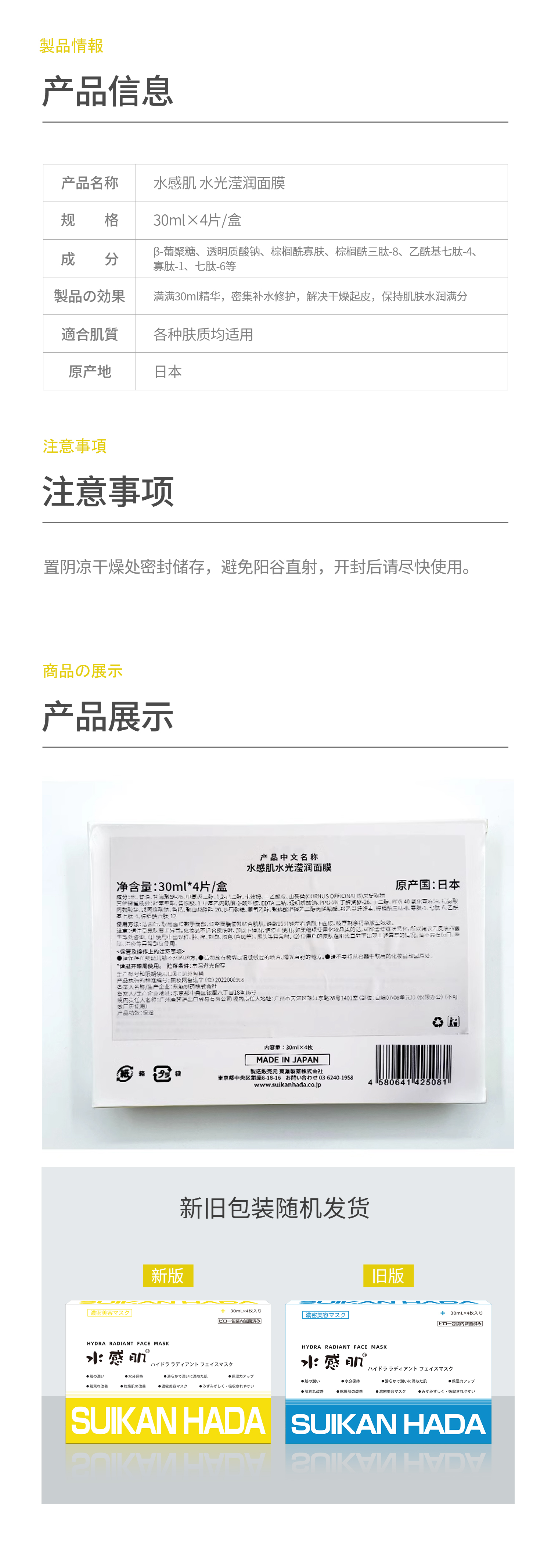 【正品直售】日本水感肌水光面膜30ml*4片 补水美白修复养出素颜女神肌