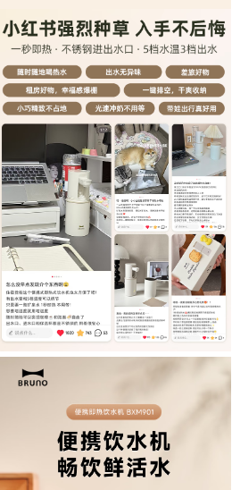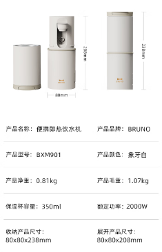 它小巧便携,可轻松放置于办公桌、车内或旅行包中。即热功能,让你无需等待,3秒即可畅享热水。精准控温,满足不同饮品对水温的要求。无论是清晨的一杯暖茶,还是工作间隙的一杯咖啡,它都能迅速为你备好。时尚外观,强大功能,是你生活中的贴心饮水助手。选择BRUNO便携即热式饮水机BXM901,畅享便捷、健康的饮水生活!