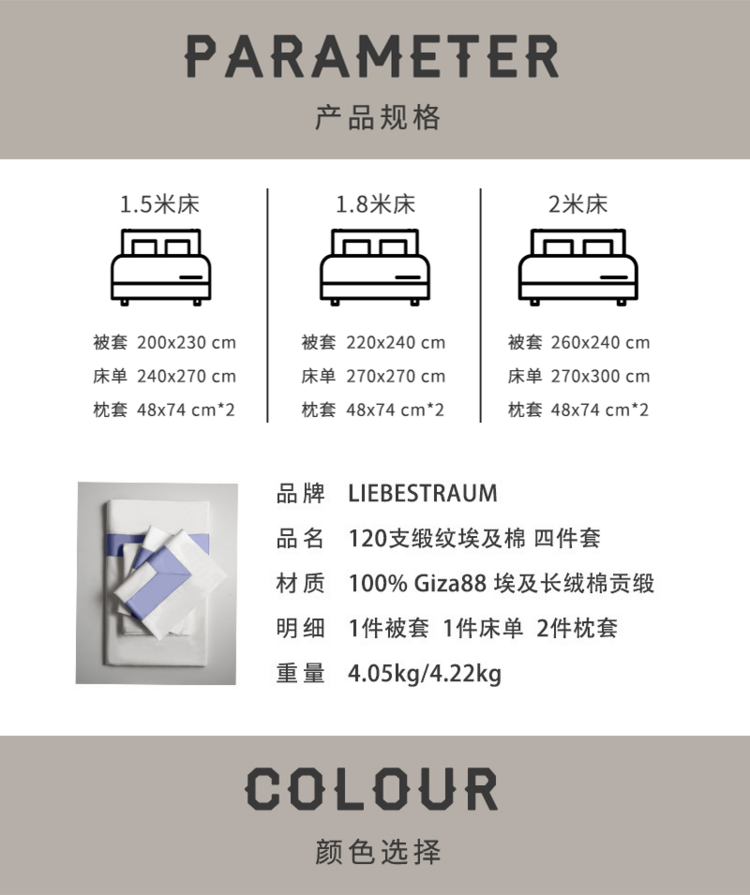 Liebestraum莉帛斯陶120支埃及长绒棉贡缎四件套 图兰朵系列(5个经典颜色)