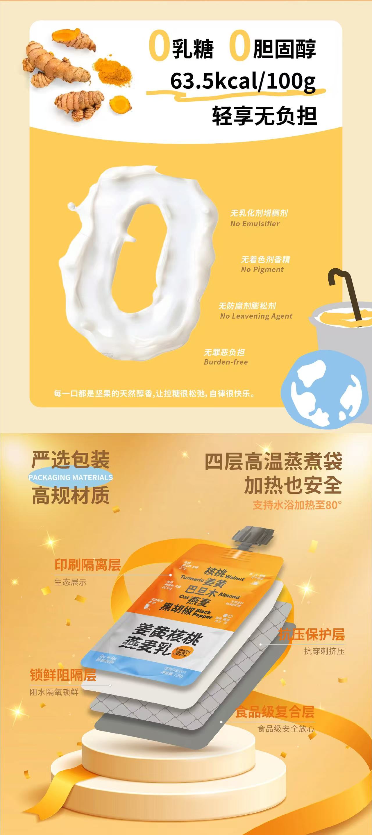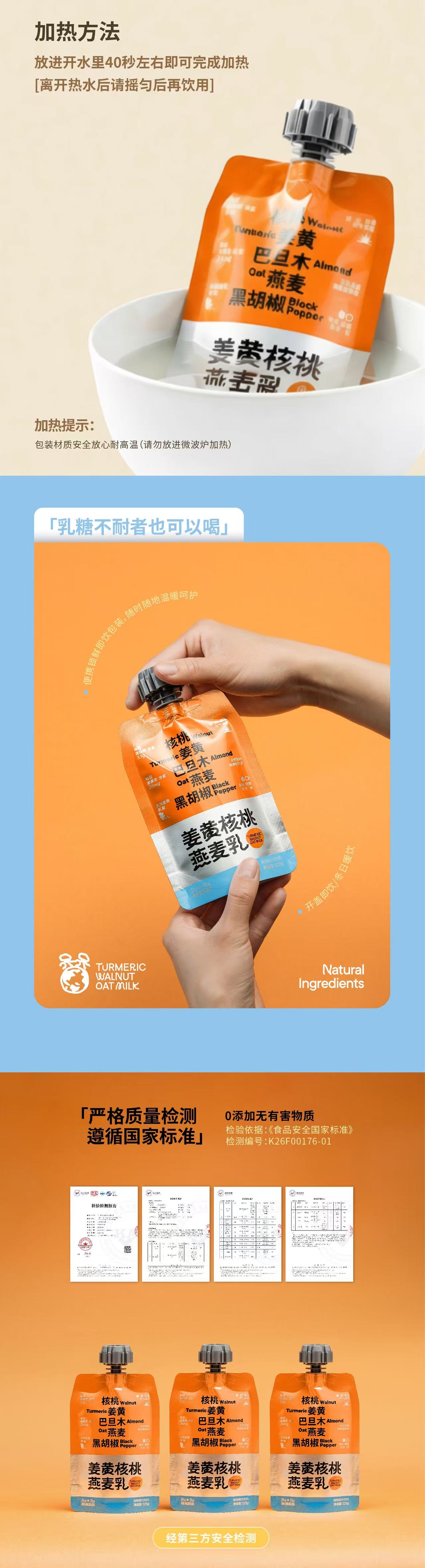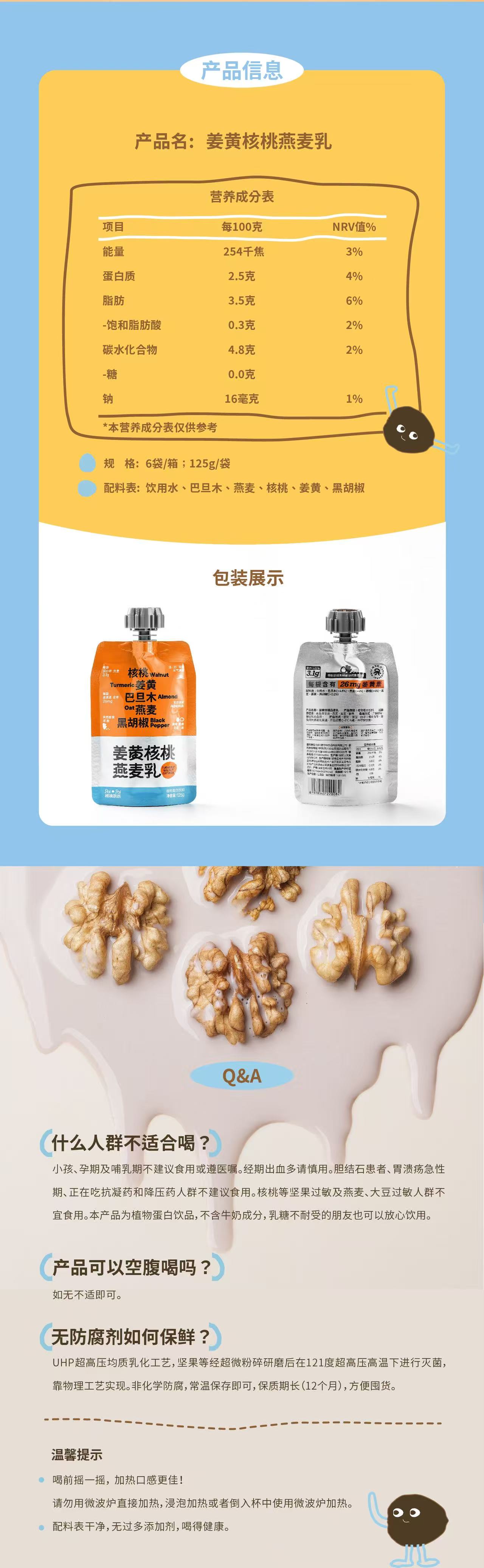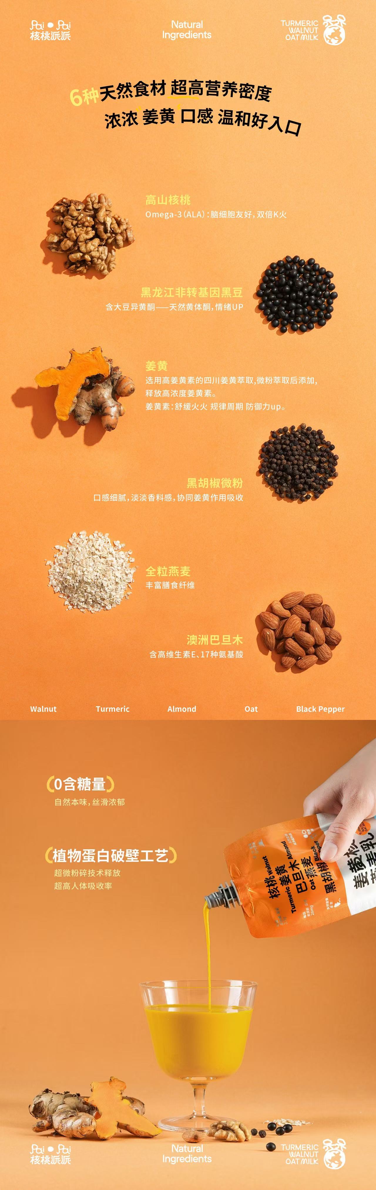 0添加姜黄核桃乳 低糖/无糖核桃坚果乳 纯植物基 0乳糖0胆固醇0增稠剂0防腐剂 热量仅仅57.5大卡/100g起 富含Omega-3/6、磷脂和钙镁