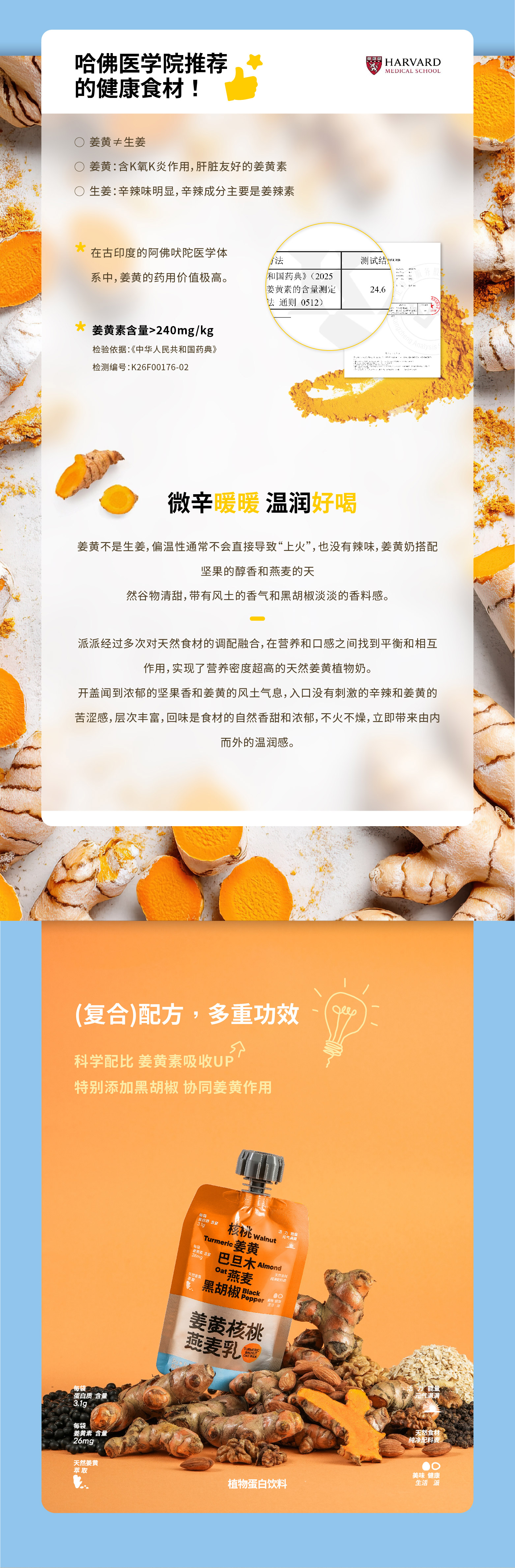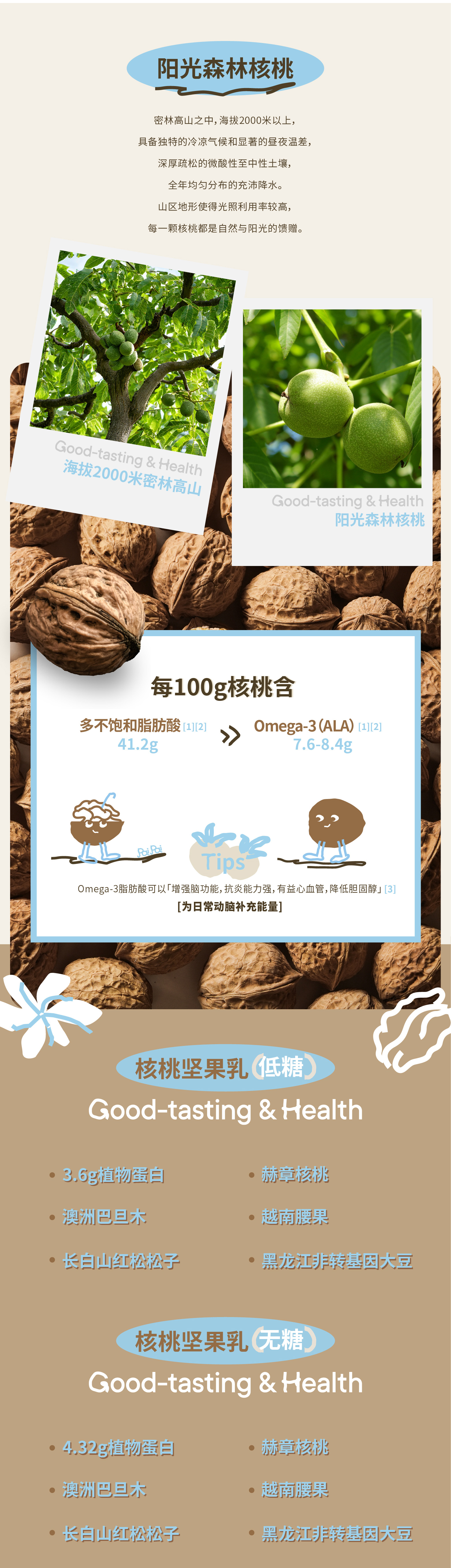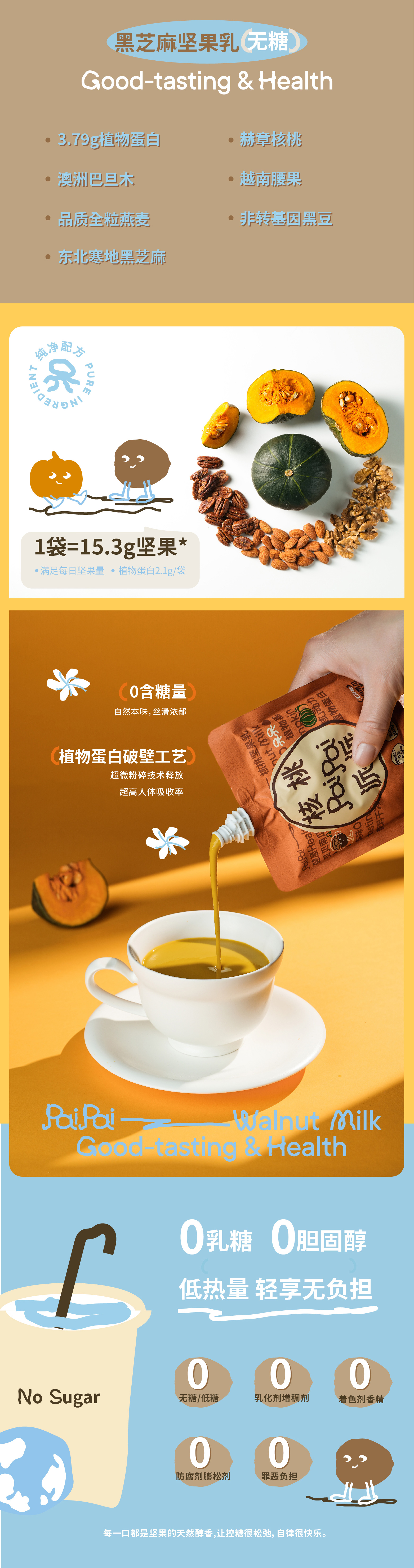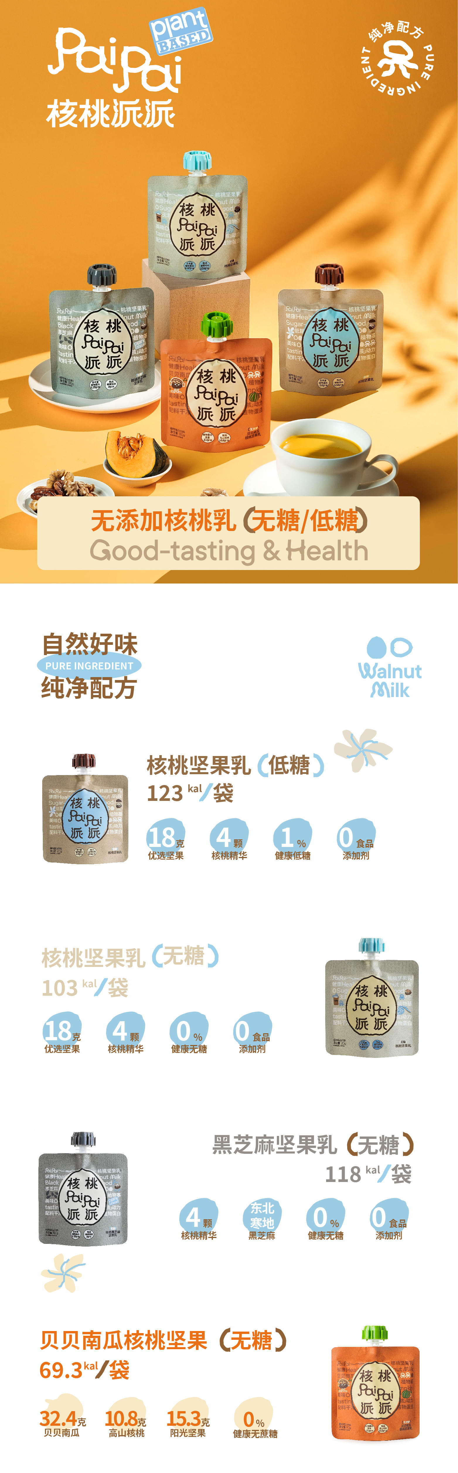 0添加姜黄核桃乳 低糖/无糖核桃坚果乳 纯植物基 0乳糖0胆固醇0增稠剂0防腐剂 热量仅仅57.5大卡/100g起 富含Omega-3/6、磷脂和钙镁