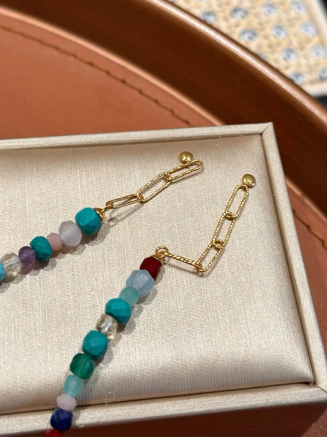 宝石配色方面也是非常大胆,包含绿玛瑙,绿松石,月光石,紫水品,柠檬石英,粉红色欧泊,青金石等,用七彩宝石打造别出心裁的配色,展现项链跟手链的流光溢彩,让男女佩戴都能焕发生机活力感觉,让它成为你的个性化珠宝享受这个玲珑色彩的季节。 严格臻选每一颗宝石,由16种宝石,手工单独切割,手工串联而成,以展示其别致的美感蕴含固人宣言与象征意义的结合,金属部分全部是925纯银电镀18K真金,保色完全可以放心,而且咱们家的金属部分一直都是广受好评的,研磨2次以上质感,电镀出来光滑细腻,超有质感。