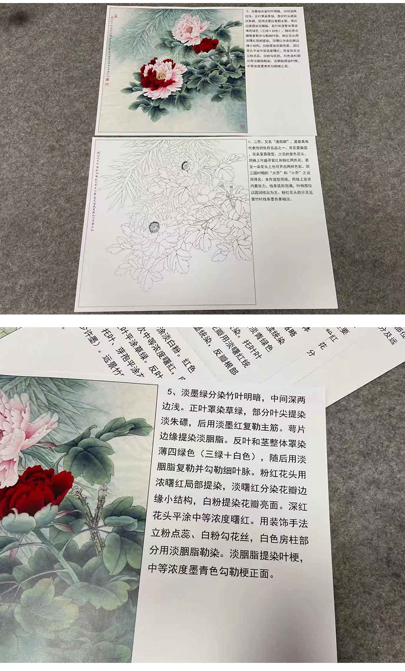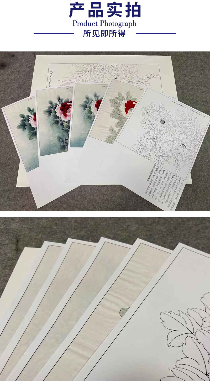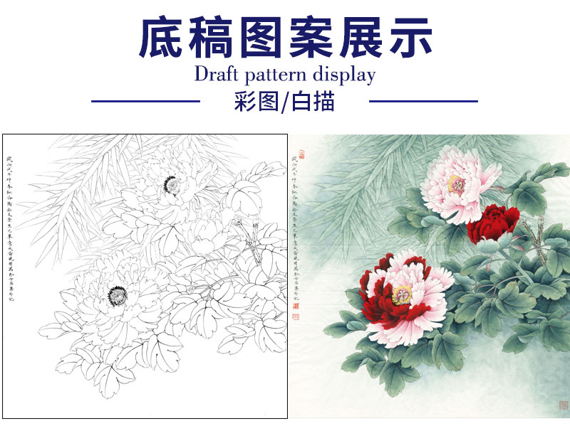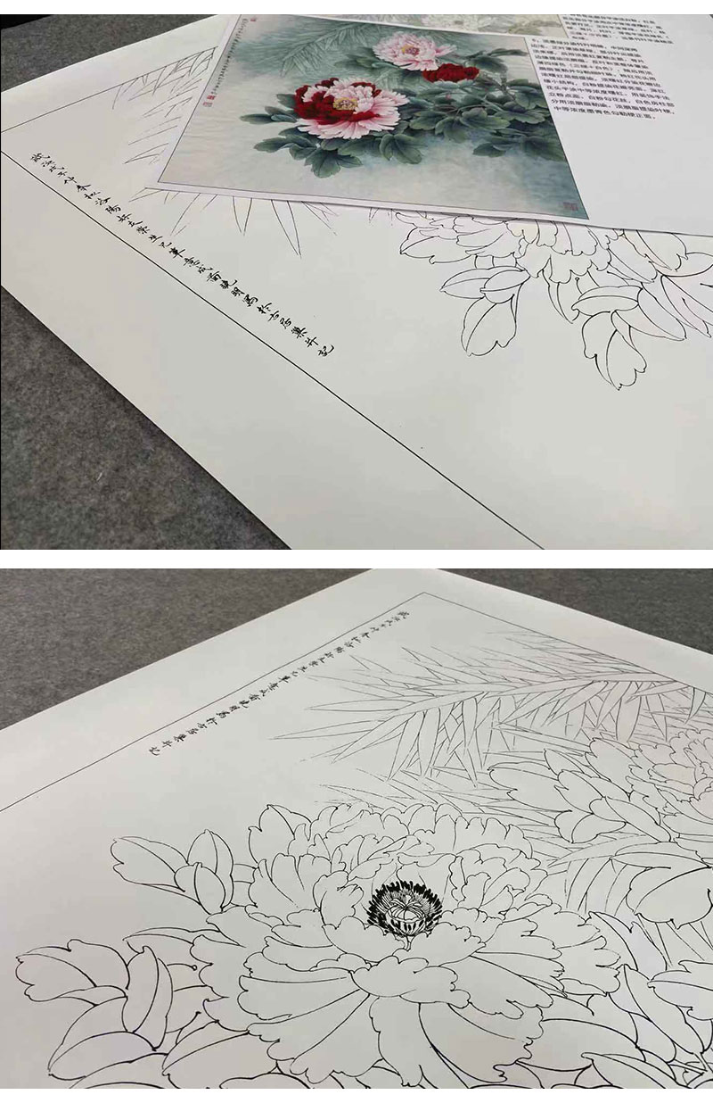【有步骤、大彩图】李晓明工笔画白描底稿斗方小品《二乔》牡丹初学者临摹花鸟线稿KD29