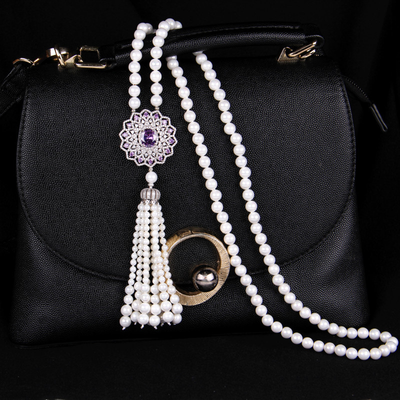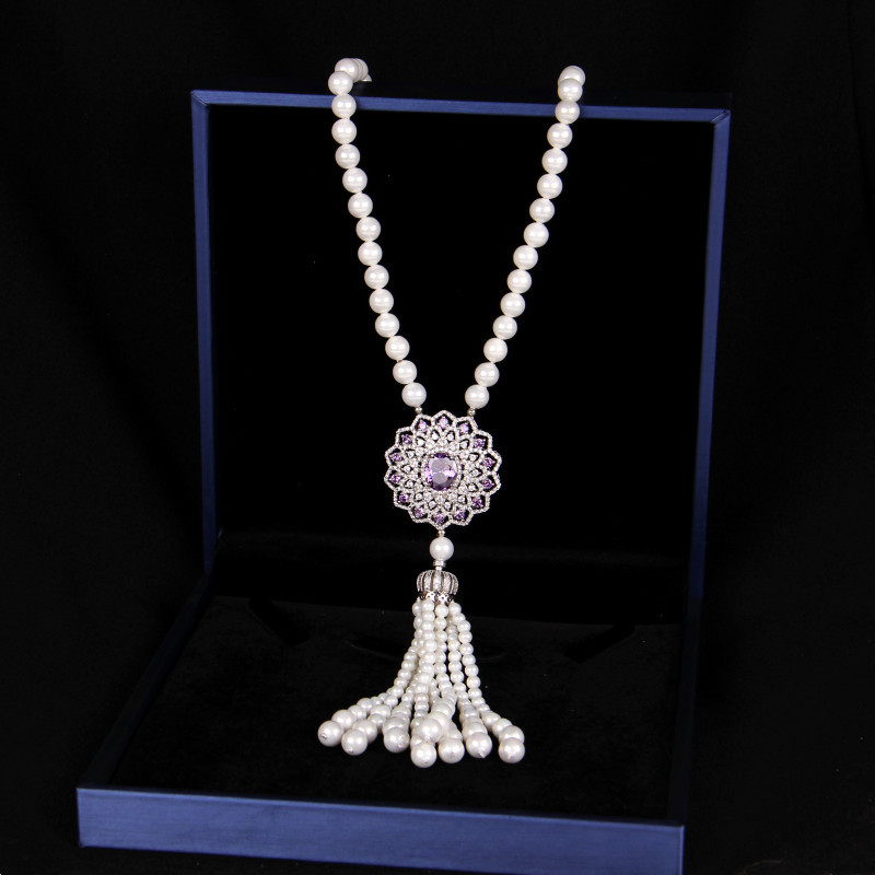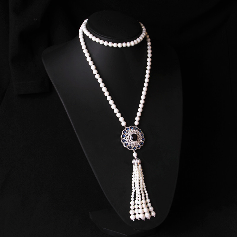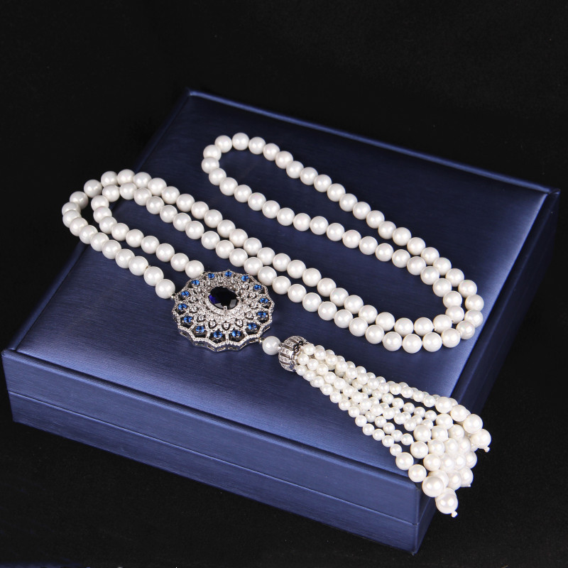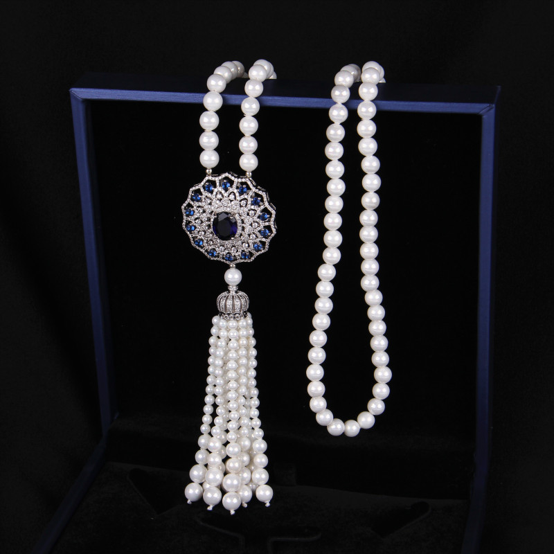 上海旗袍厂NM-MYL-2018111302欧美款天然贝壳珍珠项链长款女士珍珠毛衣链毛衣挂件微镶锆石吊坠