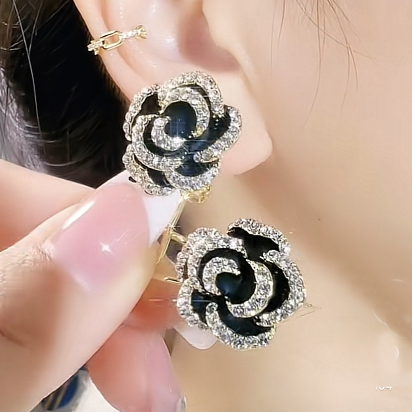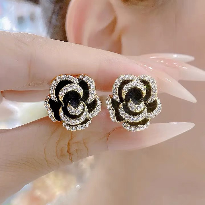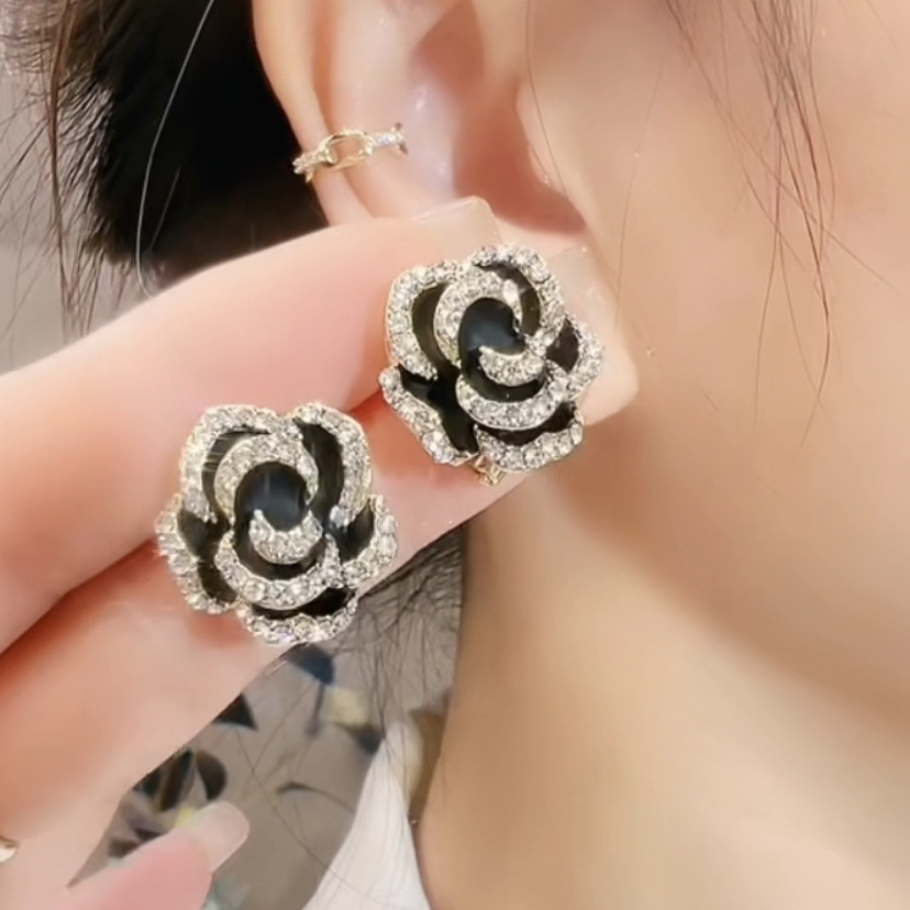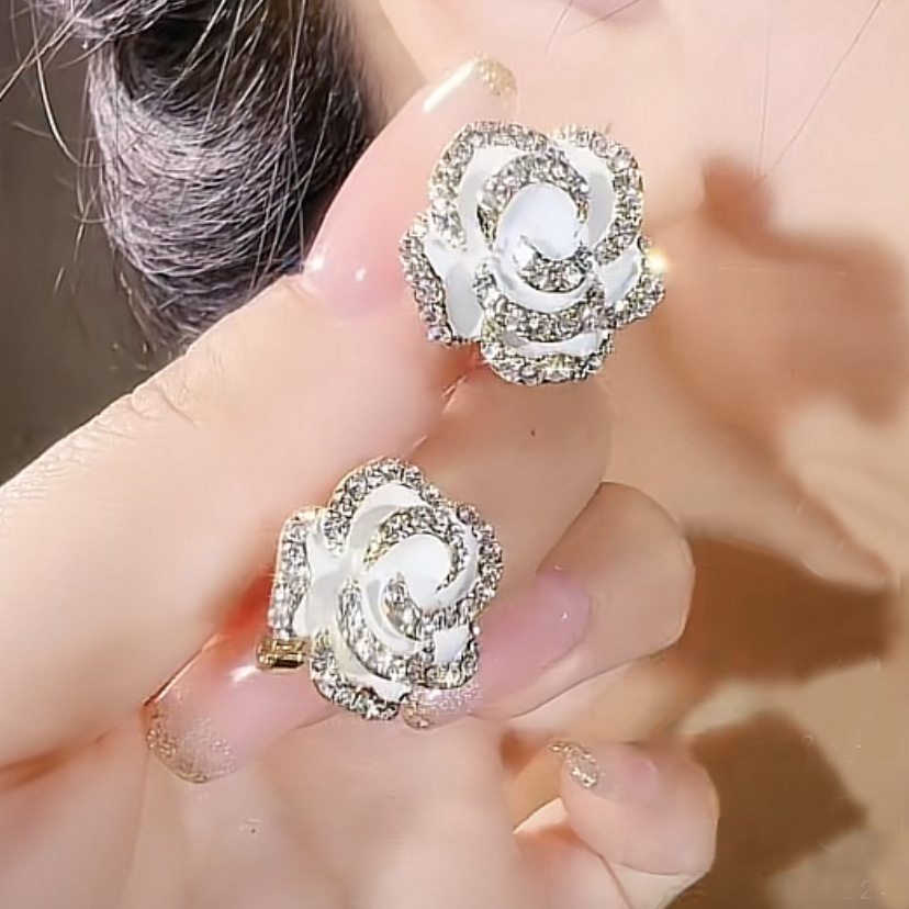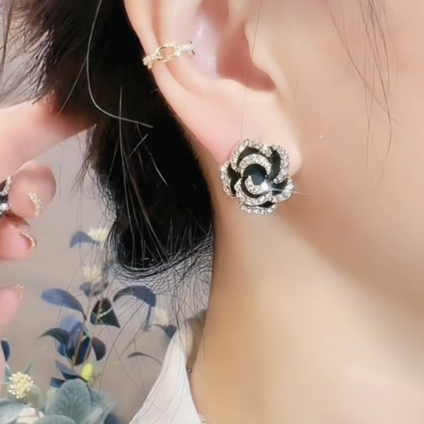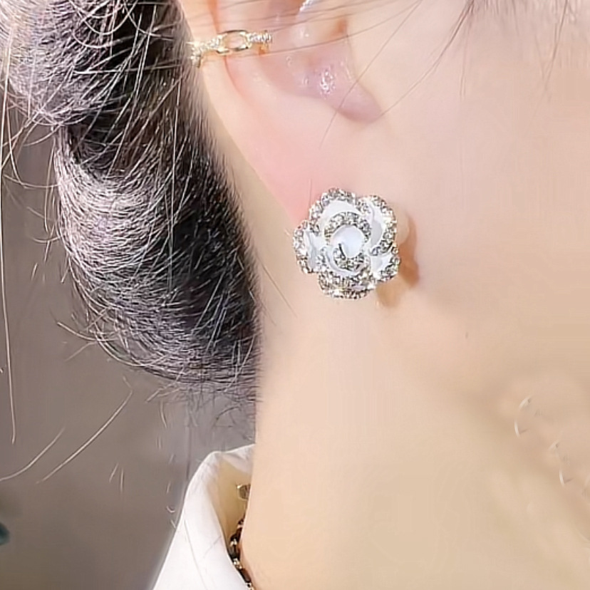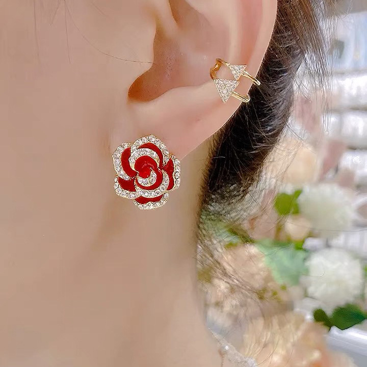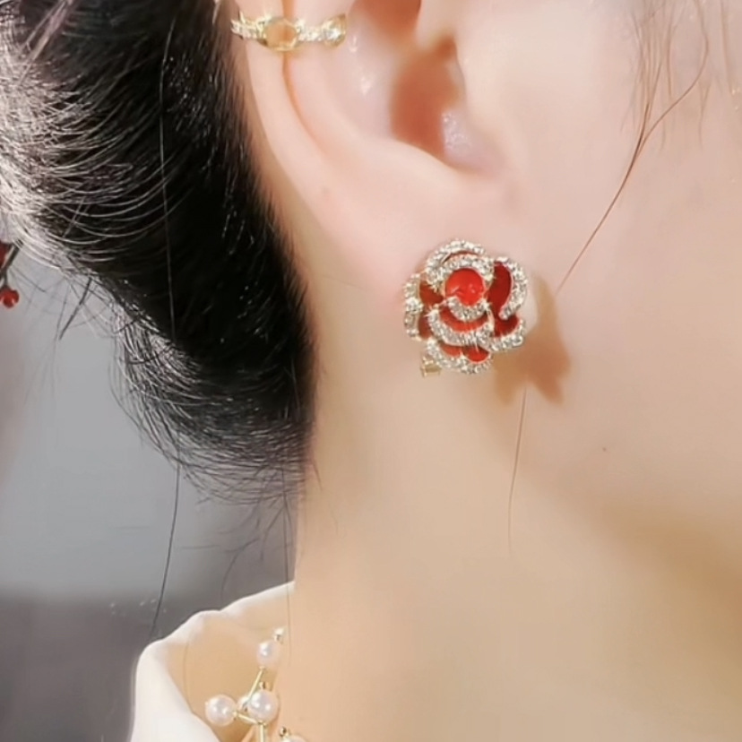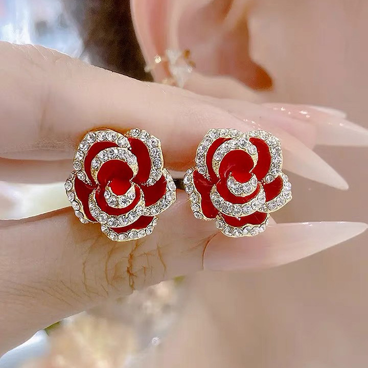 新年红色山茶花耳钉女适合过年的耳环玫瑰花网红百搭耳饰