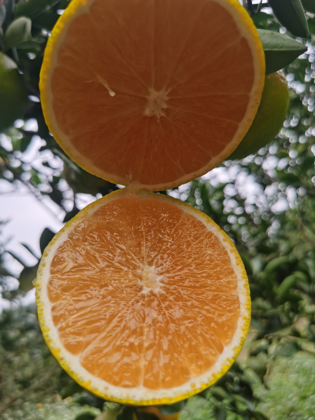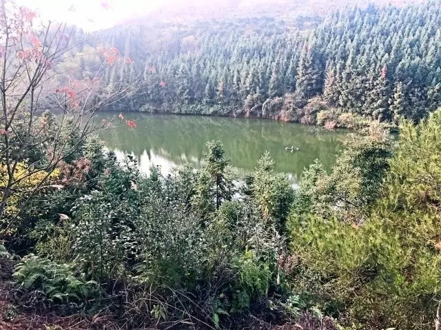 农场的桔柚和脐橙混种在一座U型山上,离果园约50米的山腰处有一座天然的湖泊,湖泊的水清澈如镜,野鸭在水中嬉戏。湖泊周围四处长满各种乔木和杂草,下午山中的雾气还未竞数散去,就像是给这片果园披上了一层薄薄的面纱。