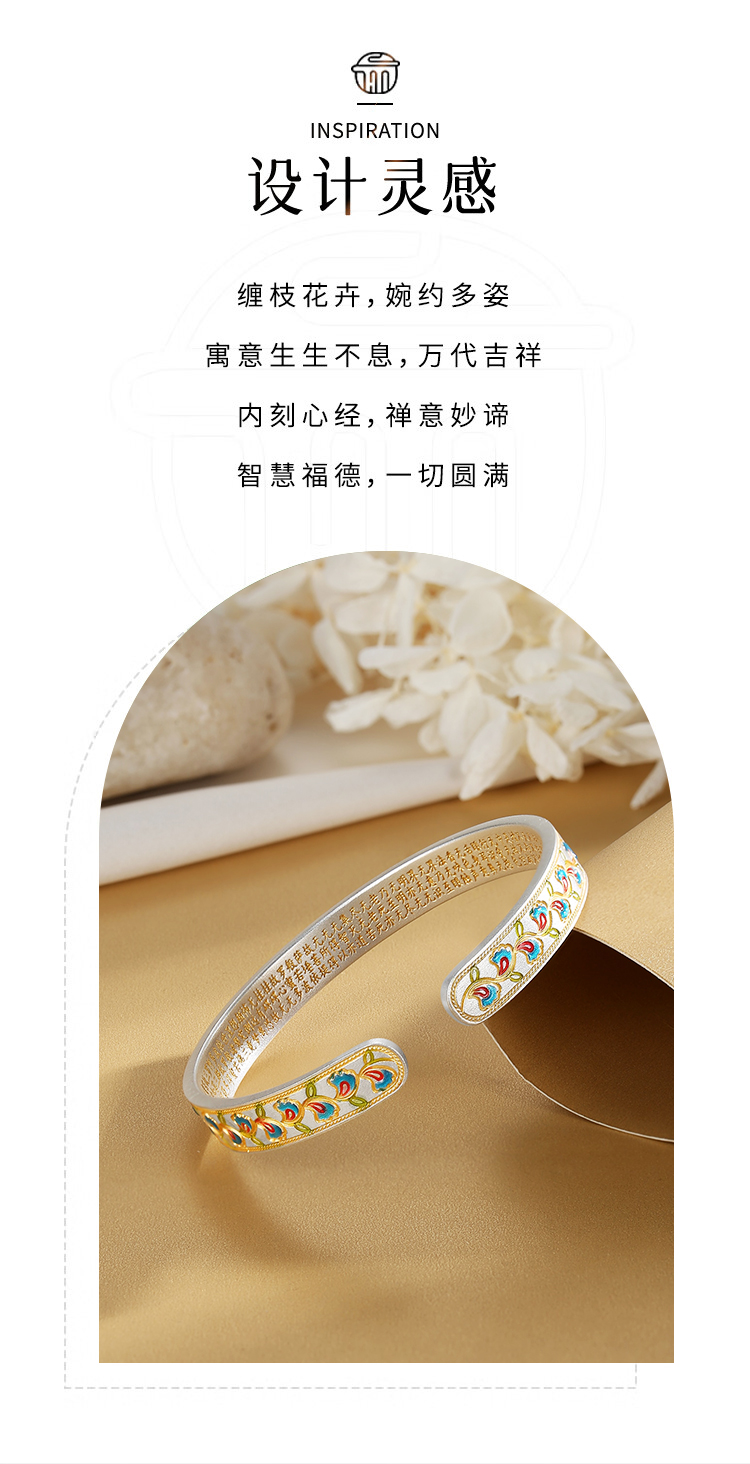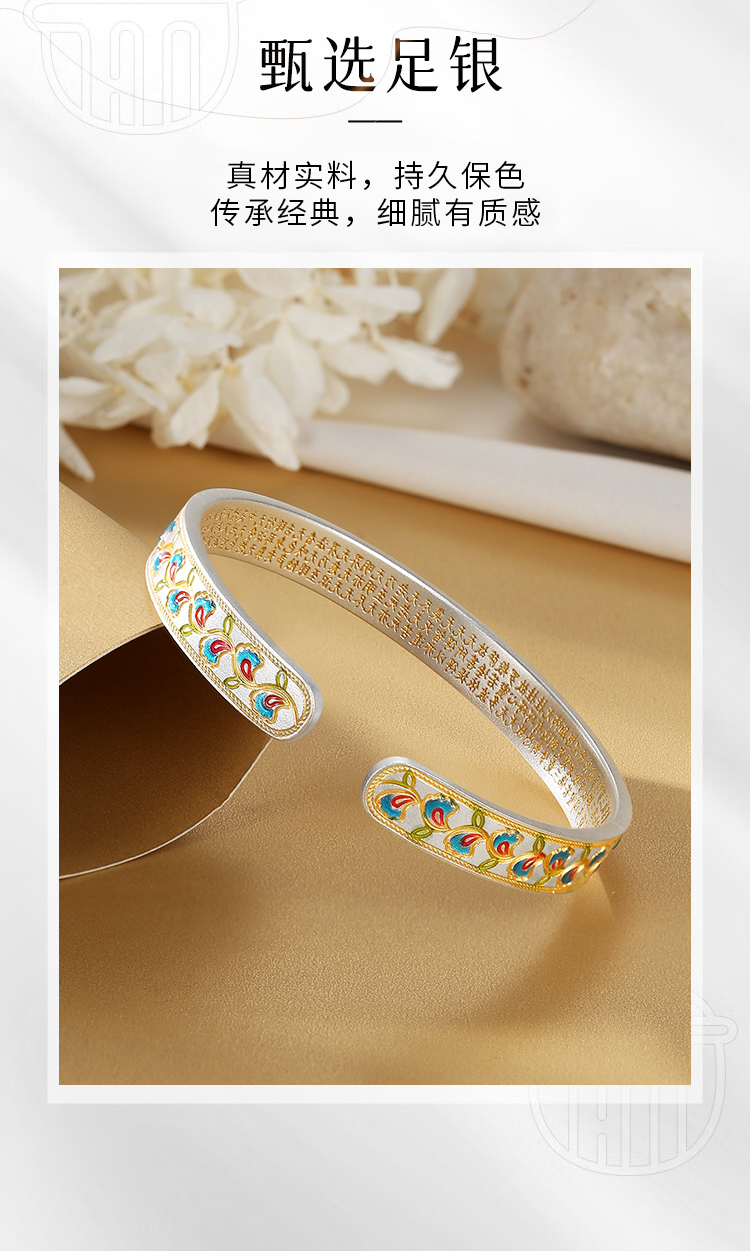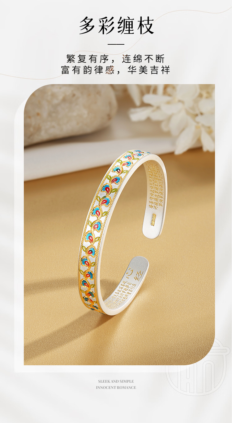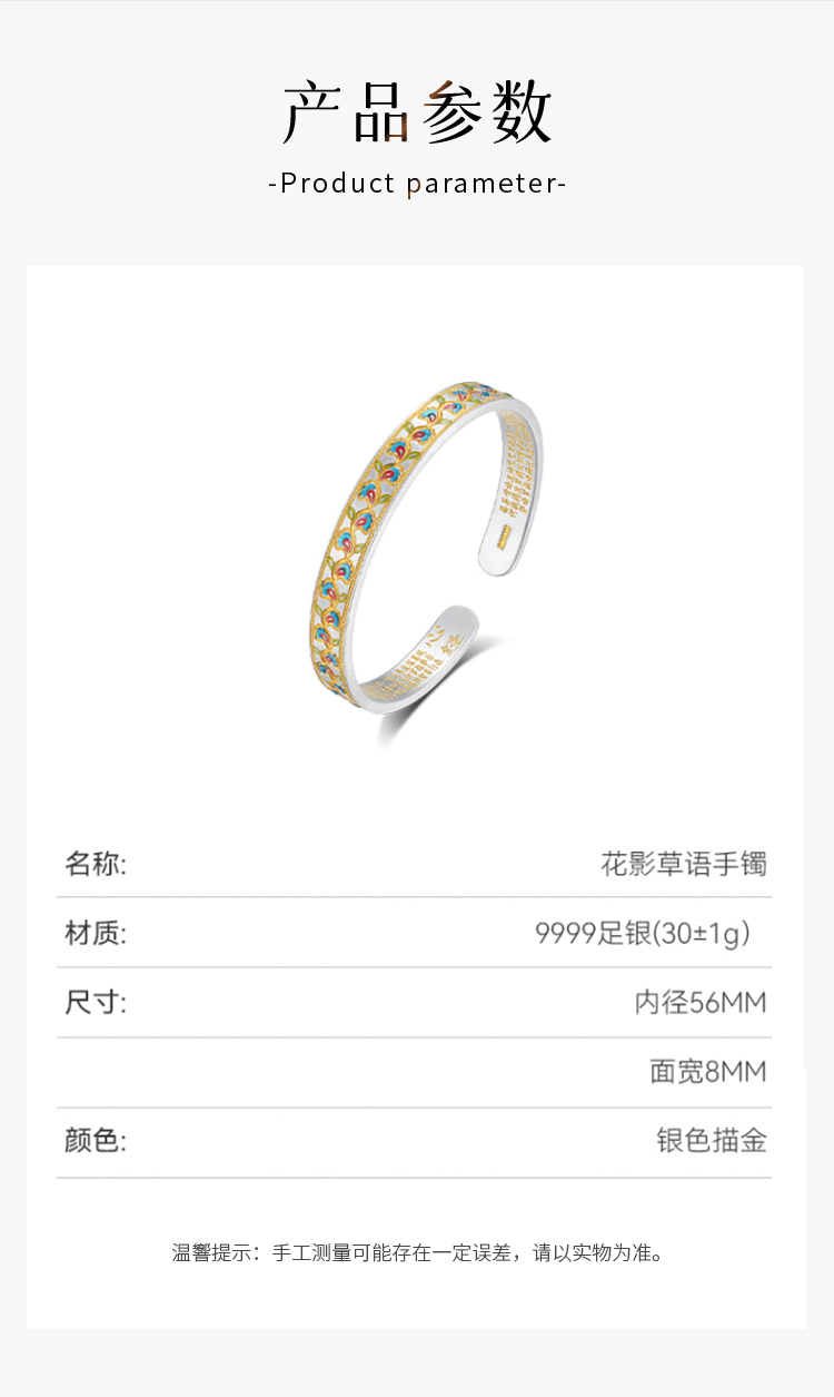 Winy 9999足银花影草语手镯银色描金滴胶工艺配证书送妈妈婆婆节日生日礼物