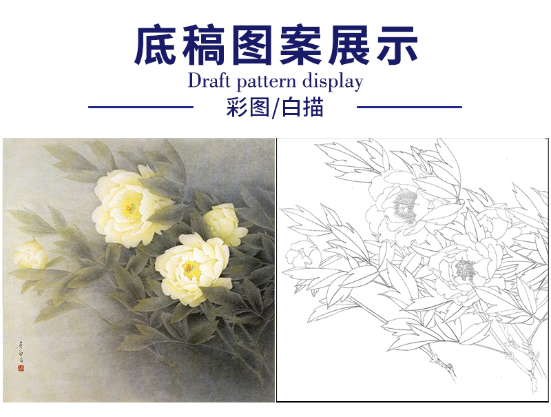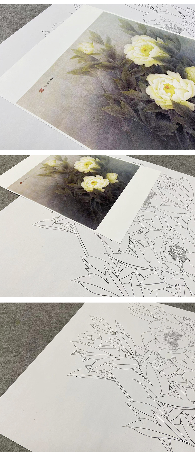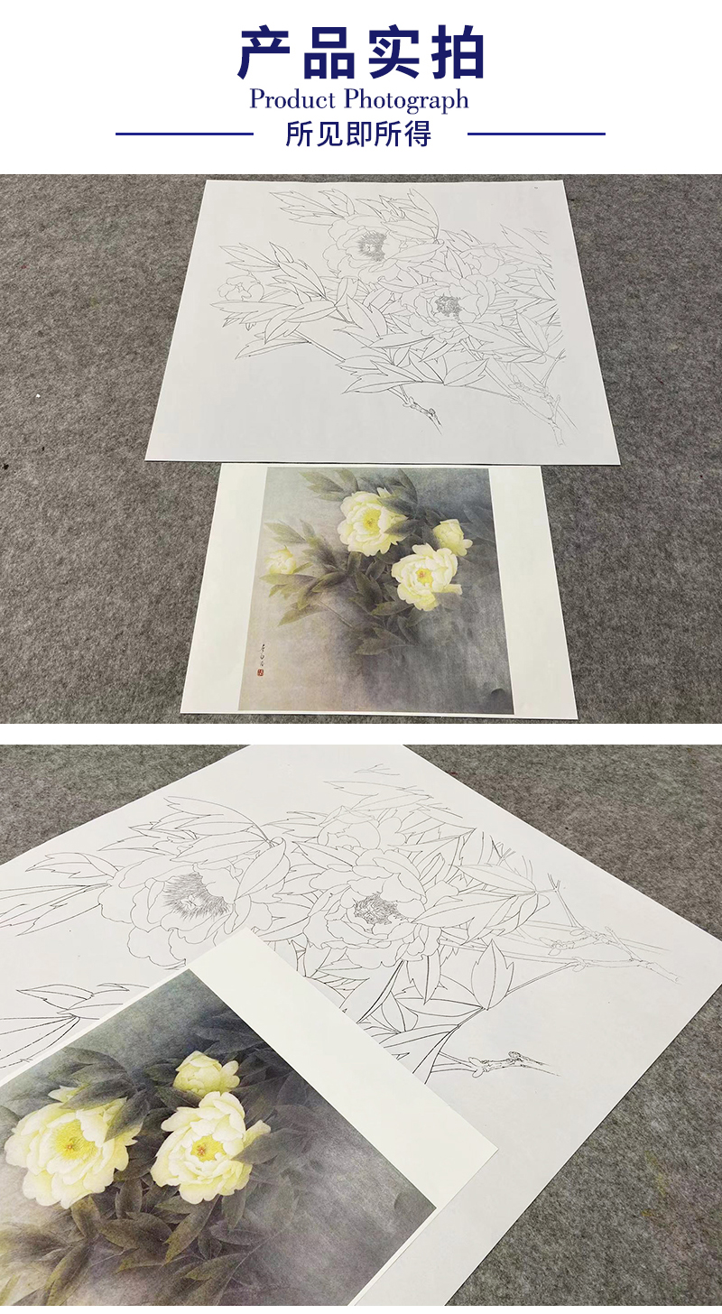 【无步骤】李长白工笔花鸟画白描底稿《黄牡丹 》斗方小品册页-LB09