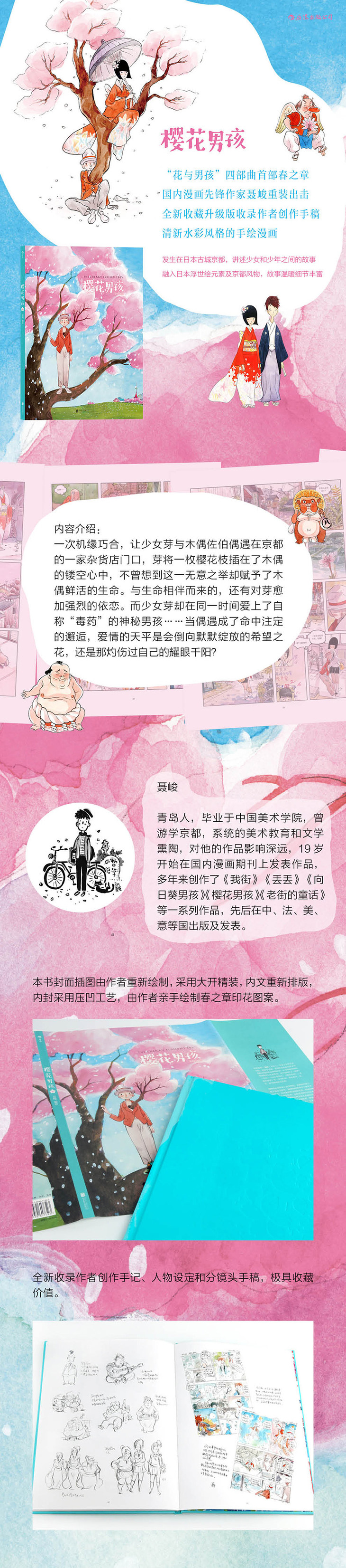 ◎ 作者聂峻对内文画面与文字进行了重整,全书蕞后附赠《樱花男孩》创作手稿及分镜展示,作者亲笔书写人物介绍和原创心路历程。