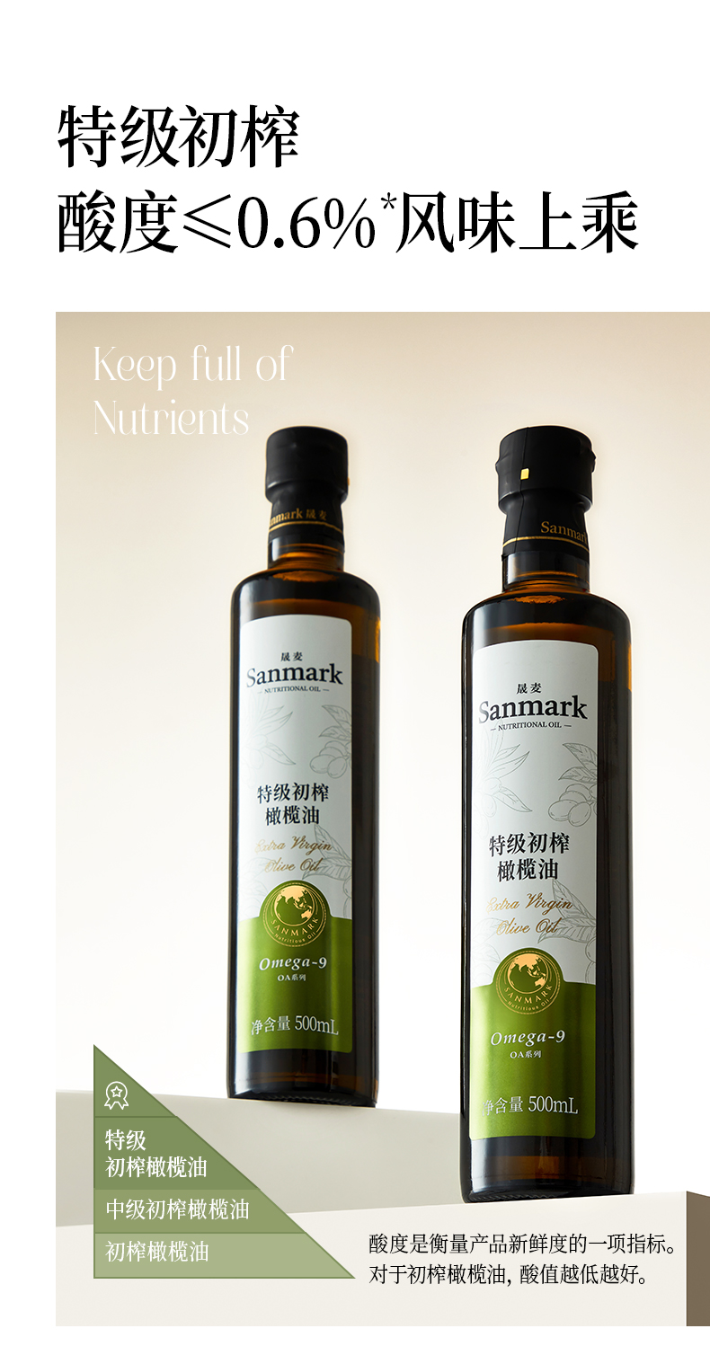 特级初榨橄榄油 500ml*2瓶(酸度≤0.6%,0反式脂肪酸)