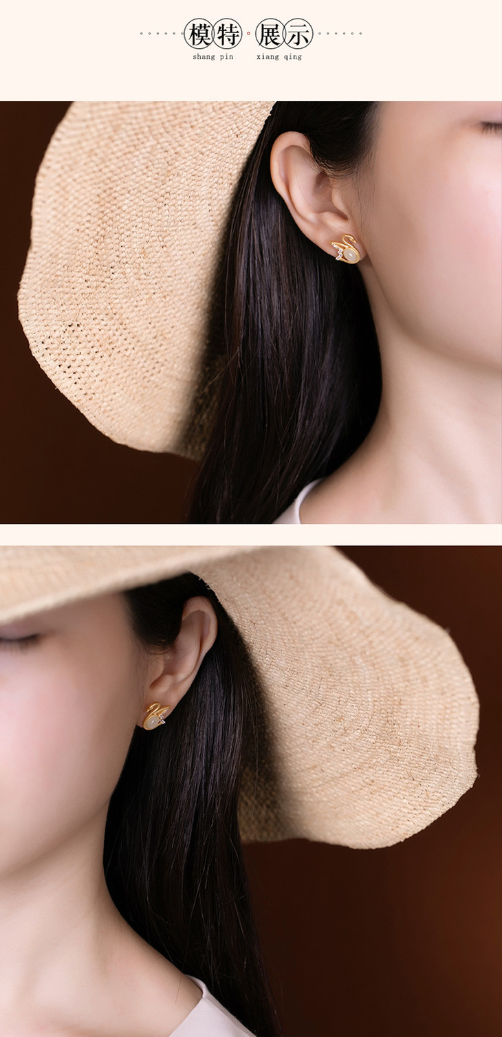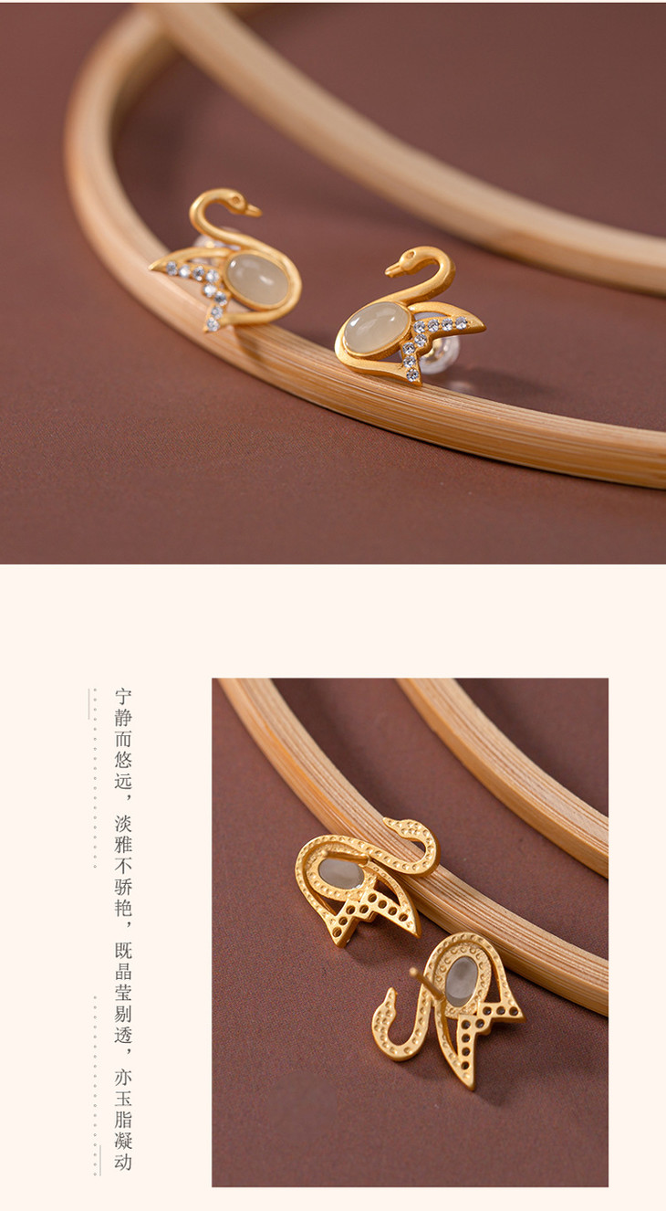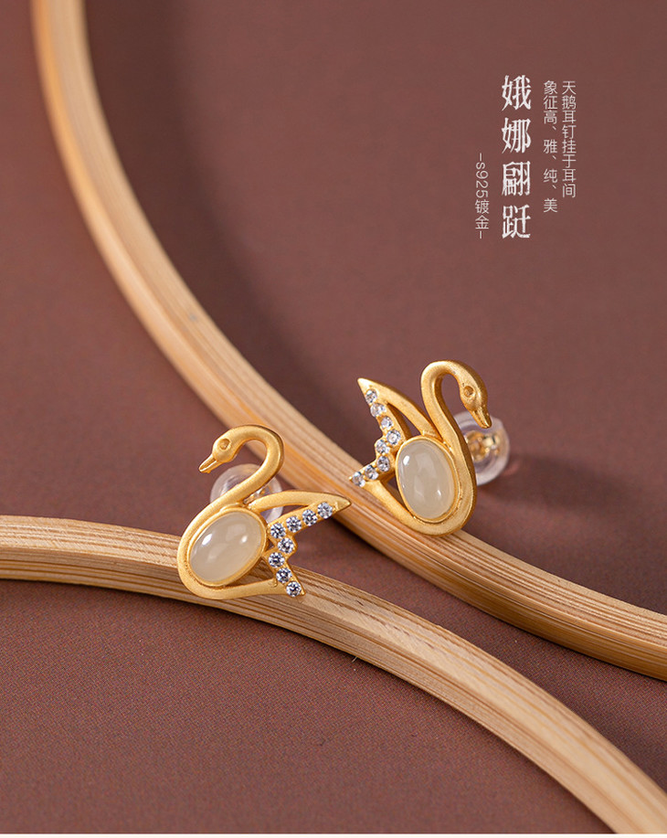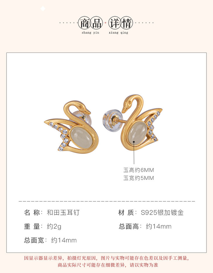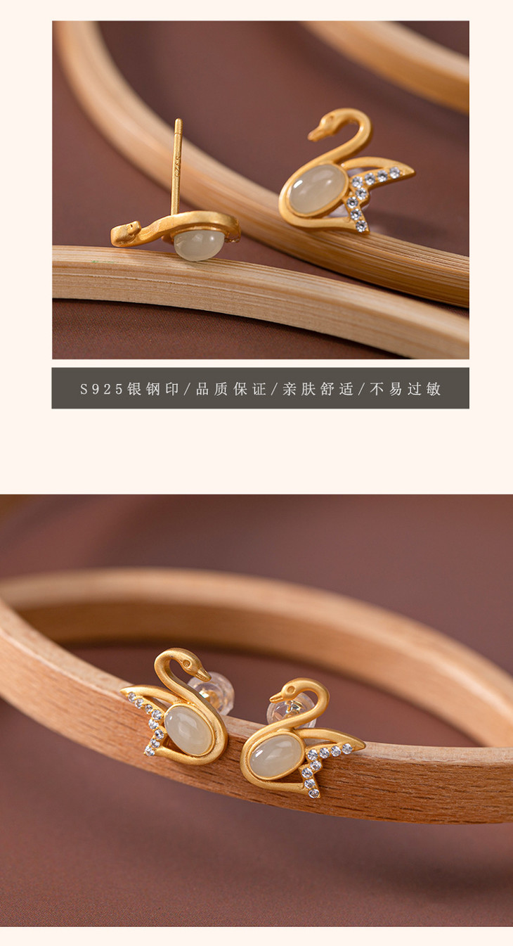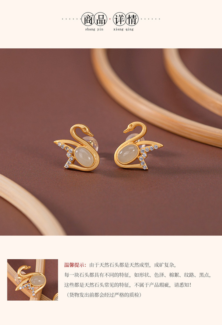 CW-S925纯银镀金和田玉白玉个性简约百搭气质天鹅耳饰