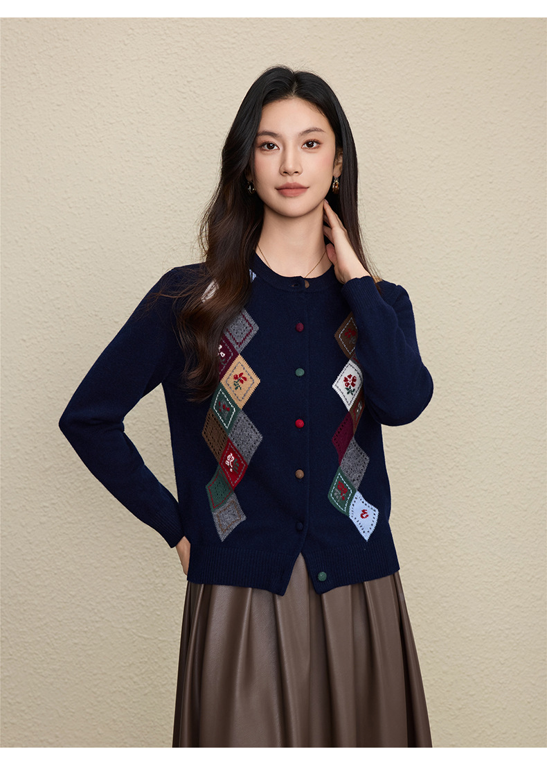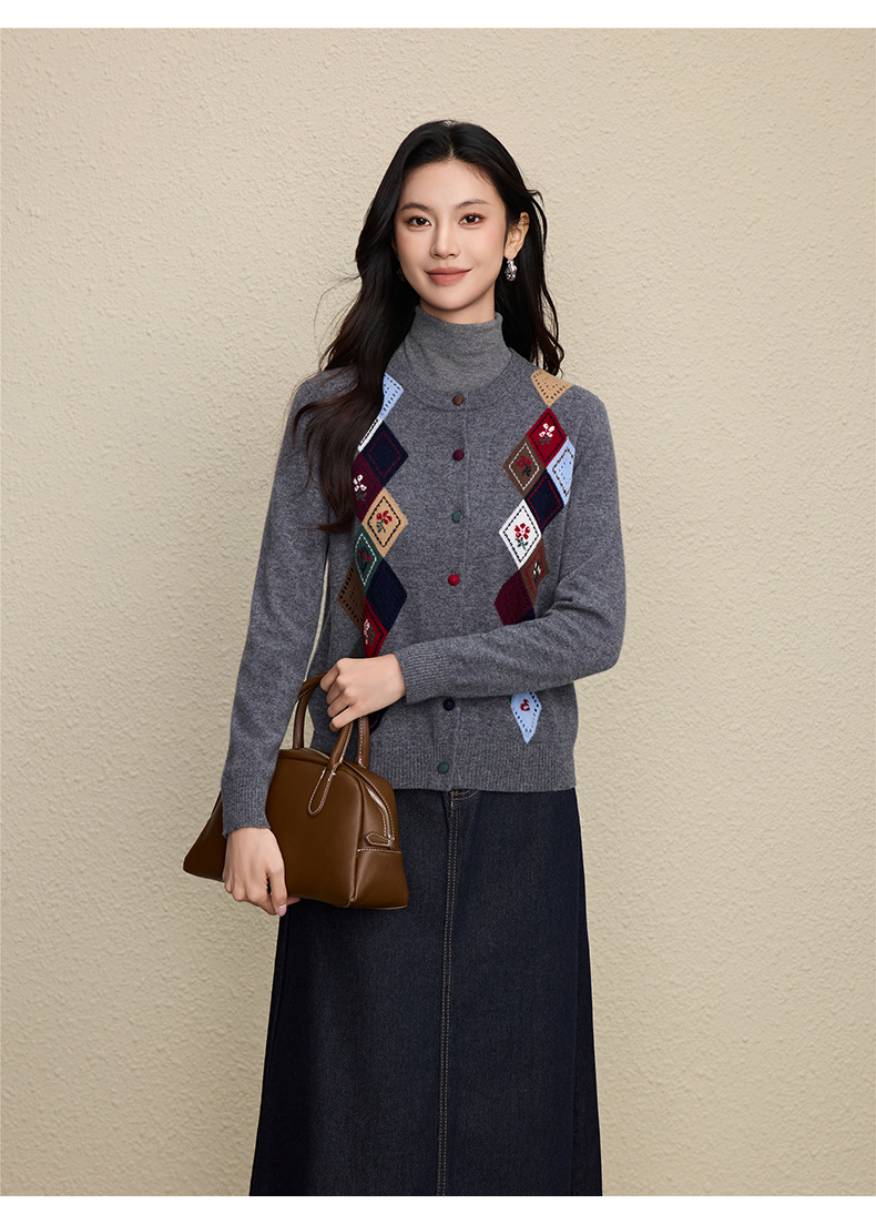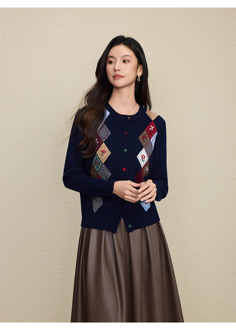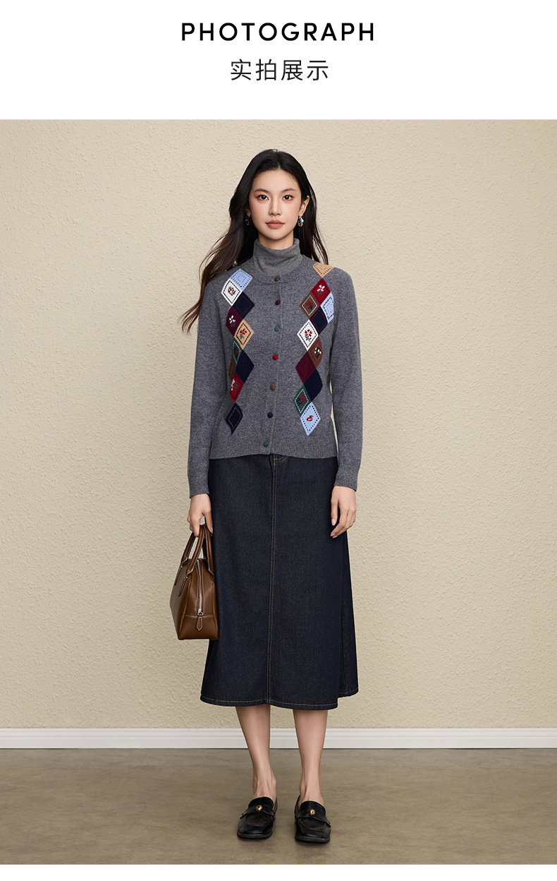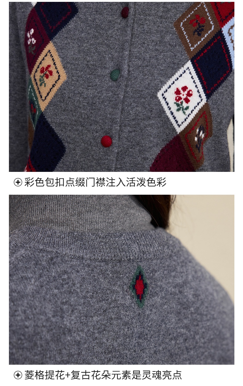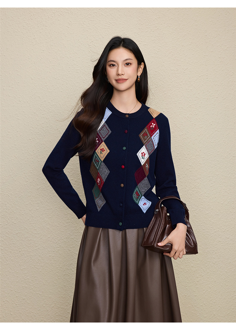 「自」全新升级【铂金会员367/天猫489/差价122】(03146)洛诗琳羊毛提花圆领开衫2025秋冬新品撞色菱形格纹针织外套