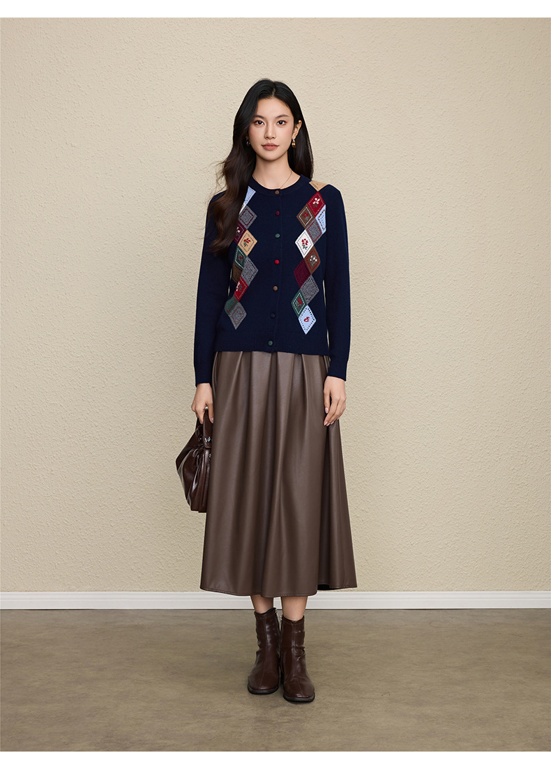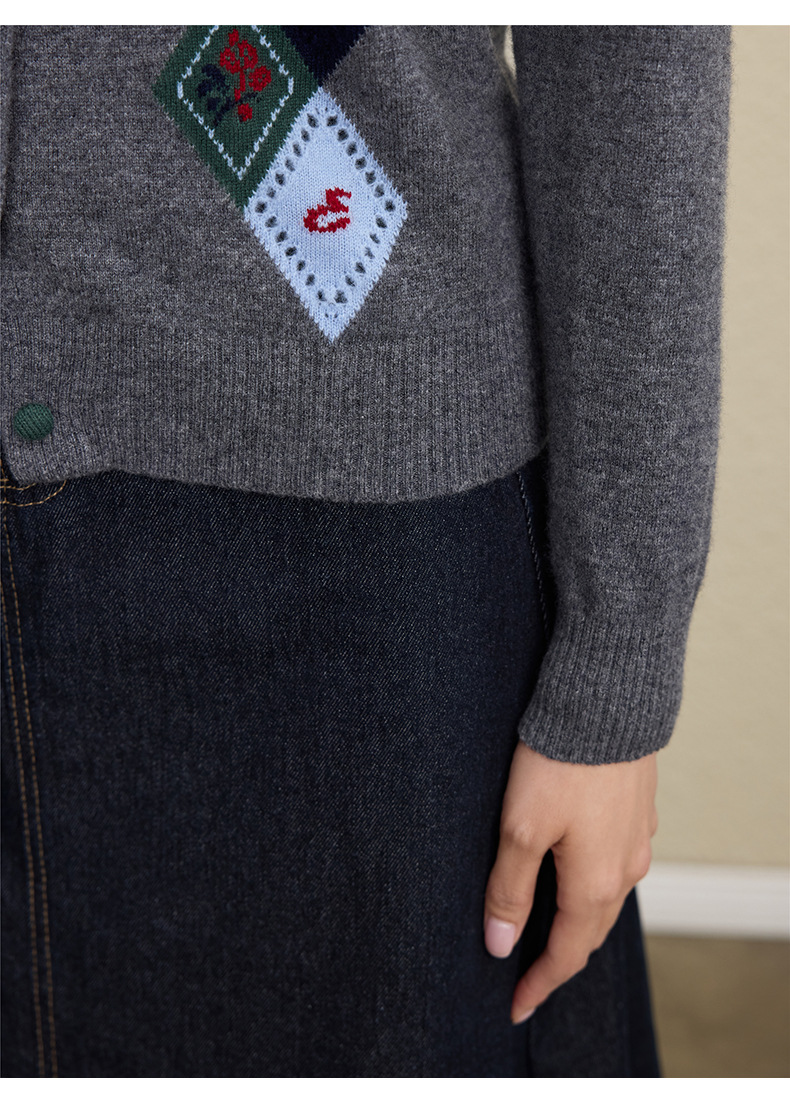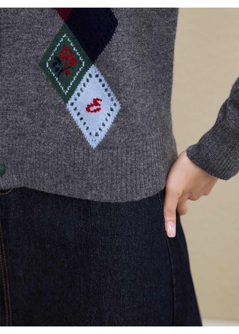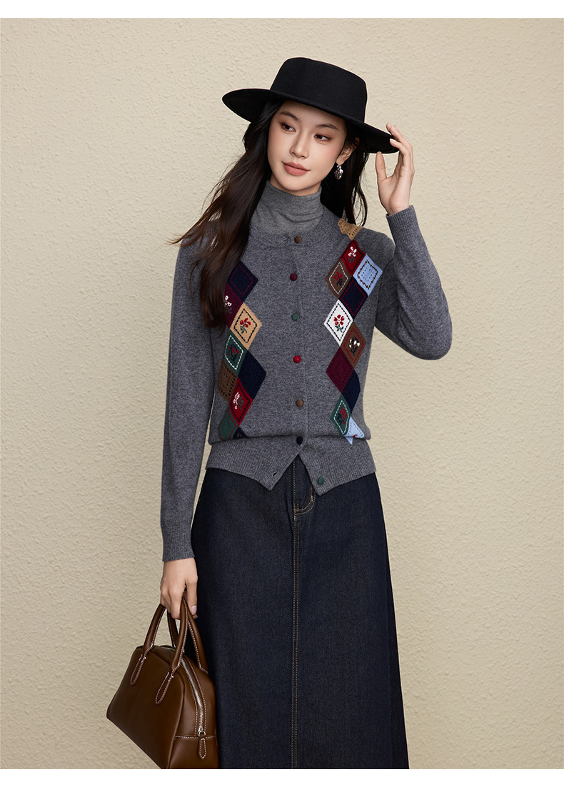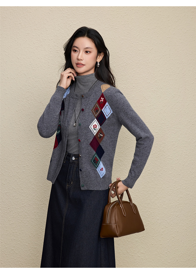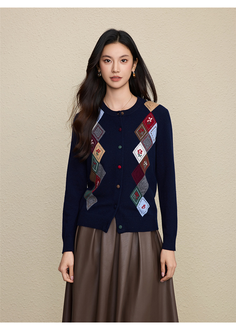 「自」全新升级【铂金会员367/天猫489/差价122】(03146)洛诗琳羊毛提花圆领开衫2025秋冬新品撞色菱形格纹针织外套