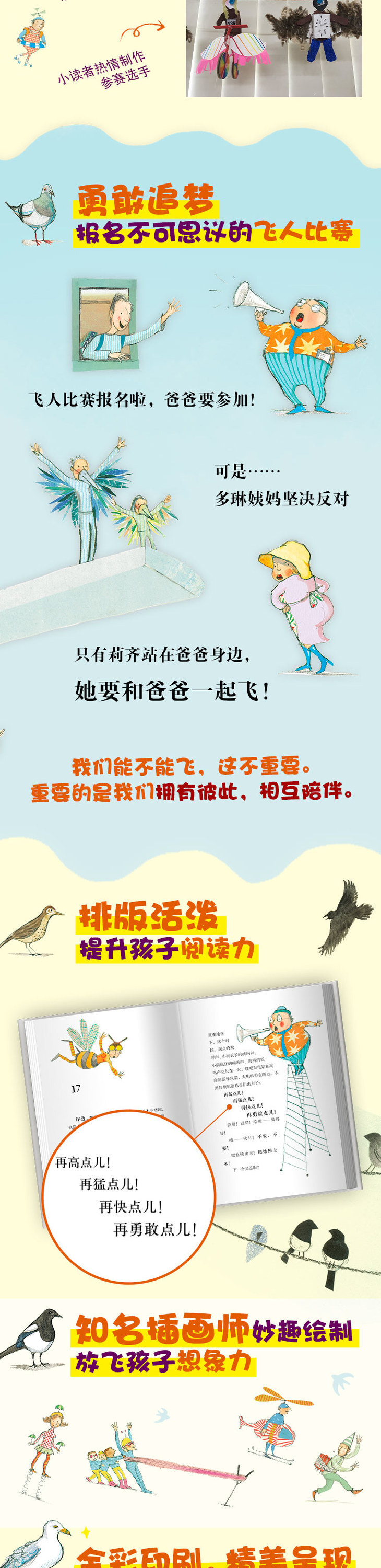 爸爸宣布要参加小镇的飞人比赛,飞过泰恩河,让女儿感到骄傲!他开始收集羽毛,学鸟叫,吃虫子,给自己做了翅膀、尖嘴和尾巴,准备和来自世界各地有着奇特装备的选手一较高下。
