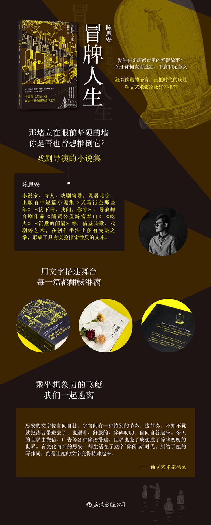作者陈思安兼具小说家、诗人、戏剧导演的多重身份,擅长将写实性与传奇性巧妙结合,抒写繁华都市中的荒诞人生。![]()