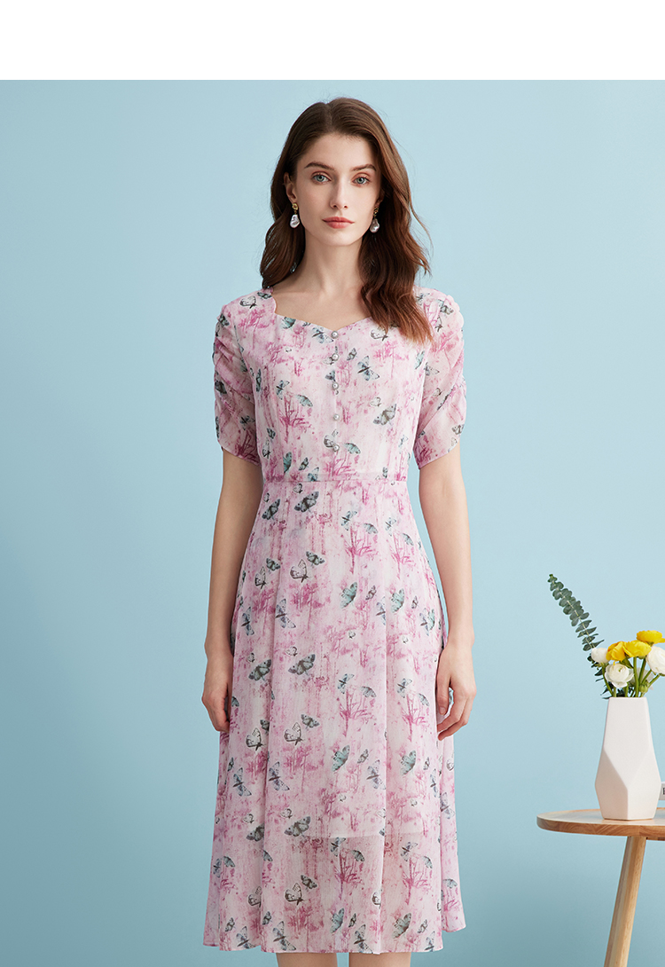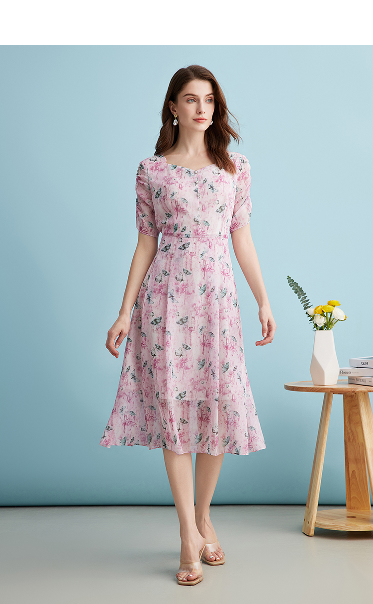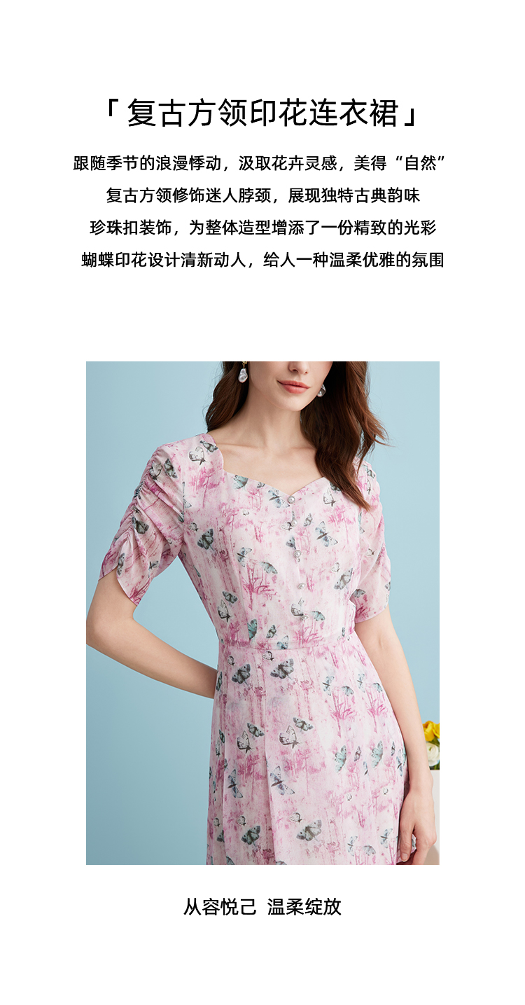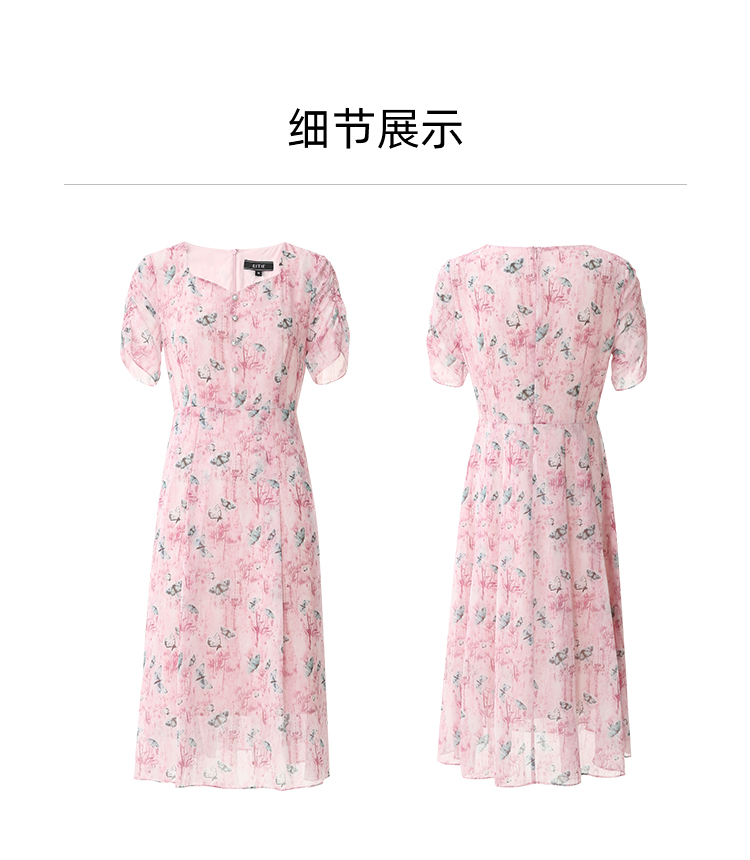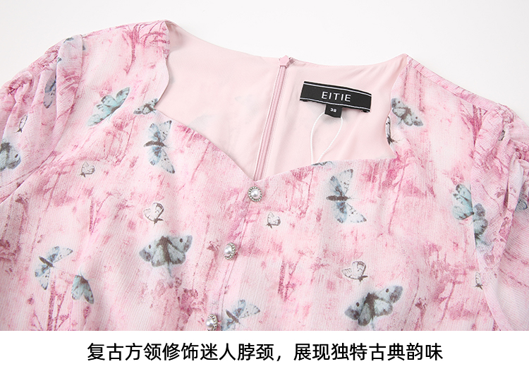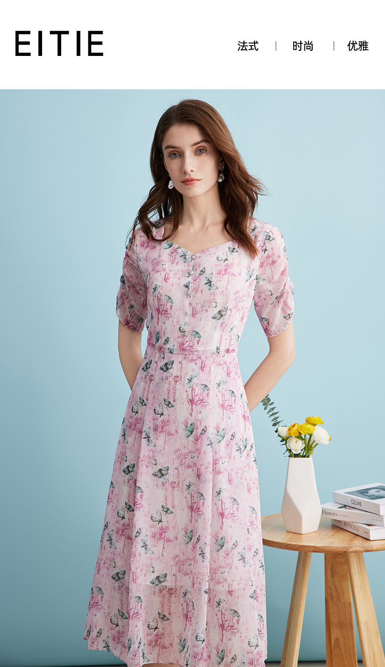 EITIE爱特爱气质鸡心领高腰显瘦通勤印花时尚a字连衣裙夏季新款B2407318