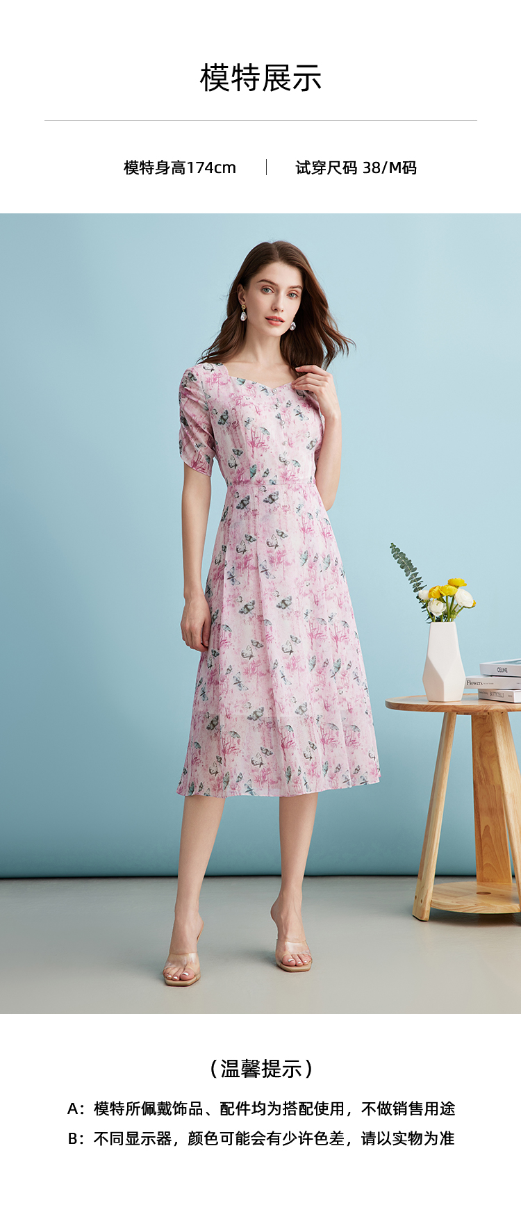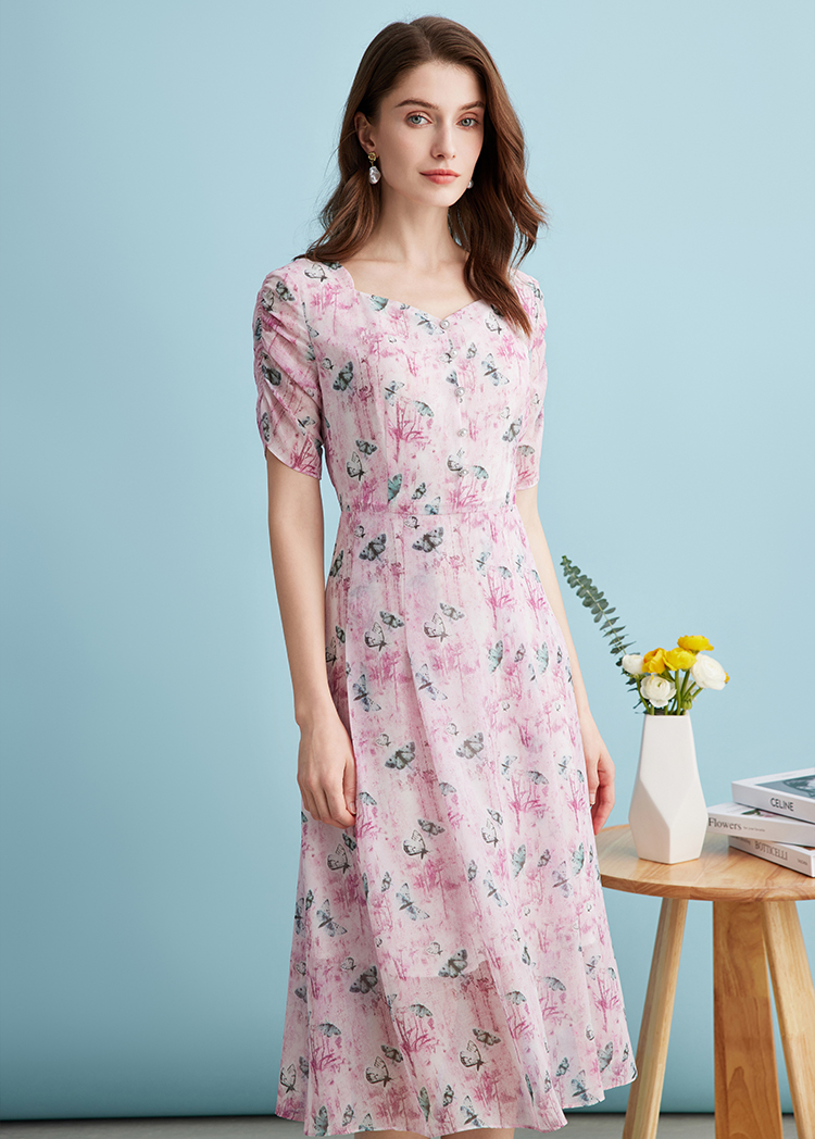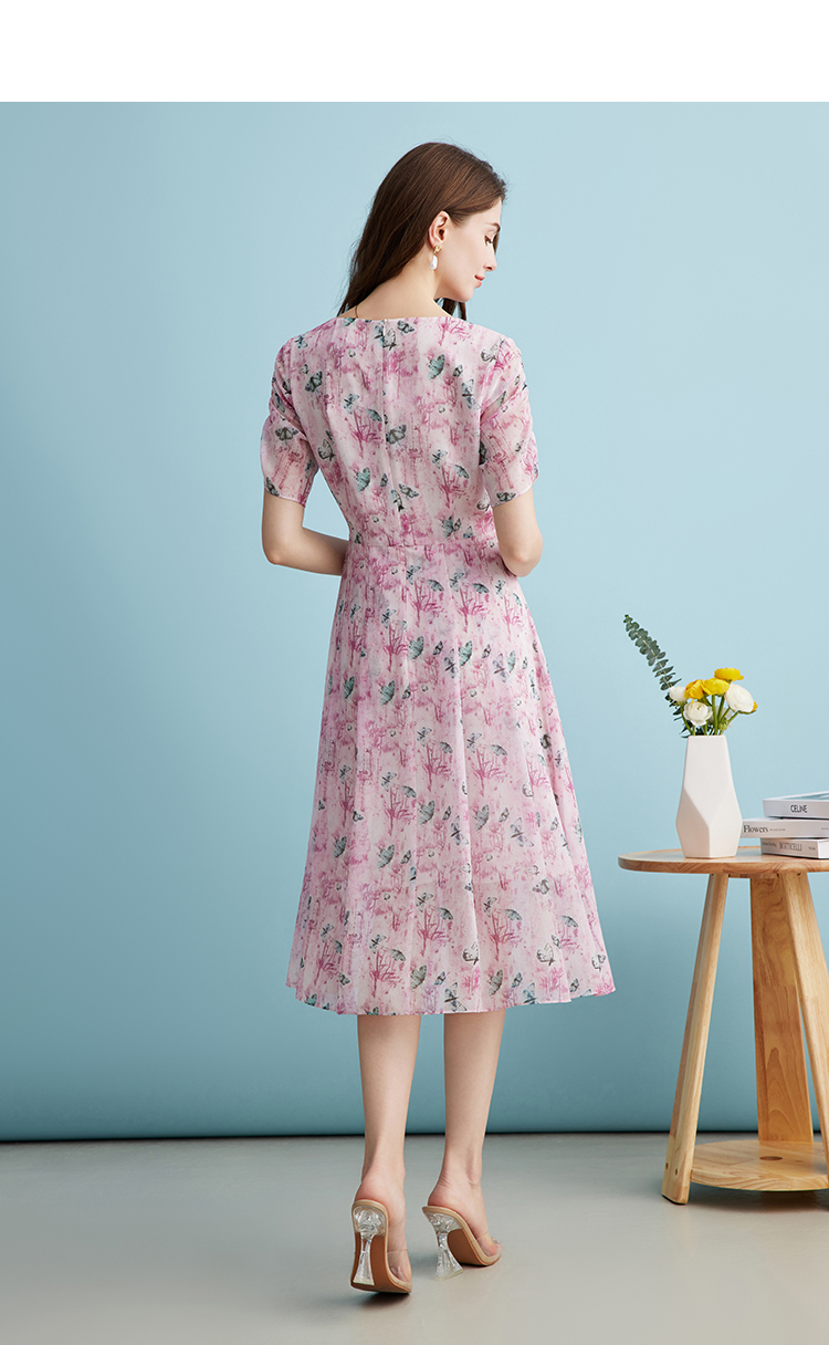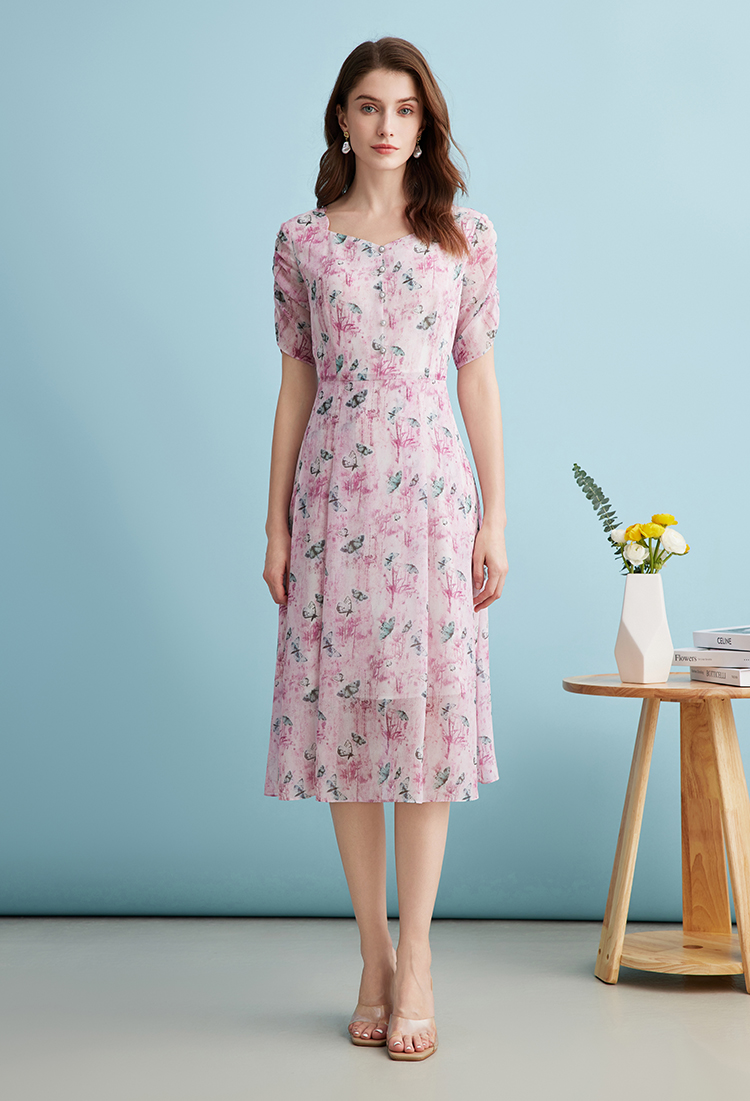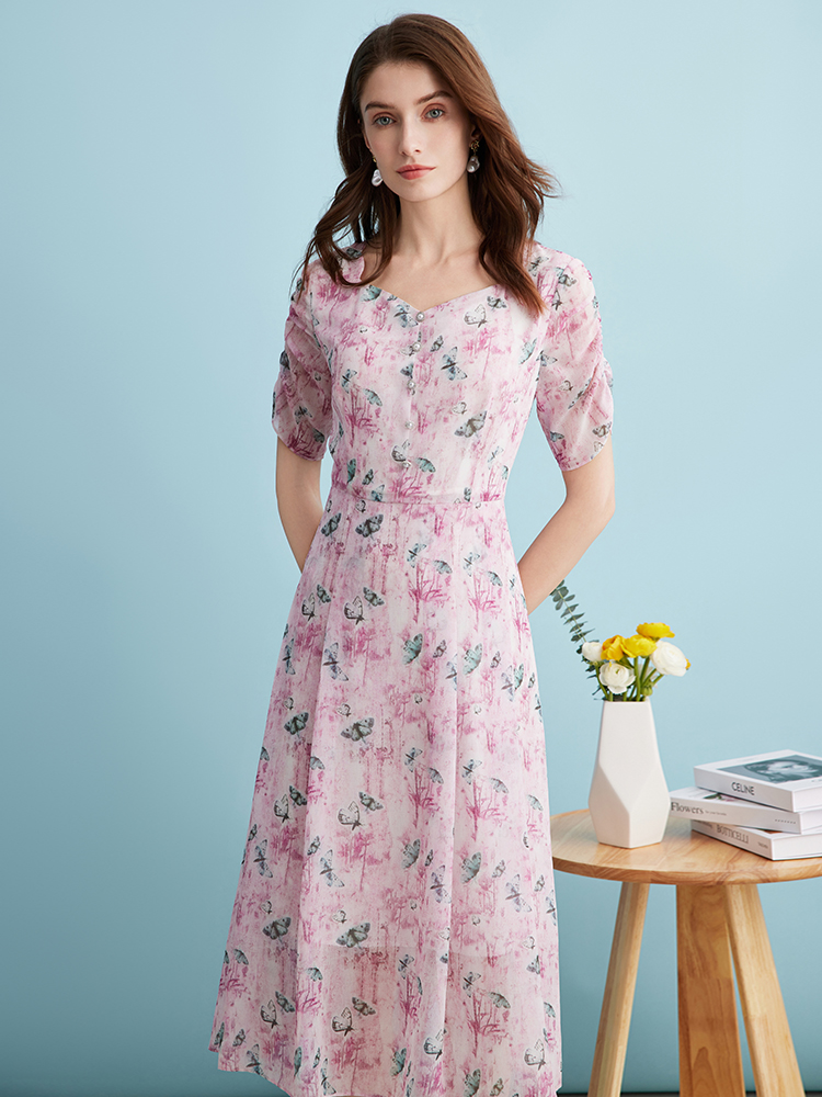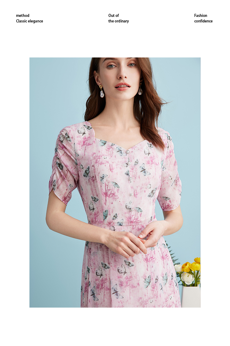 EITIE爱特爱气质鸡心领高腰显瘦通勤印花时尚a字连衣裙夏季新款B2407318