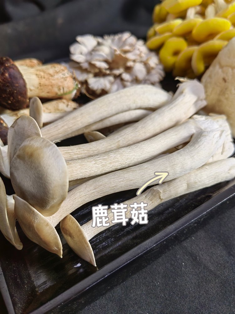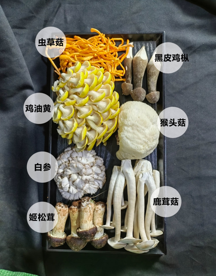 鸡油黄 虫草菇 猴头菇 鹿茸菇 姬松茸 黑皮鸡枞菌 白参菌等搭配6-7种菌菇(有些菌菇每天出菇量不稳定会有调动1-2个单品,重量不变)