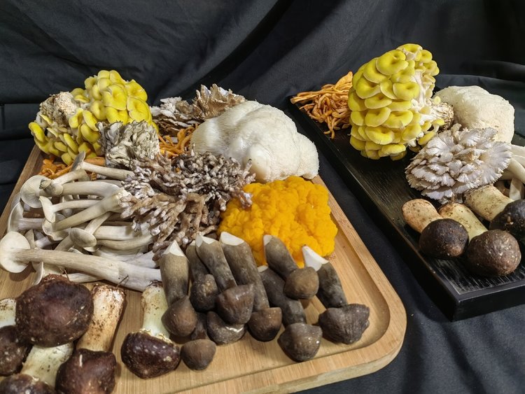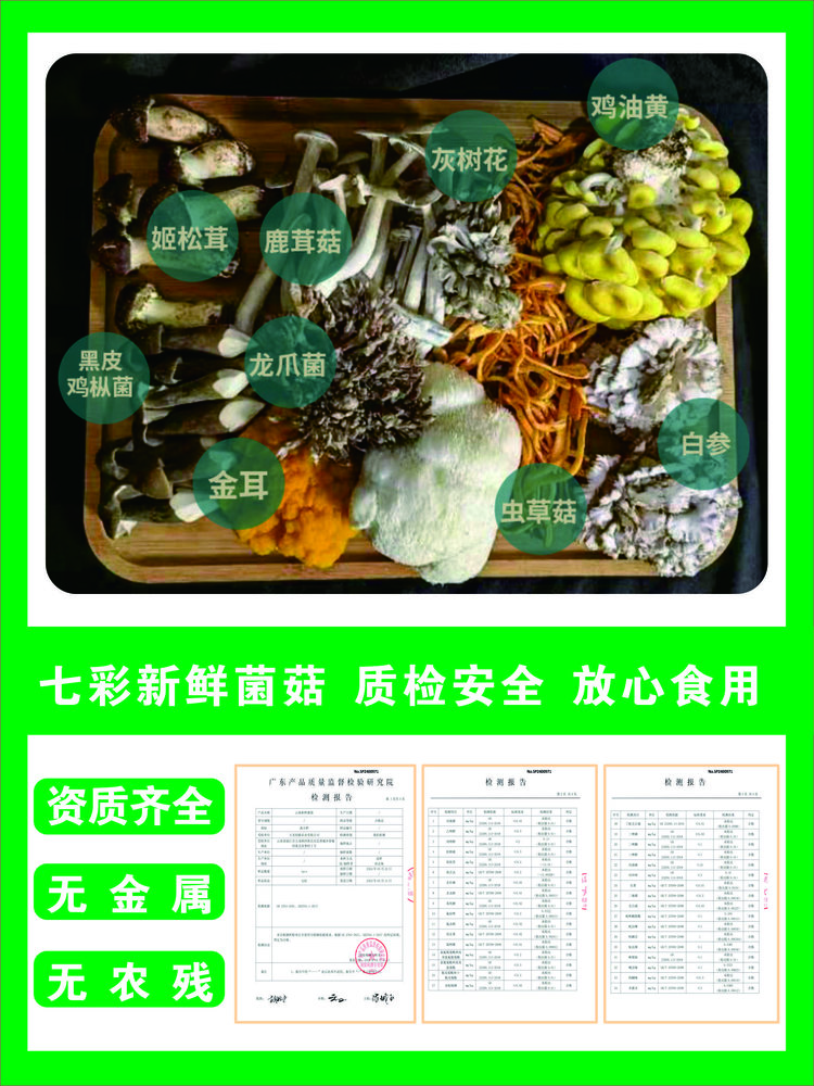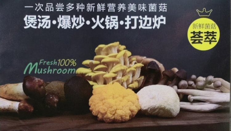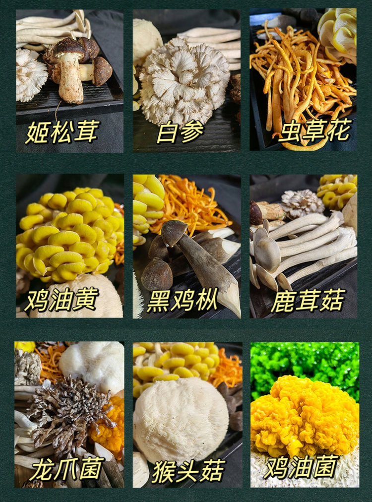 鸡油黄 虫草菇 猴头菇 金耳 鹿茸菇 姬松茸 黑皮鸡枞菌 白参菌 龙爪菌 灰树花等搭配9-10种菌菇(有些菌菇每天出菇量不稳定会有调动1-2个单品,重量不变)