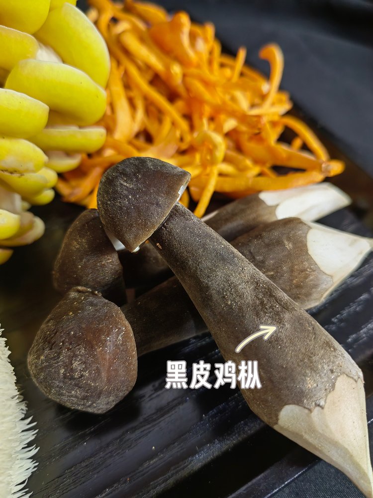 黑皮鸡枞菌,是属担子亚门菌,层菌纲,伞菌目,白蘑科,又名长根菇。该菌具有食用和药用价值,也是中国传统的药用真菌之一。因其鲜嫩醇香,肉质细嫩、洁白如玉、口感独特、生熟皆可食、食药两用、营养丰富。