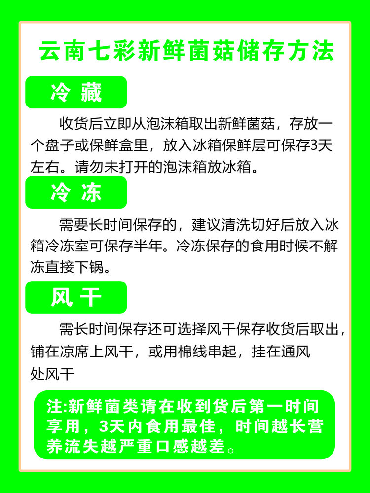 菌菇收到后立即打开箱子放进冰箱0-5度保鲜层,可保存3-5天。若想长期保存可清洗干净并用厨房纸擦干,装保鲜袋放冰箱冷冻,可保存1个月。