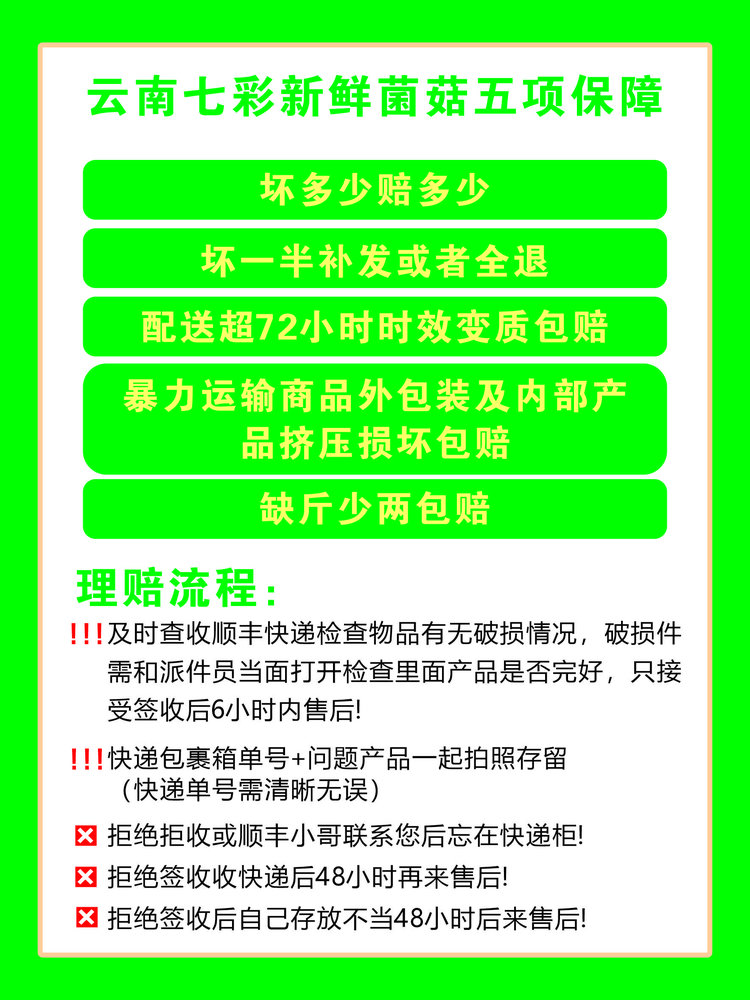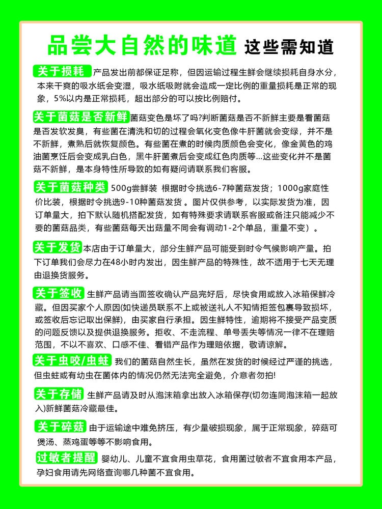 有些菌本身易碎,诸如鸡油菌,菇熟菌,姬松茸等….运输中颠策难免会有些碎渣或者脱盖,如不严重请理解菌子本身特性。
